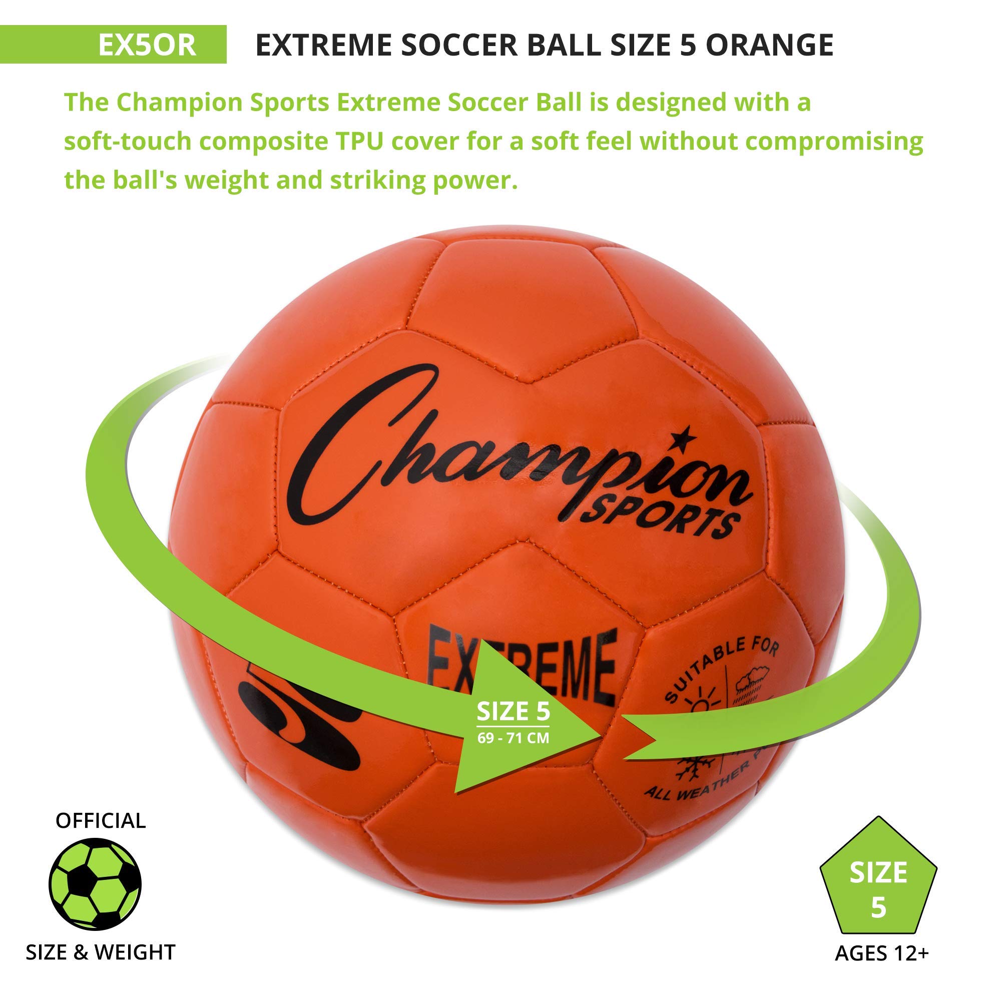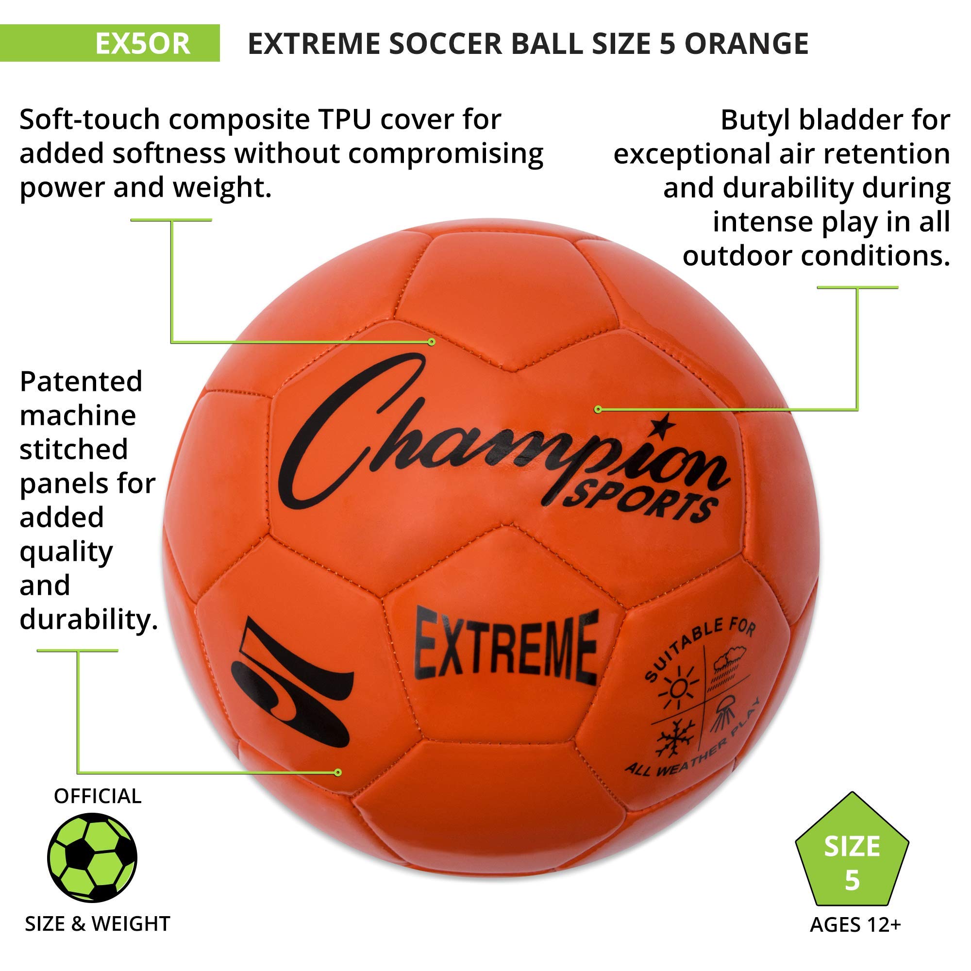 The Champion Sports Extreme Soccer Ball is a Durable, All-Weather Ball for Competition & Training. Built for both competitive matches and casual play, the Champion Sports Extreme Soccer Ball is designed to perform in any weather. Its soft-touch TPU cover provides a comfortable feel for dribbling, passing, and striking, while maintaining the weight and power needed for accurate shots. Engineered for durability, this high-quality soccer ball features a butyl bladder for superior air retention and machine-stitched panels for long-lasting performance. Whether you're playing in the heat, cold, wind, or rain, this ball maintains its shape and reliability. Available in three sizes: EX3 (Size 3): Ages 8 & under, EX4 (Size 4): Ages 8 to 12, and EX5 (Size 5 – Official Size): Ages 12 & up. Choose from a variety of vibrant colors, including Red, Orange, Yellow, Green, Blue, Purple, Black, Silver, and Pink. Note: Ball ships deflated. Pump sold separately.