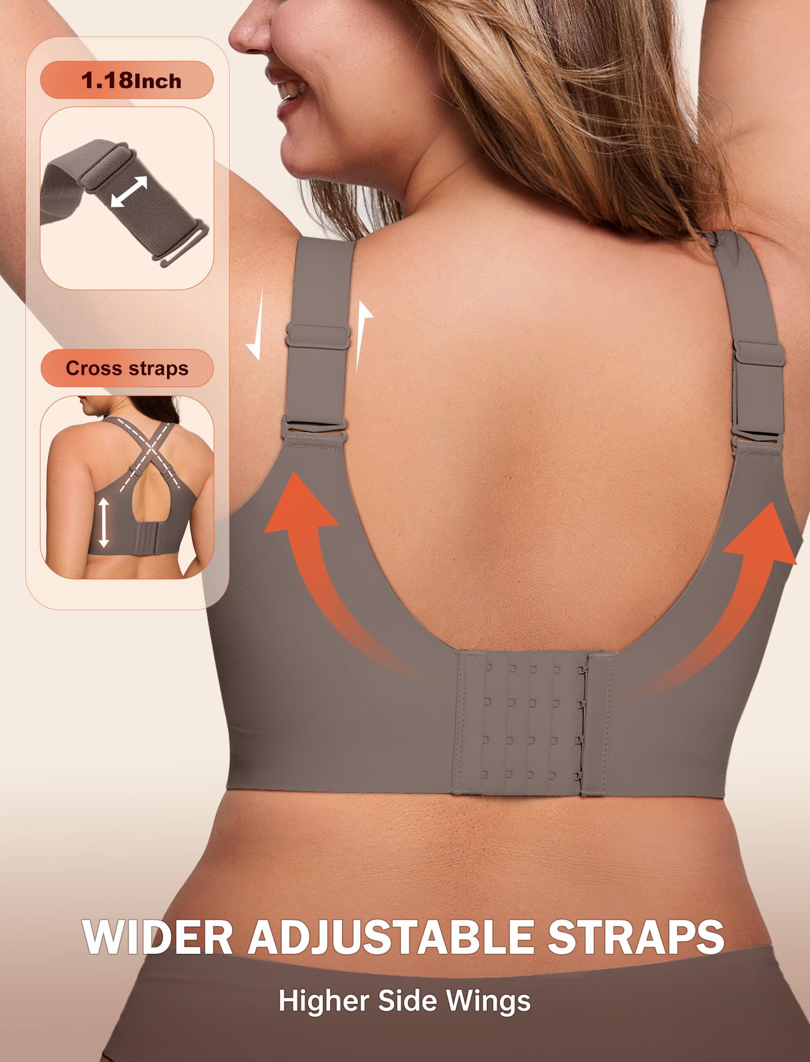 【Back Smoothing Bras & Wider Hooks】The back features precision glue-point technology for superior comfort, with a contoured wave-shaped inner layer that hugs your curves flawlessly. This sleek design not only enhances aesthetics but also smooths and conceals back bulges for a perfectly streamlined silhouette. The bras for women no underwire features 5 rows of 4 buckles and a free extender for a customizable fit.