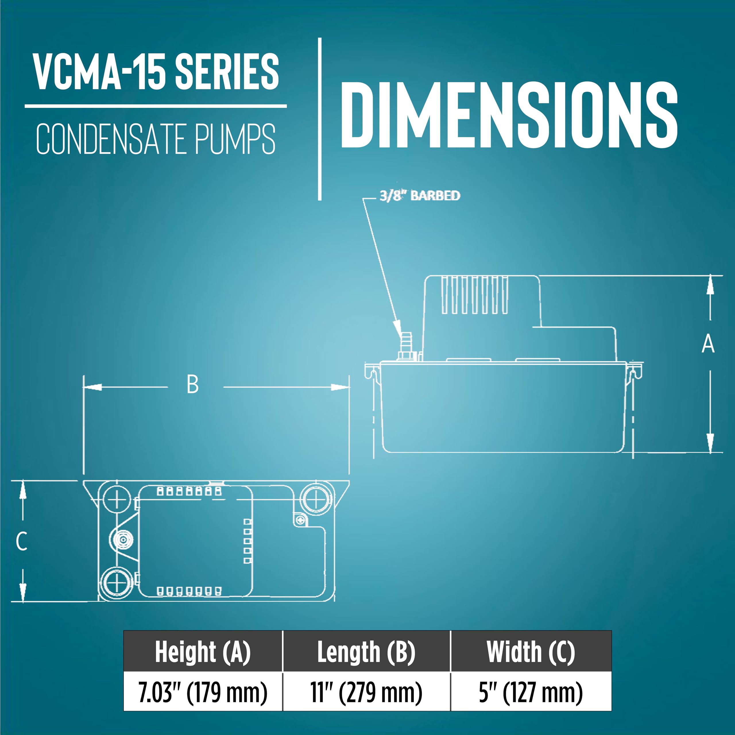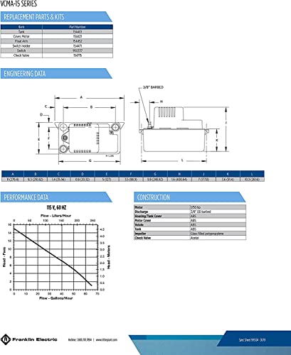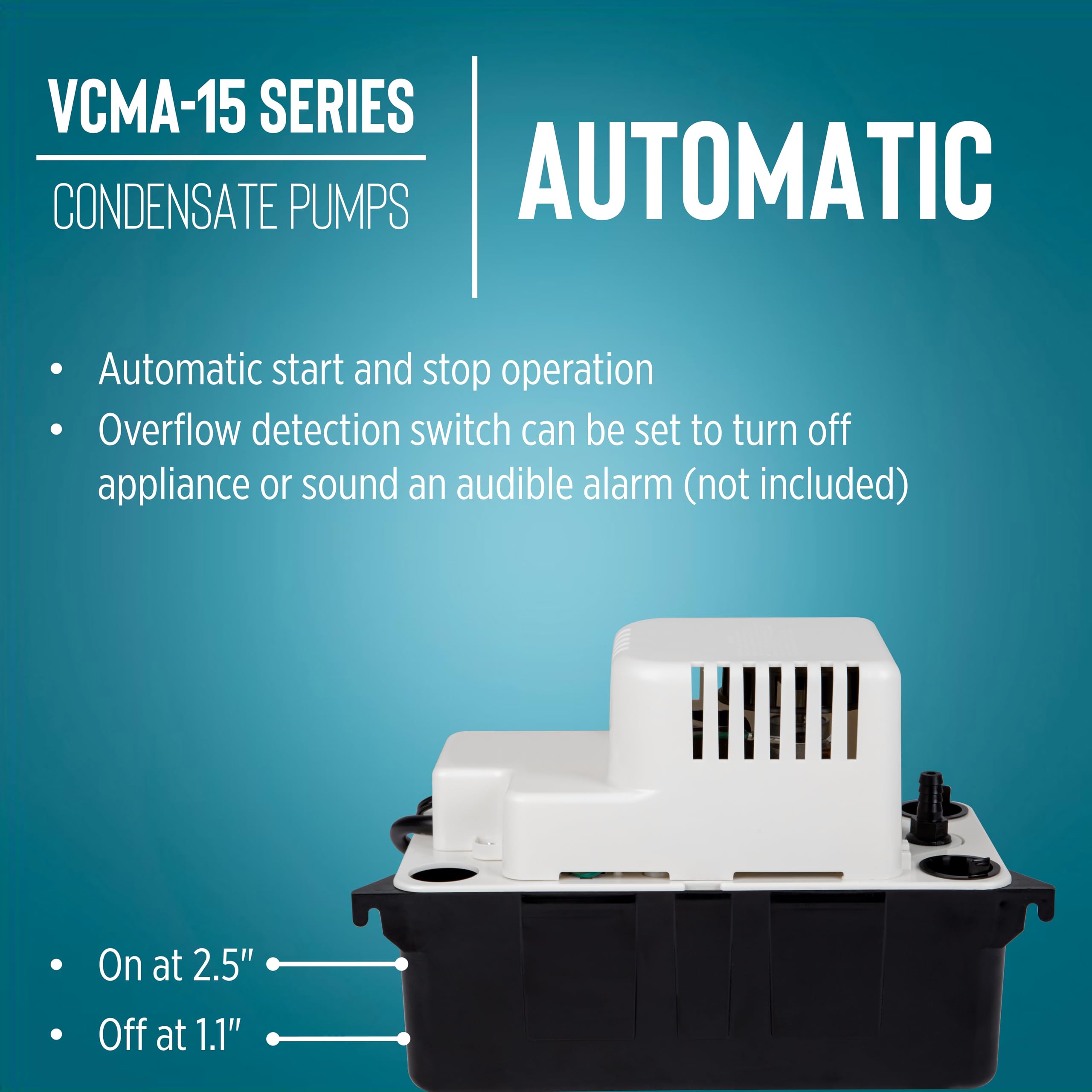 Product Description The Little Giant VCMA-15ULST condensate removal pump is a 1/50 hp pump that is designed for collecting, detecting, and removing condensation from air conditioners, dehumidifiers and refrigeration equipment. Its robust design is also suitable for high-efficiency gas furnace condensation and condensing boilers. This unit includes a 1/2-gallon condensate holding tank, a built-in check valve, 6' power cord with plug, and an overflow detection switch. The overflow detection switch can be set to automatically shut the equipment off or be set to activate an audible or visual alarm (alarm not included); basic wiring knowledge is required. This model also comes with 20' of 3/8" ID vinyl tubing. The high-performance 115-volt motor is equipped with thermal overload protection and is CSA certified to US and Canadian standards. FEATURES & BENEFITS: - 1/50 hp high-performance motor pumps 65 gallons of water per hour - ABS tank, motor cover, and volute - Stainless steel motor shaft - 1/2-gallon tank capacity - Overflow detection switch included - 20' of 3/8" ID vinyl tubing included INSTALLATION TIPS: - This pump comes shipped with a cardboard insert marked "REMOVE". Please remove and discard this insert before operating pump. Failure to remove the insert will cause the pump to overflow. - Check the tubing for obstructions or kinks. Clean or replace the tubing, if necessary. This is an authentic Little Giant product. The Little Giant brand is owned by Franklin Electric Co., Inc. From the Manufacturer Little Giant VCMA Series is ideal for collecting, detecting, and the automatic removal of condensate from air conditioning equipment, de-humidifiers, high efficiency furnaces, condensing boilers, and other equipment where an automatic drain pump is required. of-the-art in pump design. The VCMA-15ULST includes a safety switch 20-feet of tubing and a 6-foot power cord.
