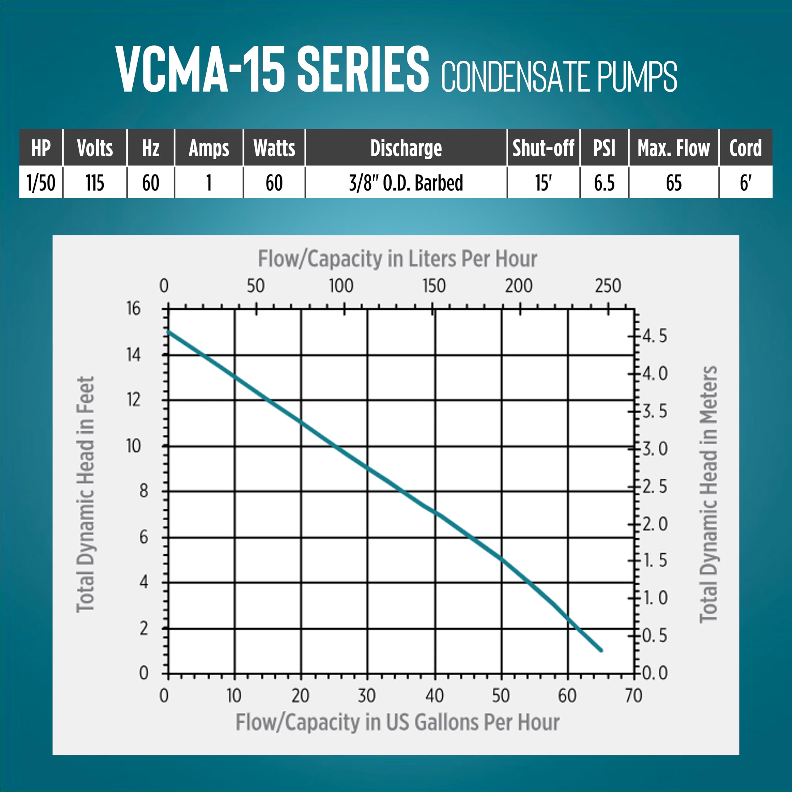 SPECIFICATIONS: 1/50 HP; 115 Volts, 1 Amp, 60 Watts, 3/8" OD barbed discharge, 65 GPH at 1' lift, 15' shut-off, maximum 6.5 PSI, 3 inlet drain holes, 6-foot cord; maximum water temperature: 140° F
