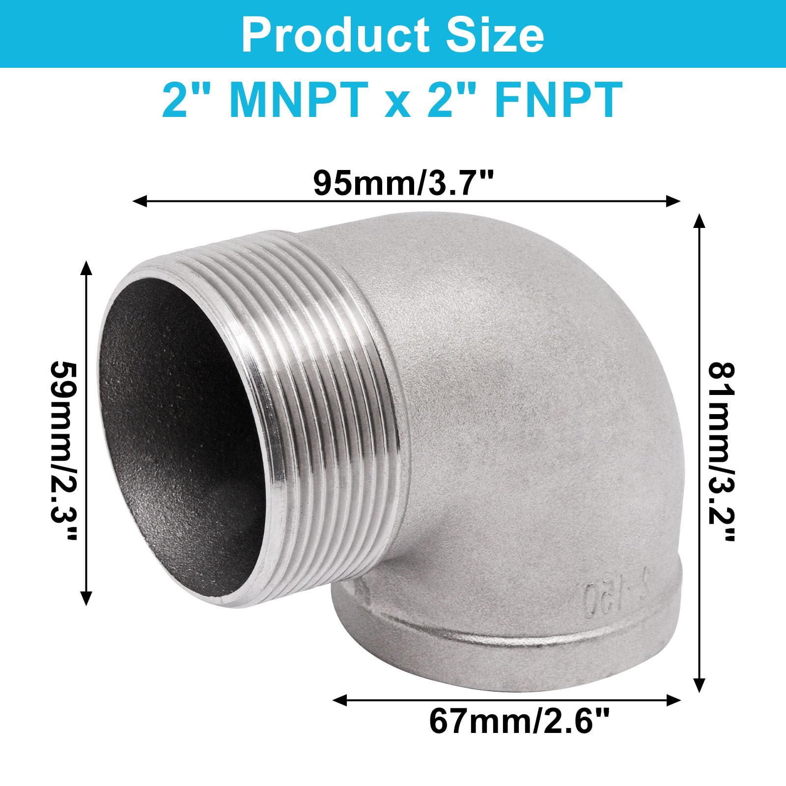 Package Content: 1 Pcs 2" NPT male to 2" NPT female thread 90 degree elbow. This elbow fitting for connecting pipes or fittings with different end types. (NOTE: NPT thread size does not actual diameter, it is only nominal pipe size)