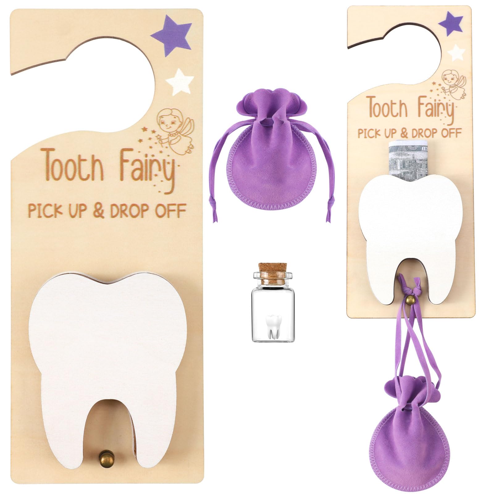 Durable Material Construction: this tooth fairy door hanger is made from wood material, offering durability and strength; The bag is crafted from burlap, offering an exquisite feel while ensuring the safe storage of your child's precious teeth; The bottle is made from glass and features a wooden cork, contributing to the set's overall classic design