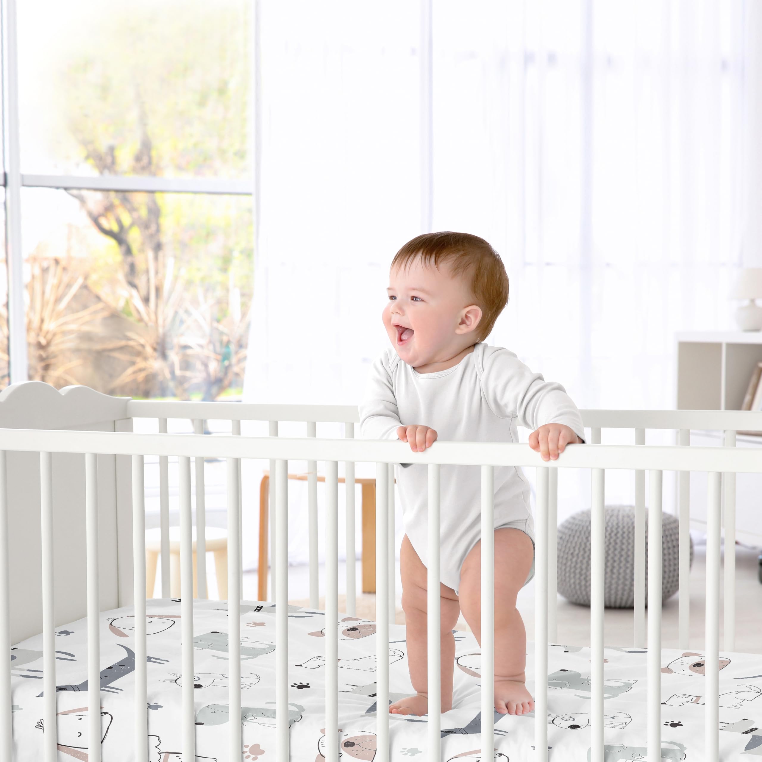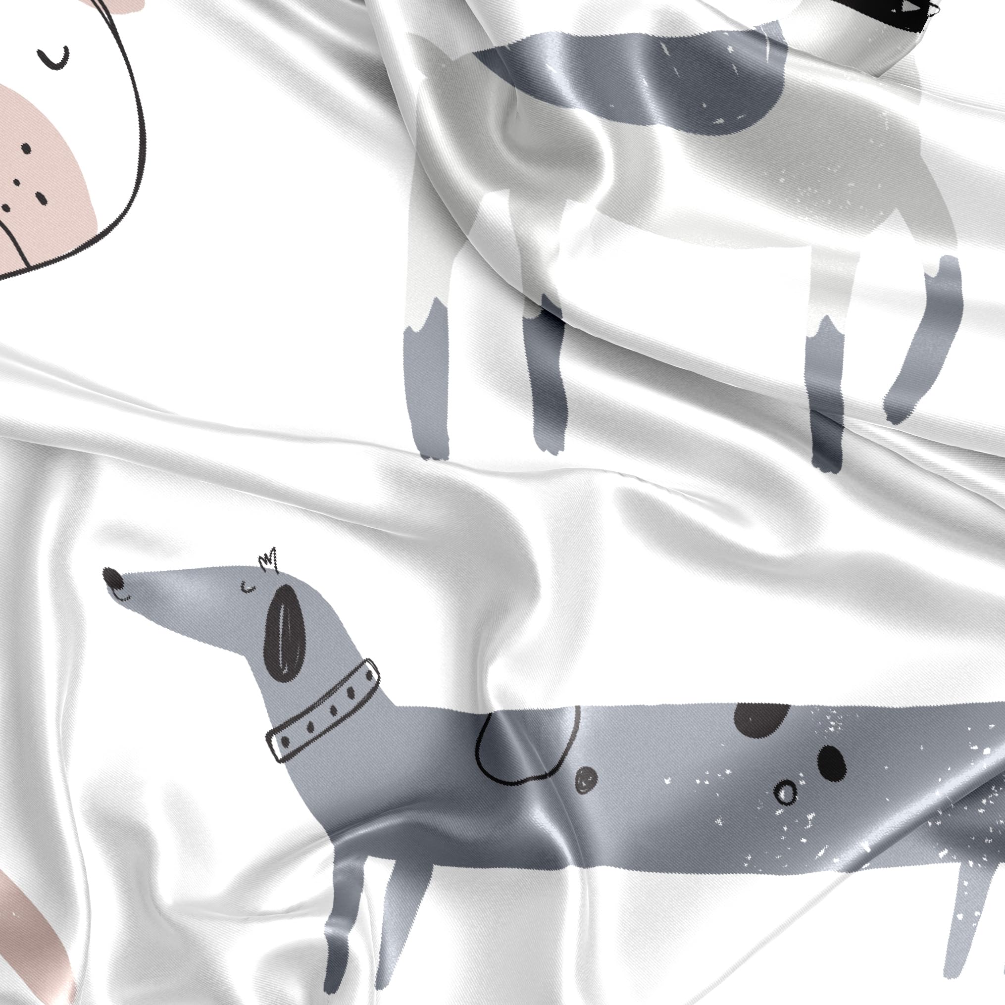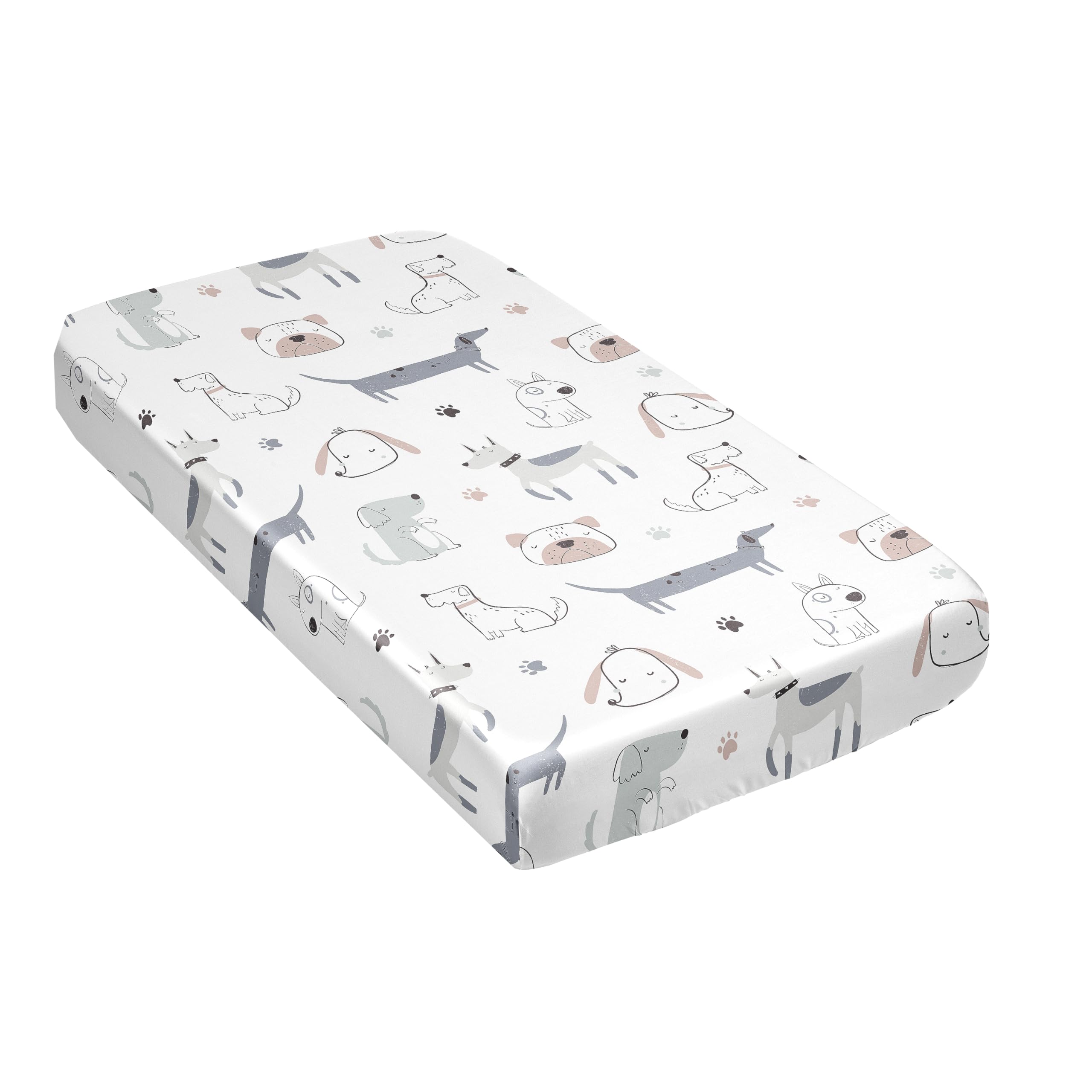 This satin crib fitted sheet features an exclusive design of a grey taupe and blue modern watercolor puppy bulldog wiener doggy pet puppies dog and paw print.