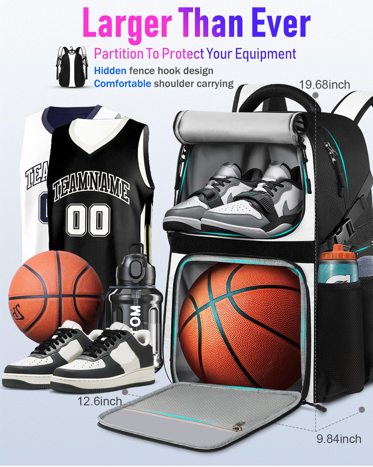 More Space Than Ever Before: LOINTET basketball bag backpack can easily carry your basketball equipment. Equipped with 11 storage compartments basketball backpack: 1 special compartment for your basketball, 1 main compartment for your clothes, 1 breathable compartment for your basketball shoes, 4 side mesh pockets for your water bottle, towel, first aid tools, air pump and other equipment. Additional 4 hidden zipper pockets can store your phone, headphones and other valuables