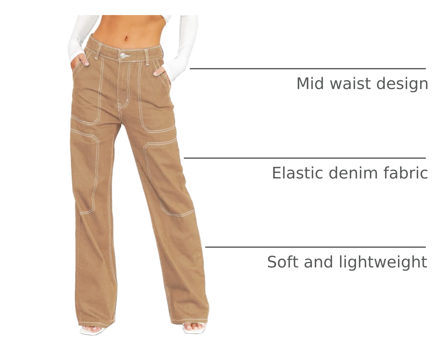 Feature: cargo jeans, mid waist, straight-leg jeans, button and zipper fly closure, straight wide leg style, four pockets, denim jeans for women.