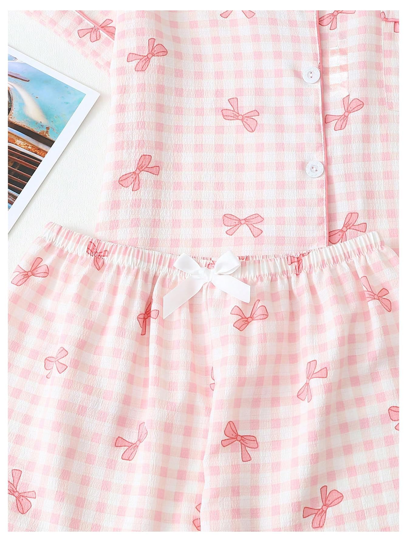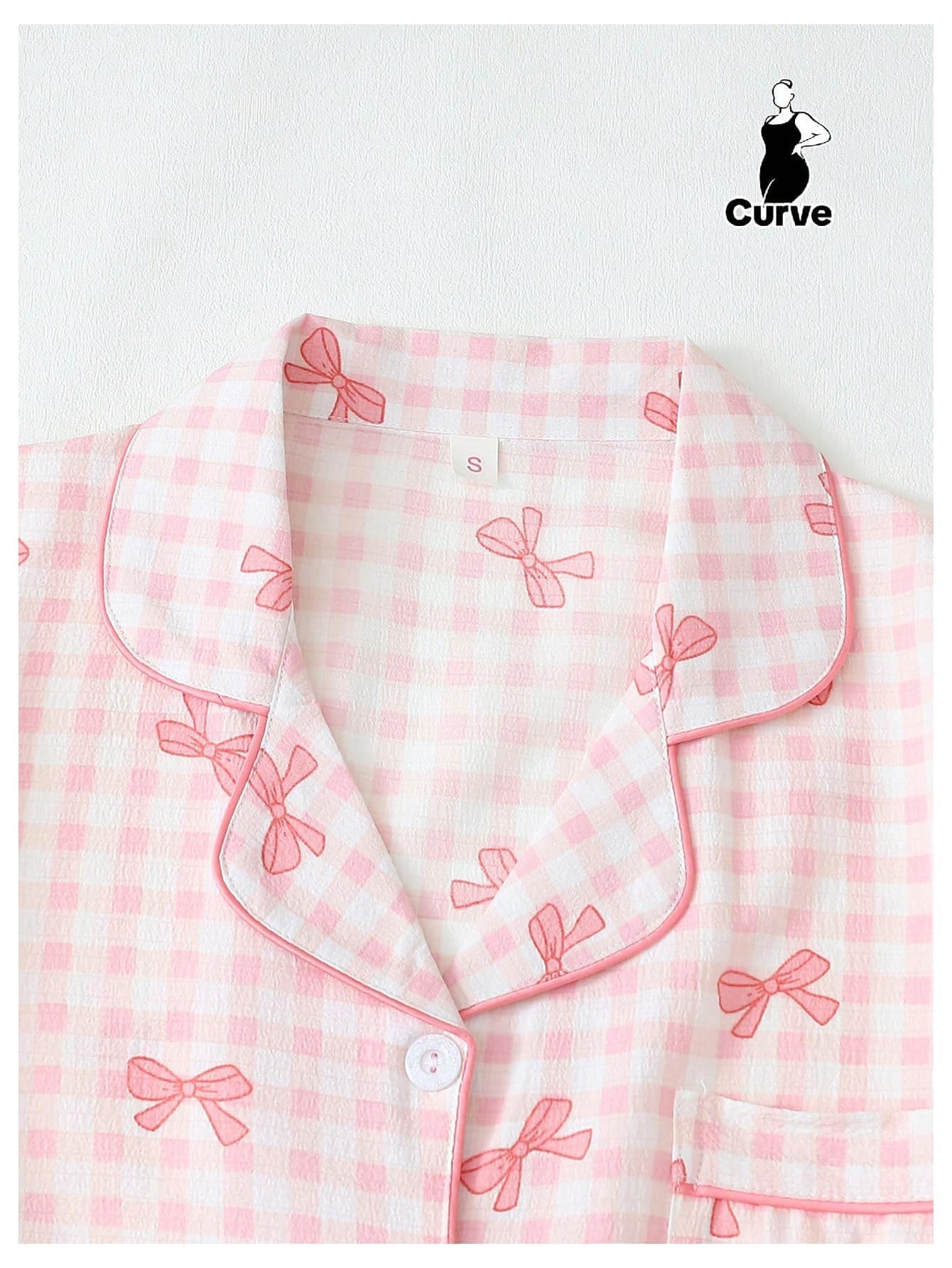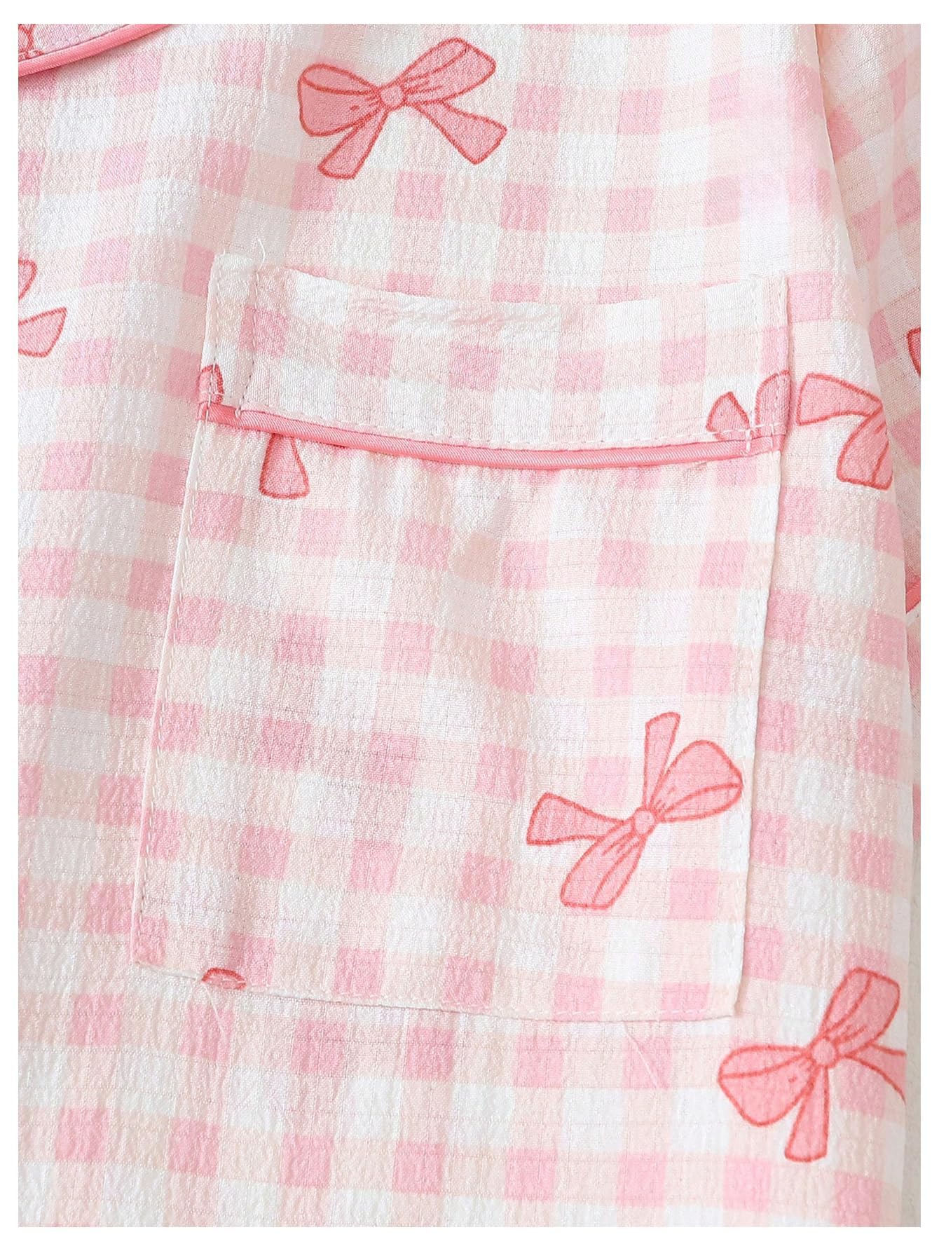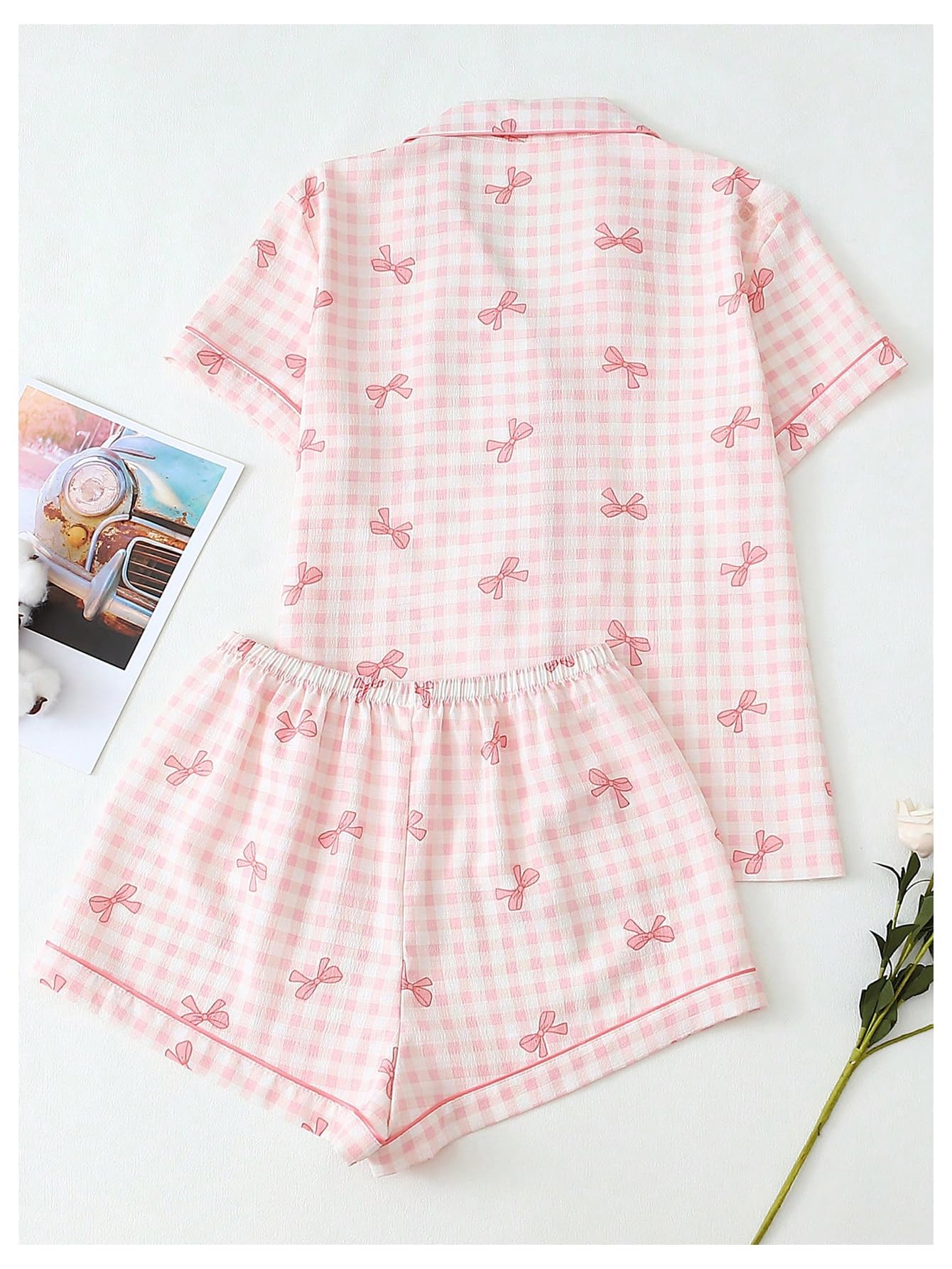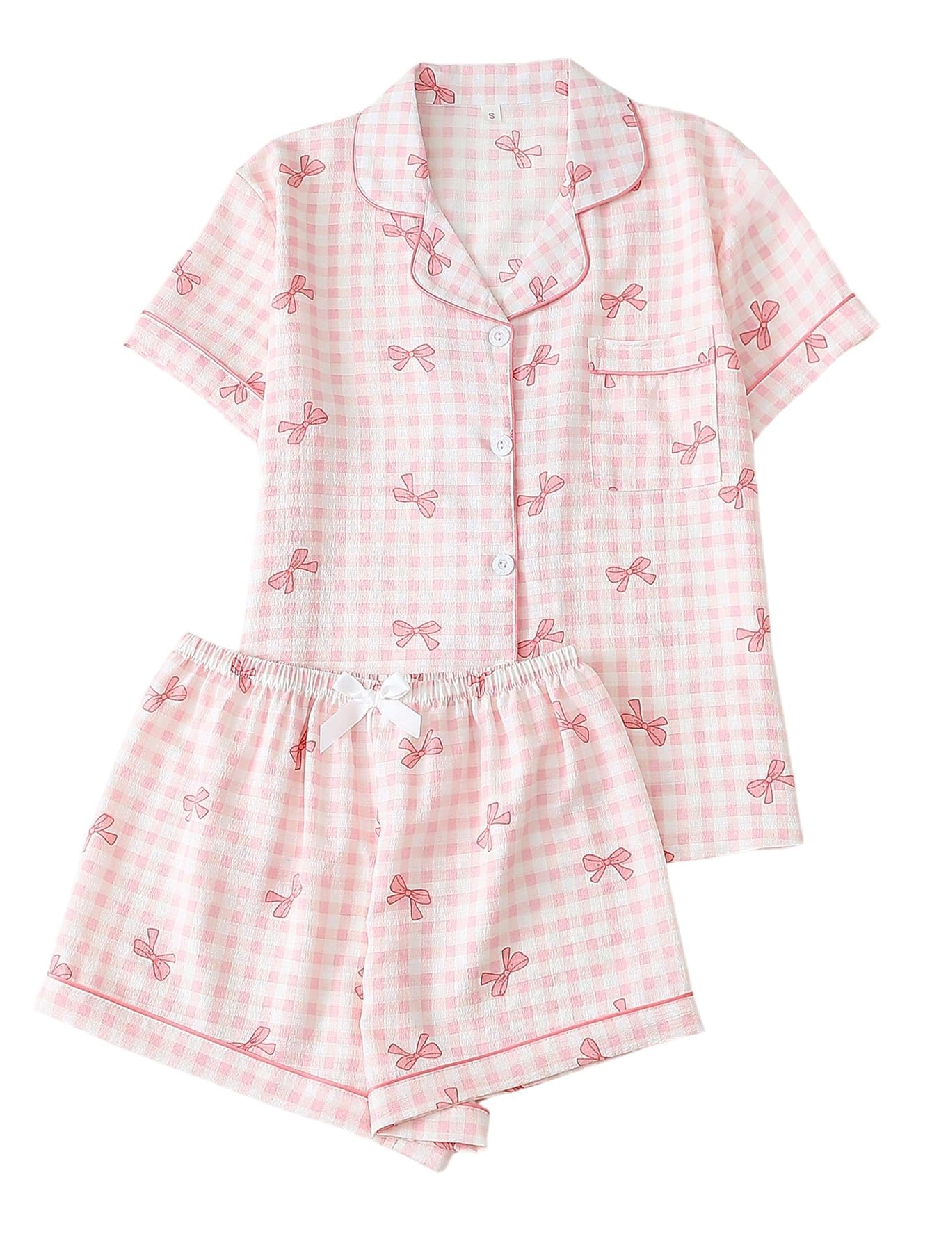 Lapel Collar, Short Sleeve, Print Pajamas, Bow Decoration, Button Down Top and Shorts, Loungewear Sets, Women's Sleepwear.
