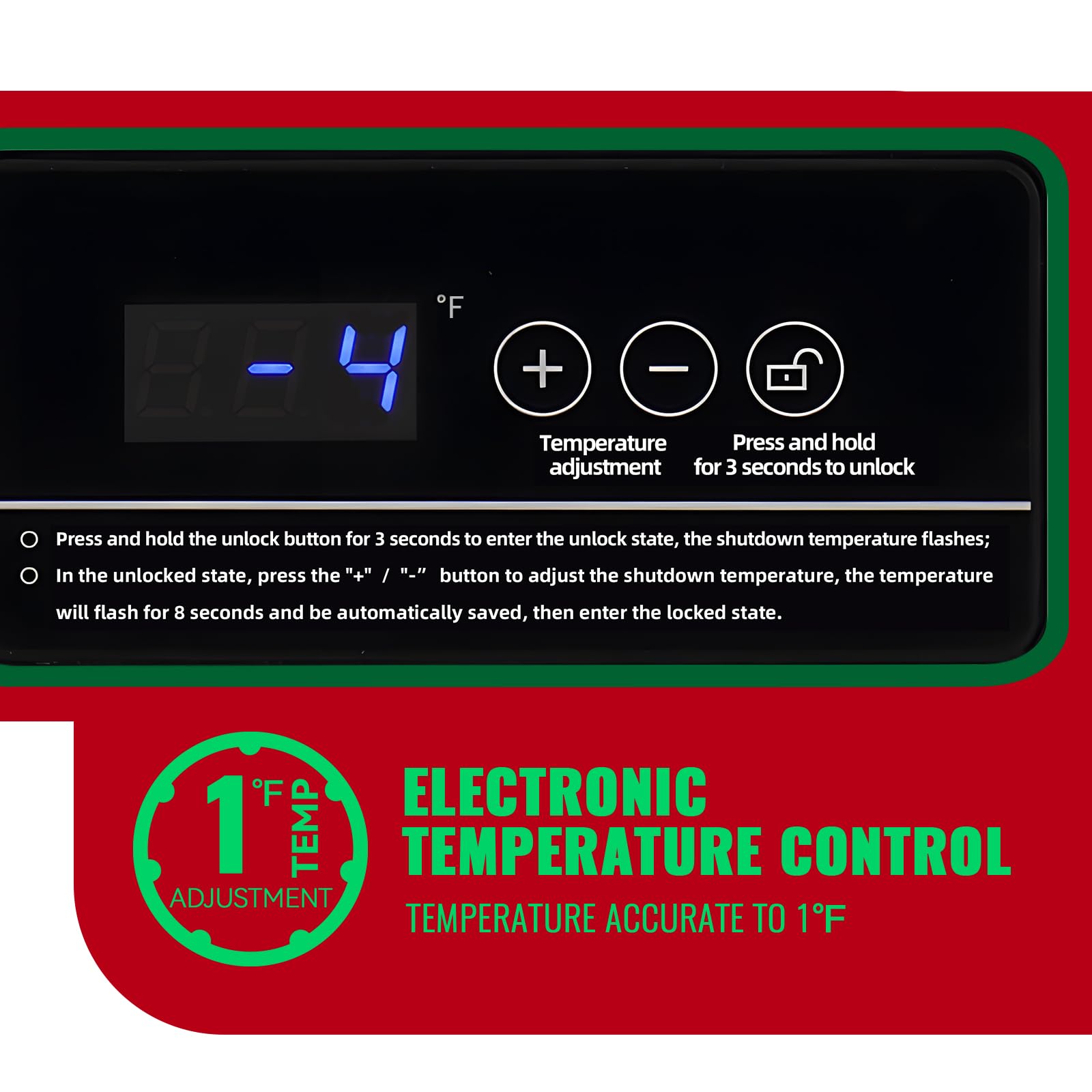 Customize Your Temperature Setting: Easily adaptable with electronic control, intelligent digital display that can achieve precise temperature control to 1°F. It allows you to set the internal temperature of the freezer. Temperatures range from -15°F and 41°F, so you can find the perfect temperature for your meat, seafood and ice cream