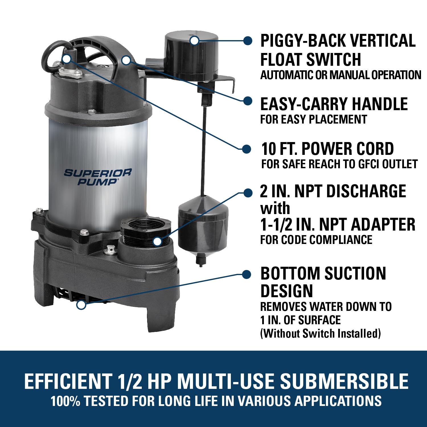 2-inch discharge for high capacity pumping; Handles up to 1/2 inch solids; cULus Listed, CSA Certified