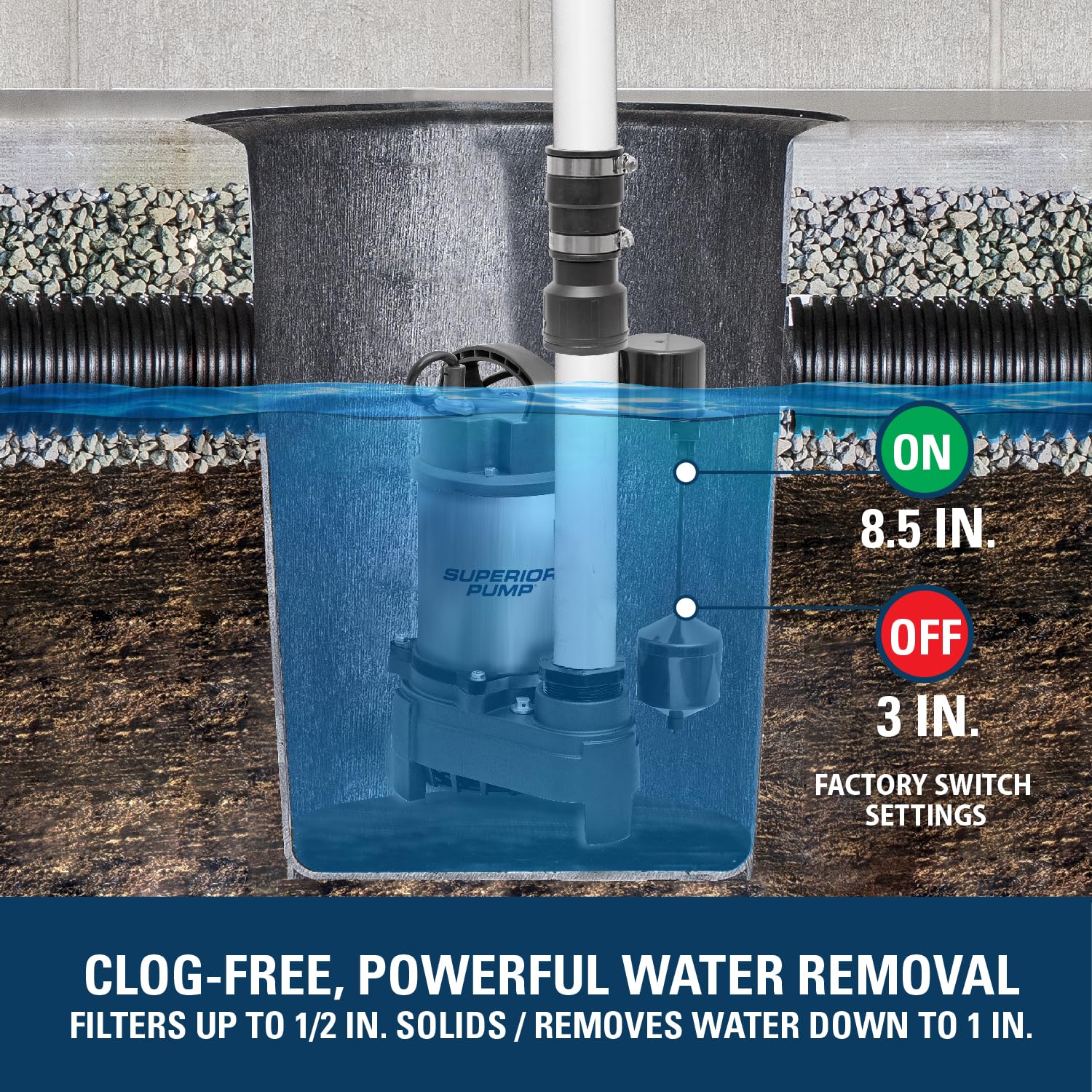 1/2 HP Sump pump moves up to 4500-gallons per hour; pumps water up to 25-vertical feet