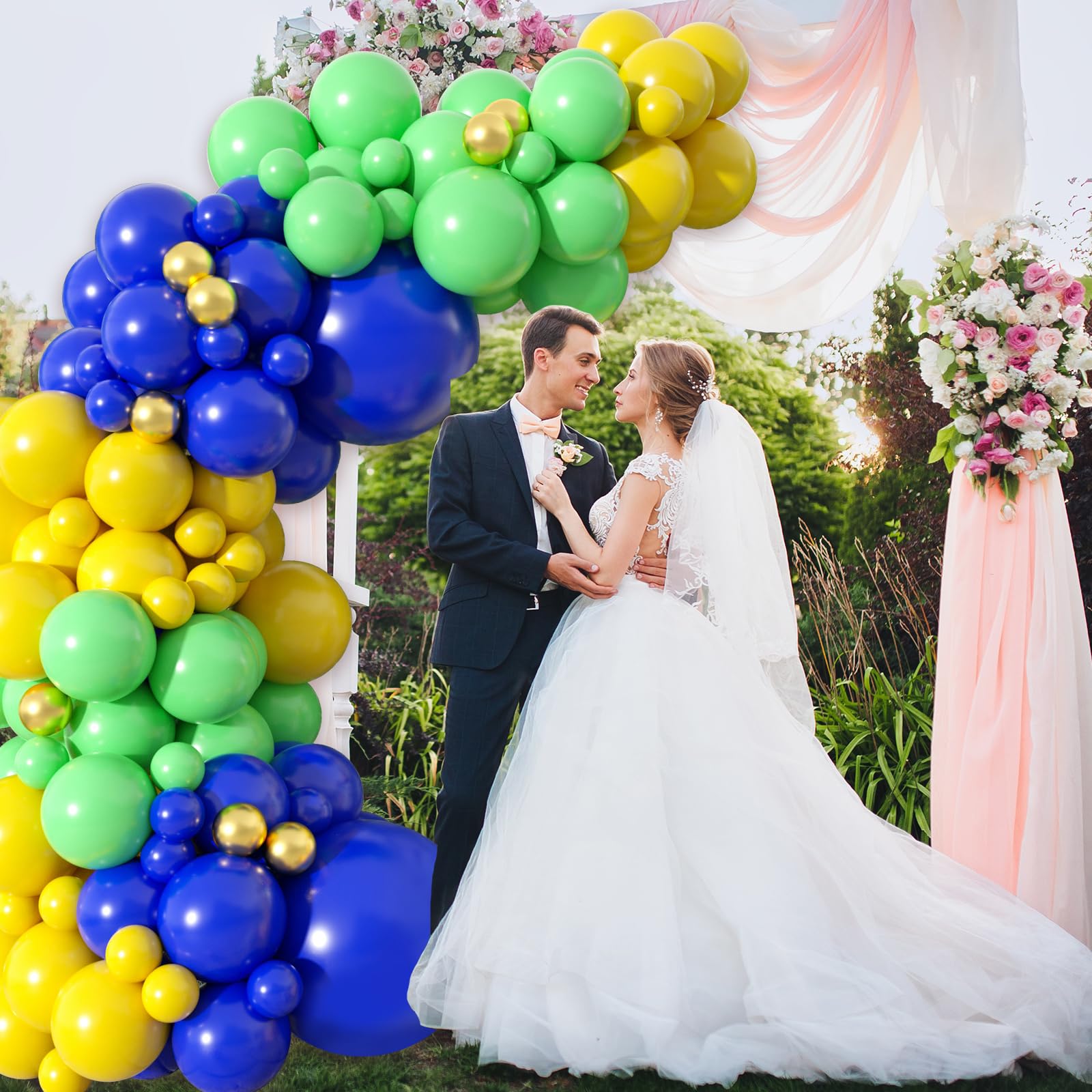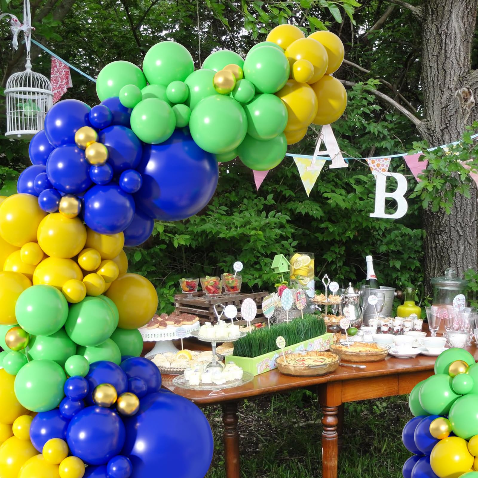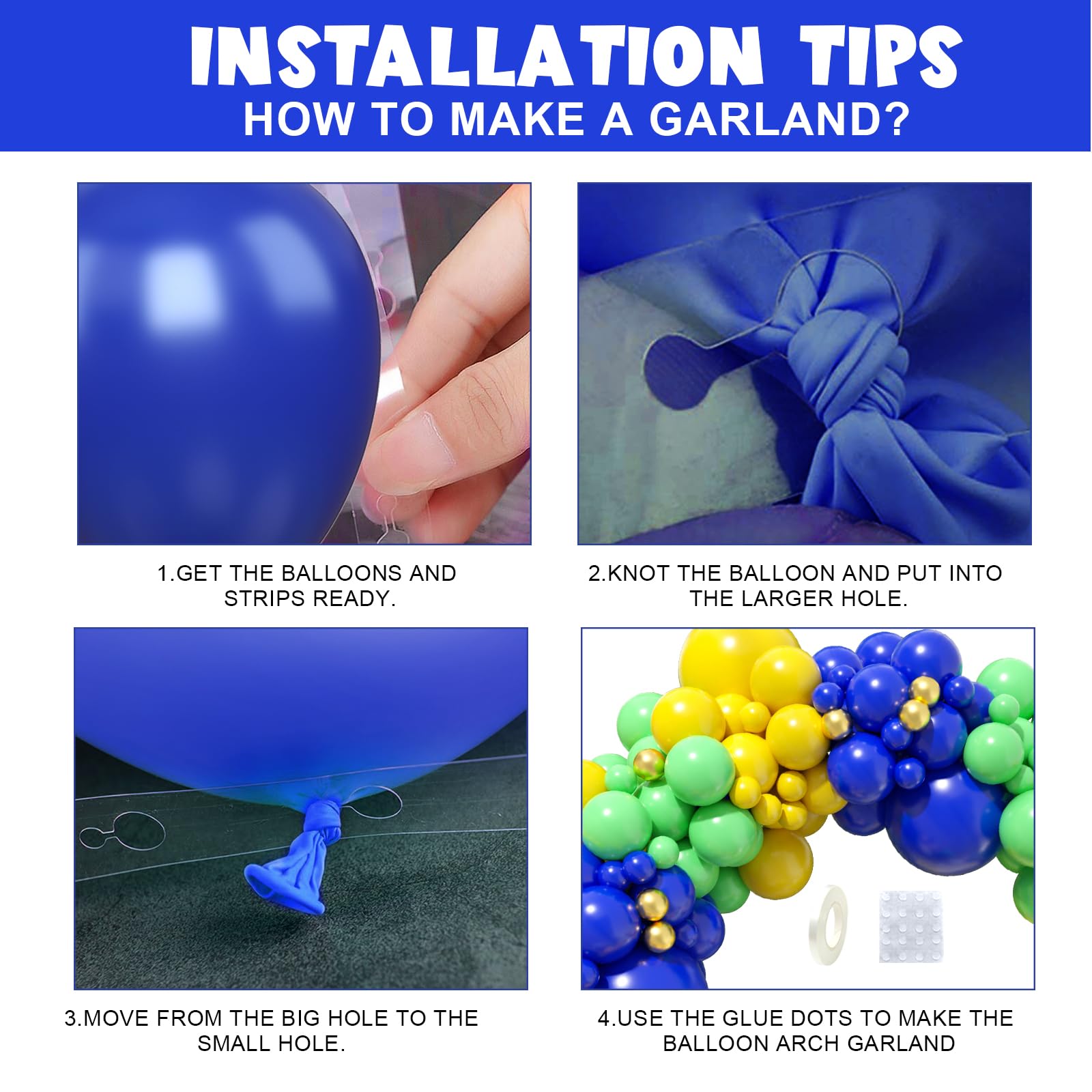 【Blue Green Balloon Garland Kit】 The blue green balloons arch kit included royal blue, light green, yellow, metallic gold balloons for size of 5, 10, 12, 18 inches. Equipped with 1 white ribbon, 1 roll balloon chains, 2pcs dispensing adhesive. With this balloon garland kit, you can create the good balloon garland for any event.
