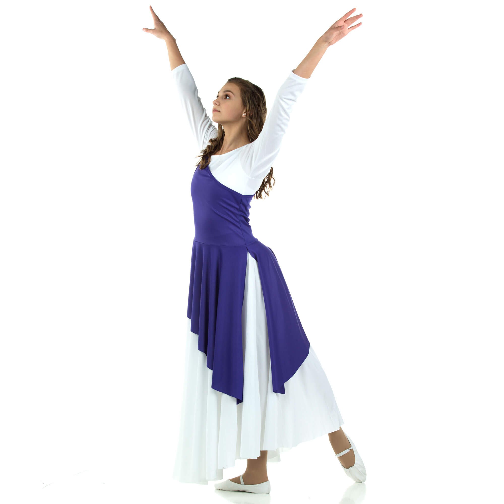 Dance Overlays for Worship Women Design Features: The unique asymmetrical design makes this praise dance tunic perfect for any praise dance dress for a layered look or to add different colors to an outfit. The side slit design not only facilitates your dance moves and allows your legs to move freely, but also adds to the overall dexterity and layering.