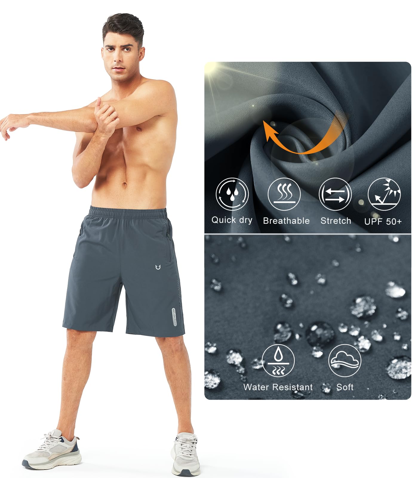 Lightweight & Breathability: Men's athletic hiking Shorts are made quality 4-Way Stretch/breathable and quick-drying fabric helps to wick away moisture and dry quickly keep you cool A synthetic of polyester and spandex can be very durable, abrasion-resistant, and stretchy enough to allow for better mobility