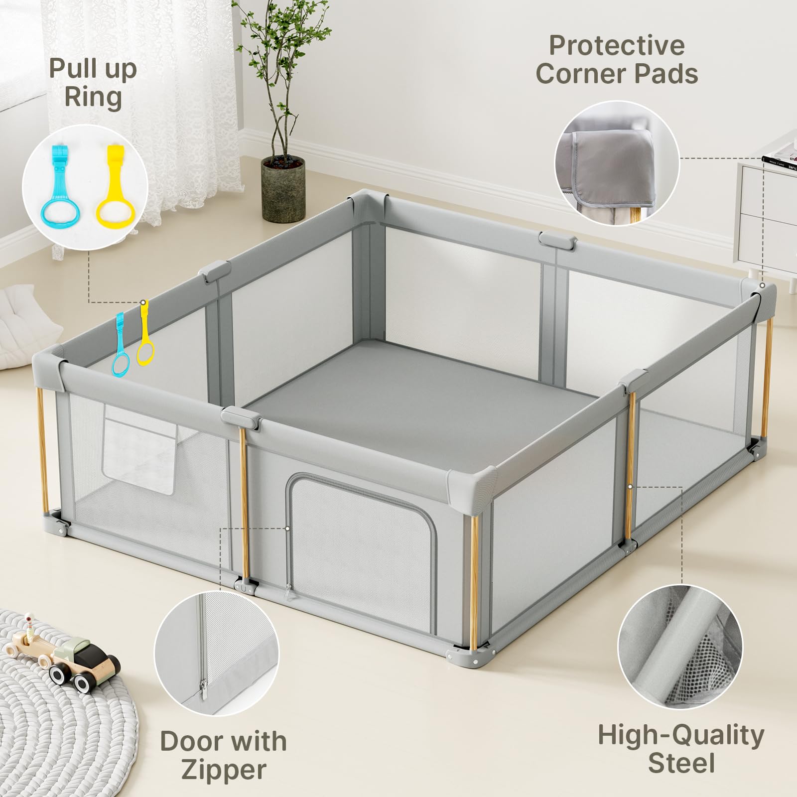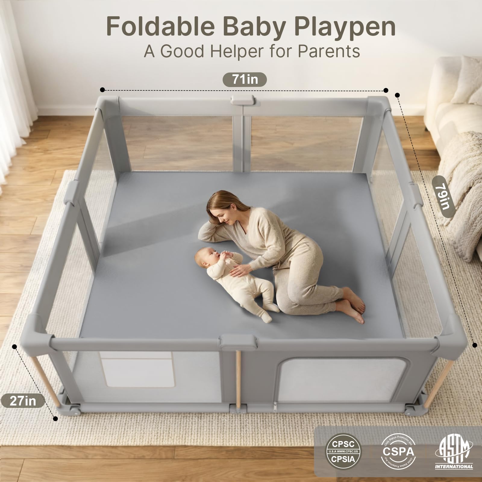 【Foldable Baby Playpen】The 79"x71" foldable playpen features an innovative folding design, making it easy and quick to disassemble and assemble. It takes only 1-3 minutes to set up the playpen for babies and toddlers by yourself. The included storage bag ensures neat compact storage, saving both space and hassle for busy parents. Please note: To avoid any inconvenience, please measure your space beforehand and select the fence that matches your measurements
