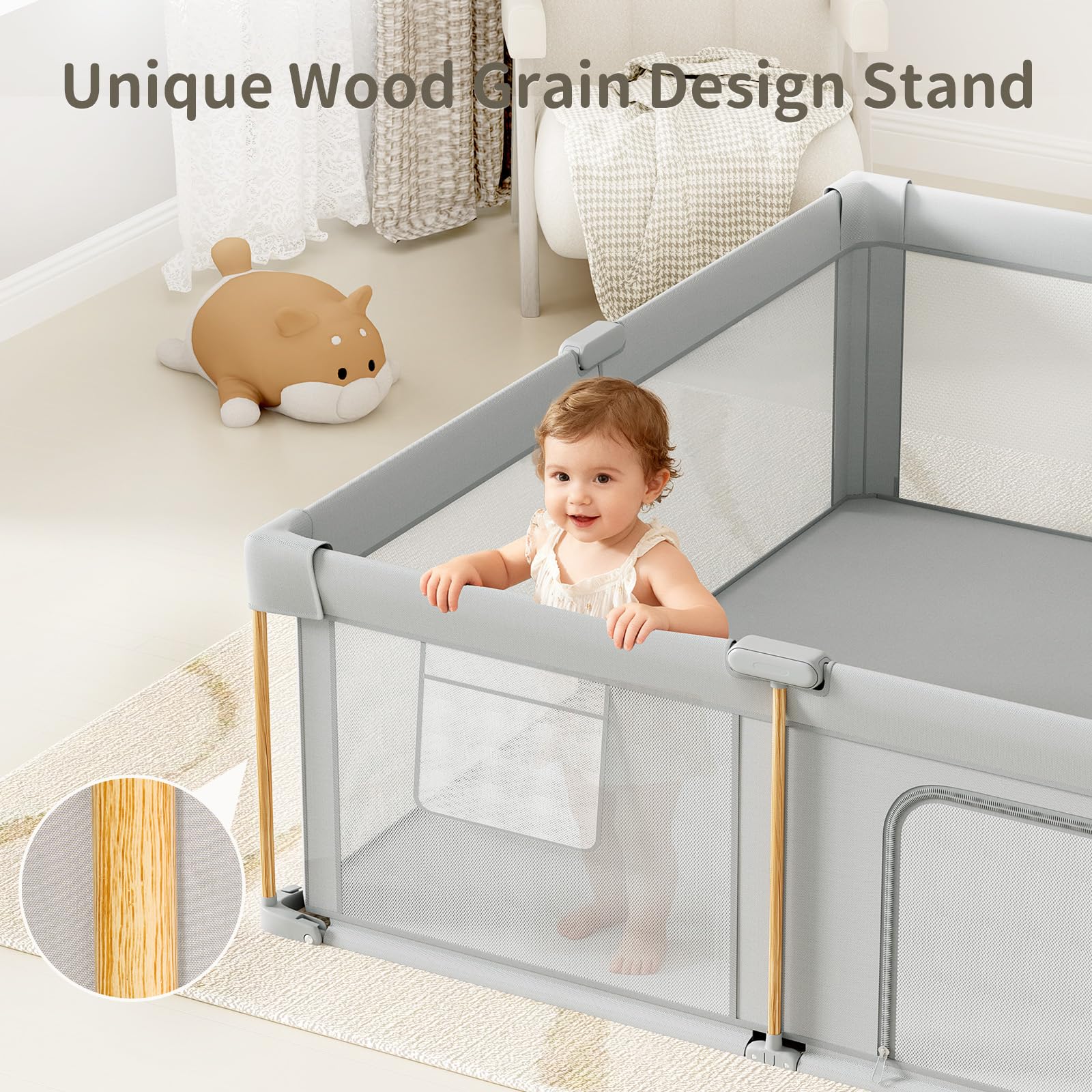 【Elegant Wood Grain Design】This foldable baby playpen sets itself apart with distinctive wood grain aesthetics that blend functionality with stylish appeal. The complete baby playpen with mat seamlessly complements your home decor while creating an attractive and comfortable play space for your child