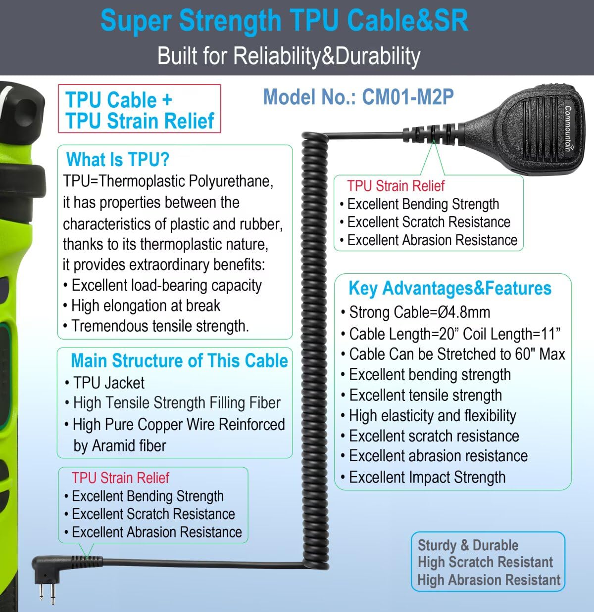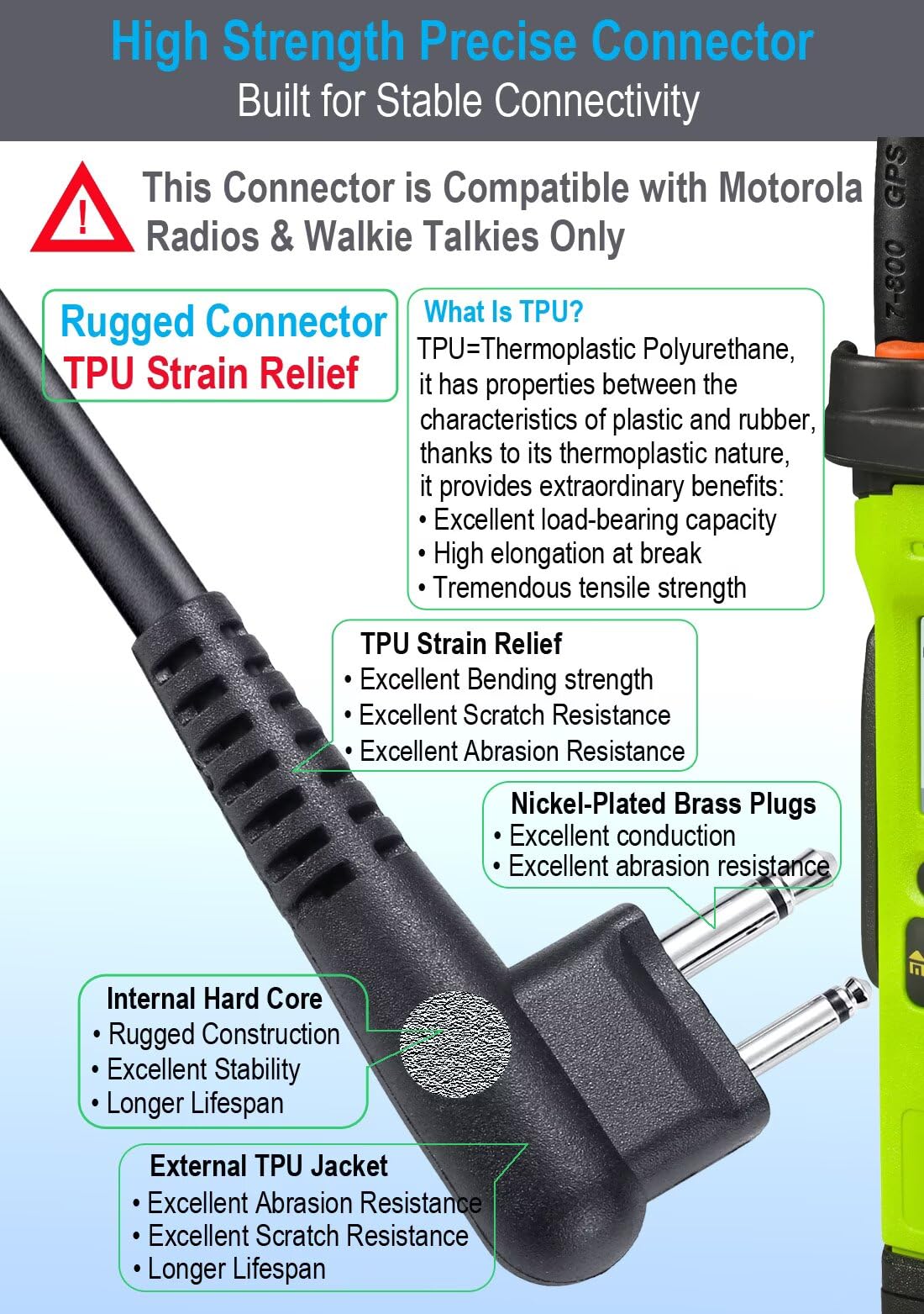 High Strength Precise Connector: With TPU (Thermoplastic polyurethane) rubber jacket, internal hard core and Nickel-plated brass plugs, assembled by precise soldering technology and molding technology, the connector of this speaker mic is built for stable connectivity and excellent operating life.