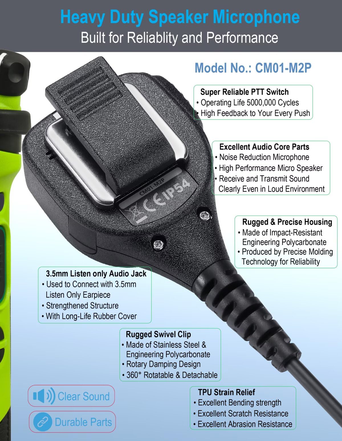 Rugged Construction: With high impact-resistant engineering Polycarbonate plastic housing, SMT electronic board, internal vibration absorption system, stainless steel detachable 360-degree rotatable heavy duty clip, combined with precise molding technology, this speaker microphone is built for tough mission critical use and is built to withstand knocks and bumps.