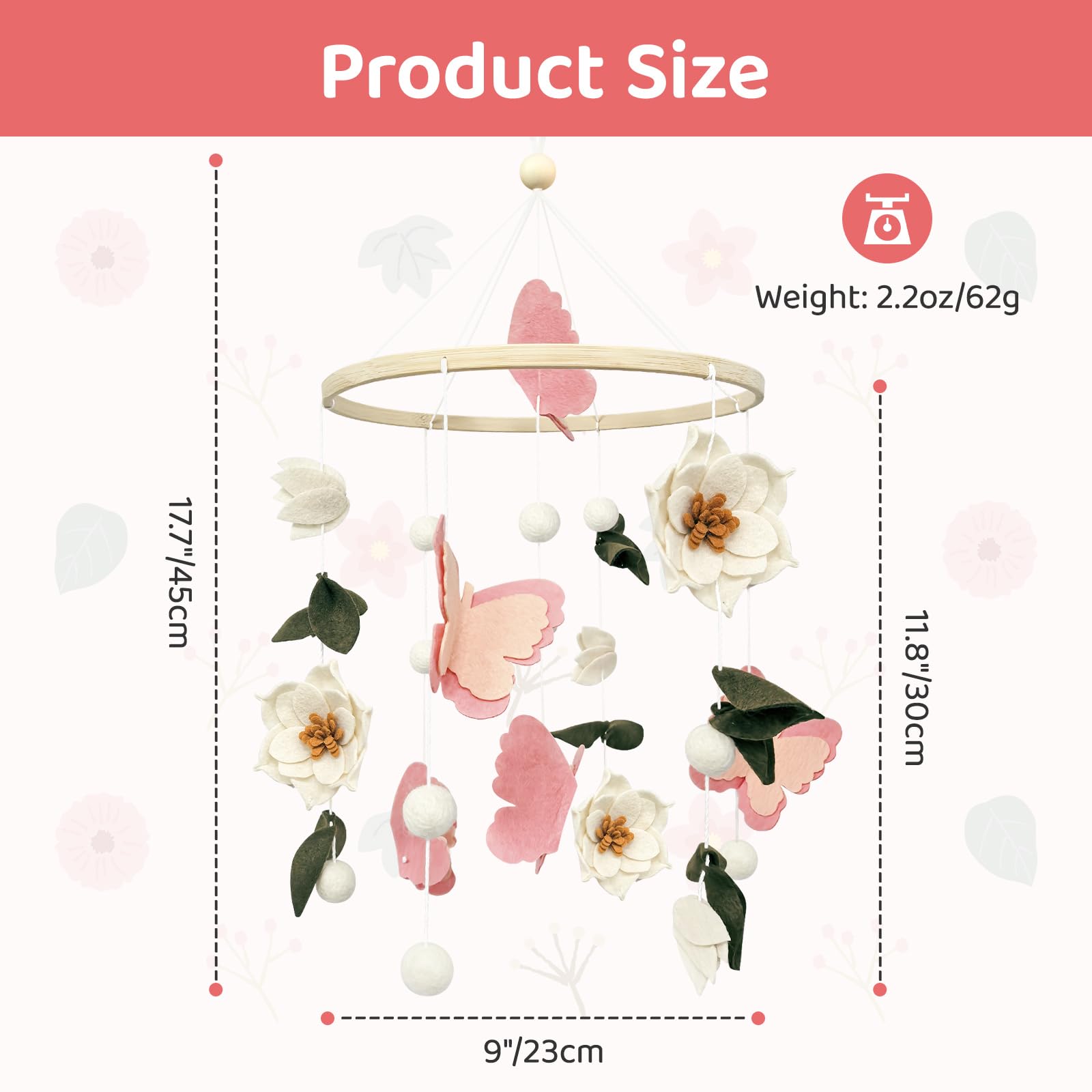 Package includes: Floral Baby Crib Mobile × 1 Elements: Flowers and Butterflies Material: High-quality felt, wood Size: Diameter 9"/23cm Overall Height: Approx. 17.7"/45cm (Top Hanging Loop to Bottom) Recommended Minimum Age: 2 months This is an elegant and beautiful flower butterfly baby mobile for crib. This style is very popular and makes a perfect baby shower gift. Every detail has been carefully considered to make the nursery a cozy haven. Don't miss the opportunity to give a memorable gift that will be treasured for years to come! (By Teeloray) Care instructions: Mobile cannot be washed. The best way of cleaning it is to use a lint brush, which perfectly removes dust. Note: 1. Decoration only! Please ensure that the mobile is kept out of reach of little hands! 2. Hand-sewn, we cannot ensure that each piece is exactly the same! 3. Manual measurement, please allow for size errors!