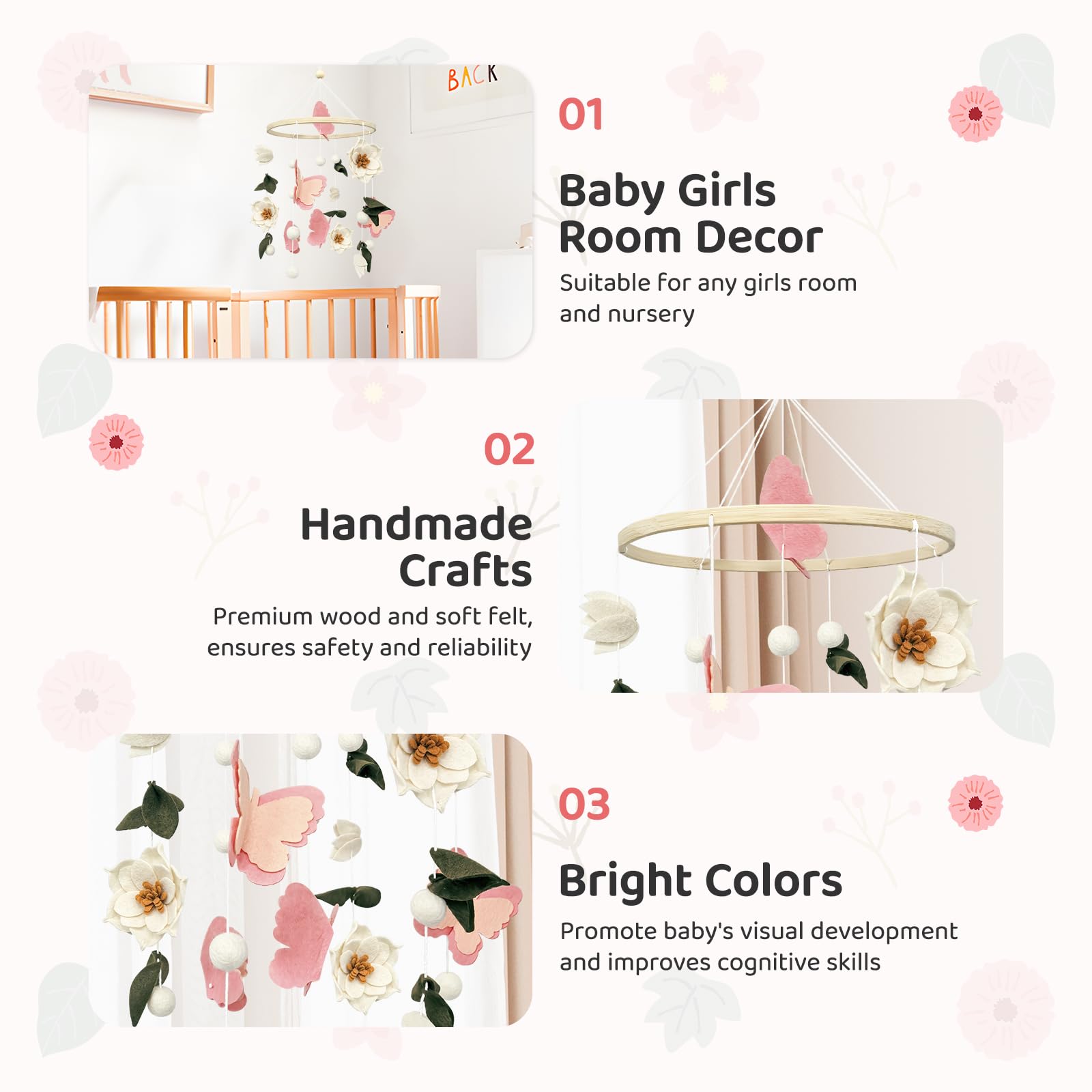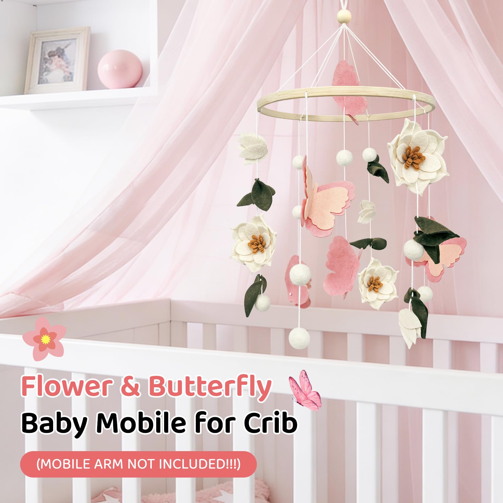 Stimulates Sensory Exploration: Designed to engage developing minds, the soft-colored shapes and gentle tones promote visual tracking skills in newborns. Simply hang the floral baby mobile on the mobile arm (NOT INCLUDED!!!), gently rotating above the crib, the textured felt accents and dimensional figures spark curiosity without overstimulation – perfect for fostering early focus and calm observation.