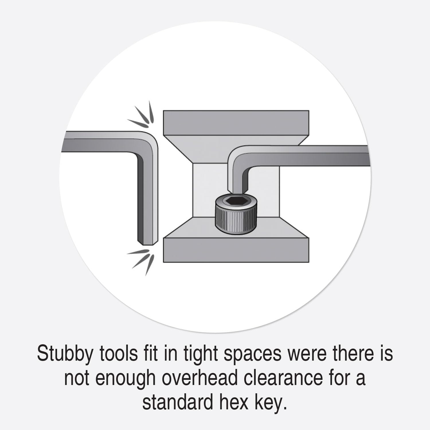 Low profile short arm reaches screws with low overhead clearance, that are inaccessible with any other type of hex tools