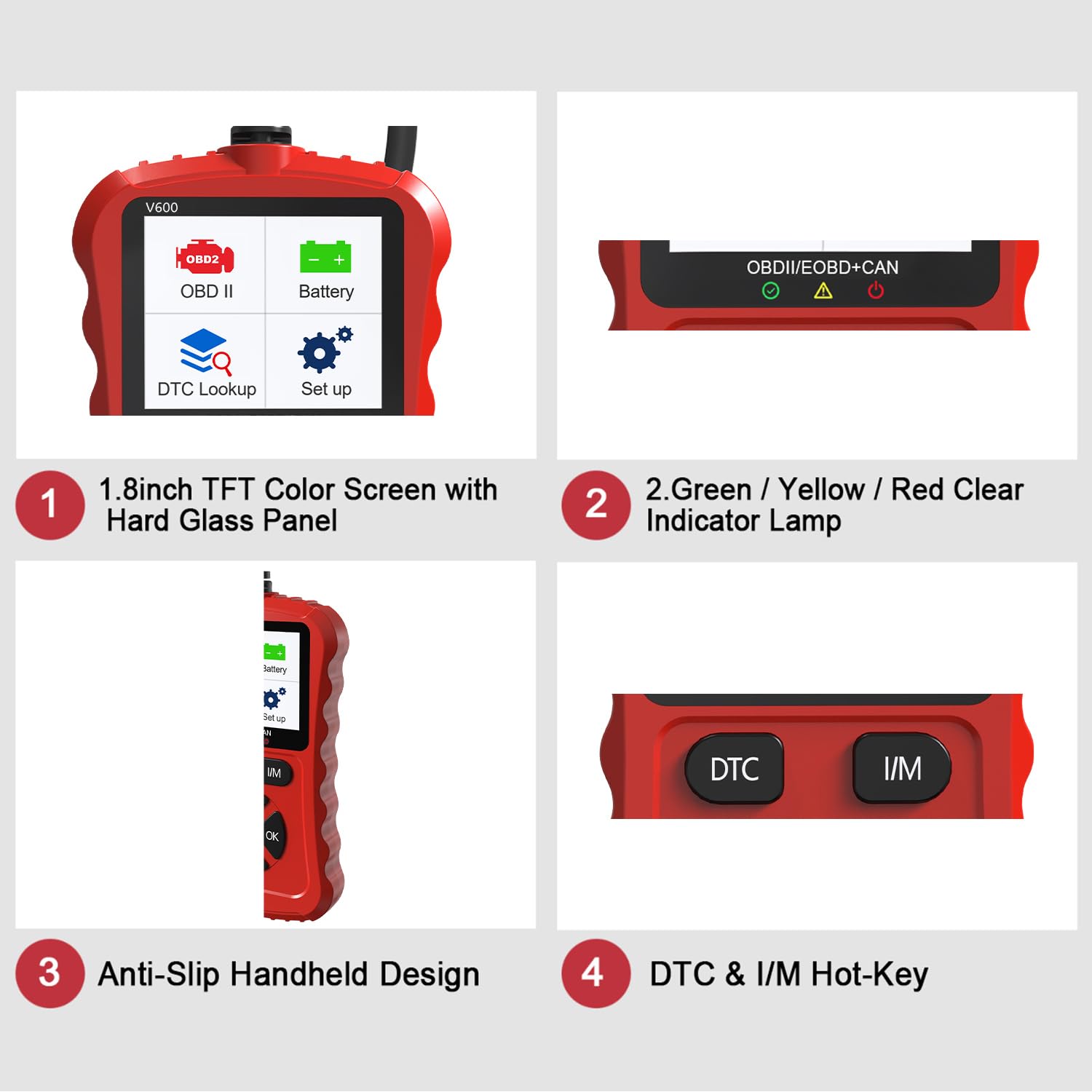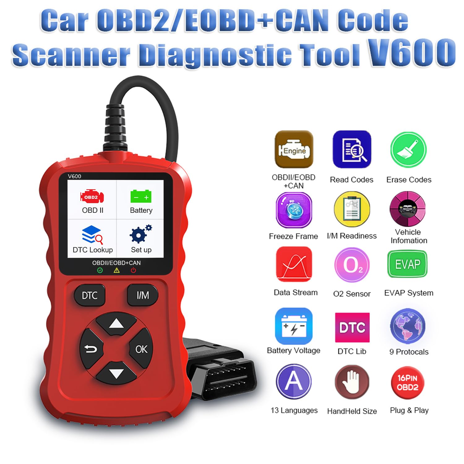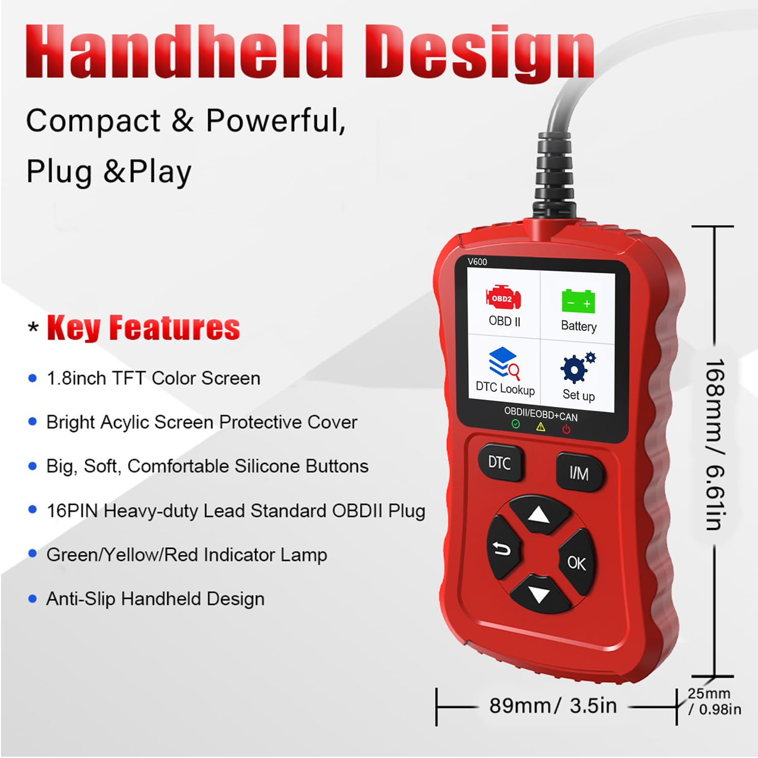 Excellent-Structured and Beginner-Friendly: Made of high-quality impact-resistant materials, this engine code reader eatures a sturdy non-slip housing and a long, flexible cable for durability. Its compact and lightweight construction makes it easy to carry and store, and its bright color screen provides clear readability even in low-light conditions. Equipped with 6 intuitive operation buttons, dedicated I/M and DTC shortcut keys and a plug-and-play design allow users to easily navigate menus and perform diagnostics with minimal effort. Even if you are a beginner in mechanical tools, this easy-to-operate OBD2 scanner can provide you with efficient and convenient service.