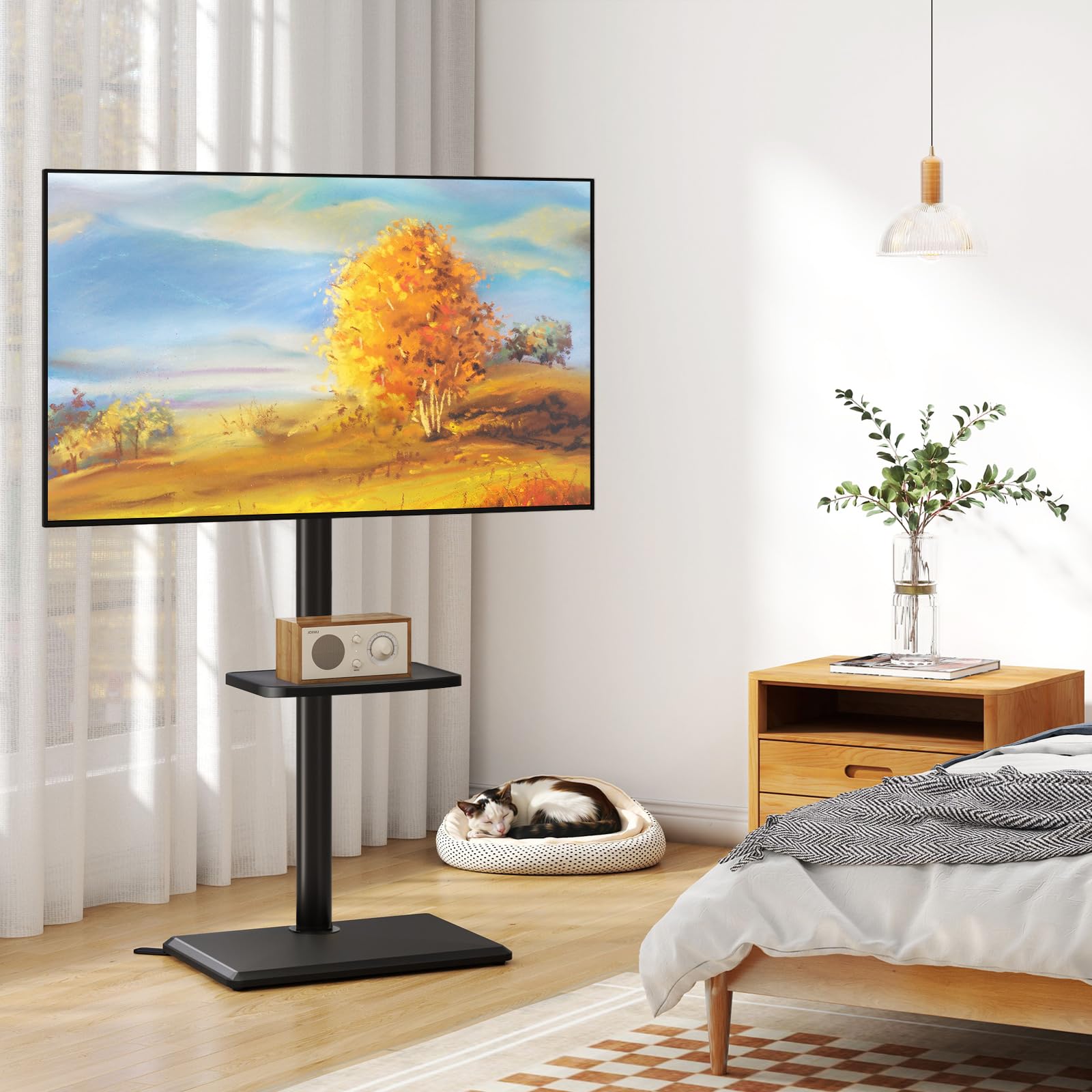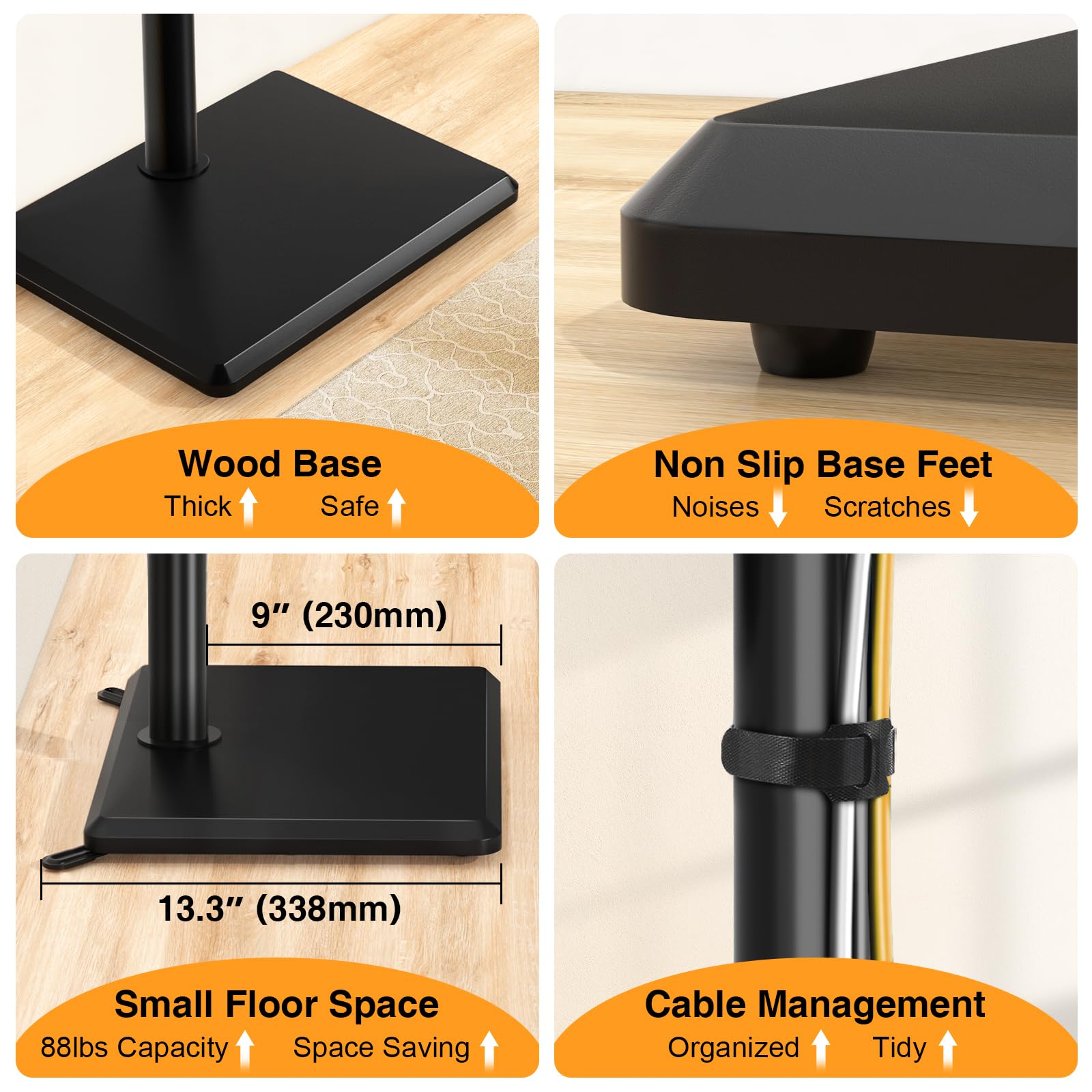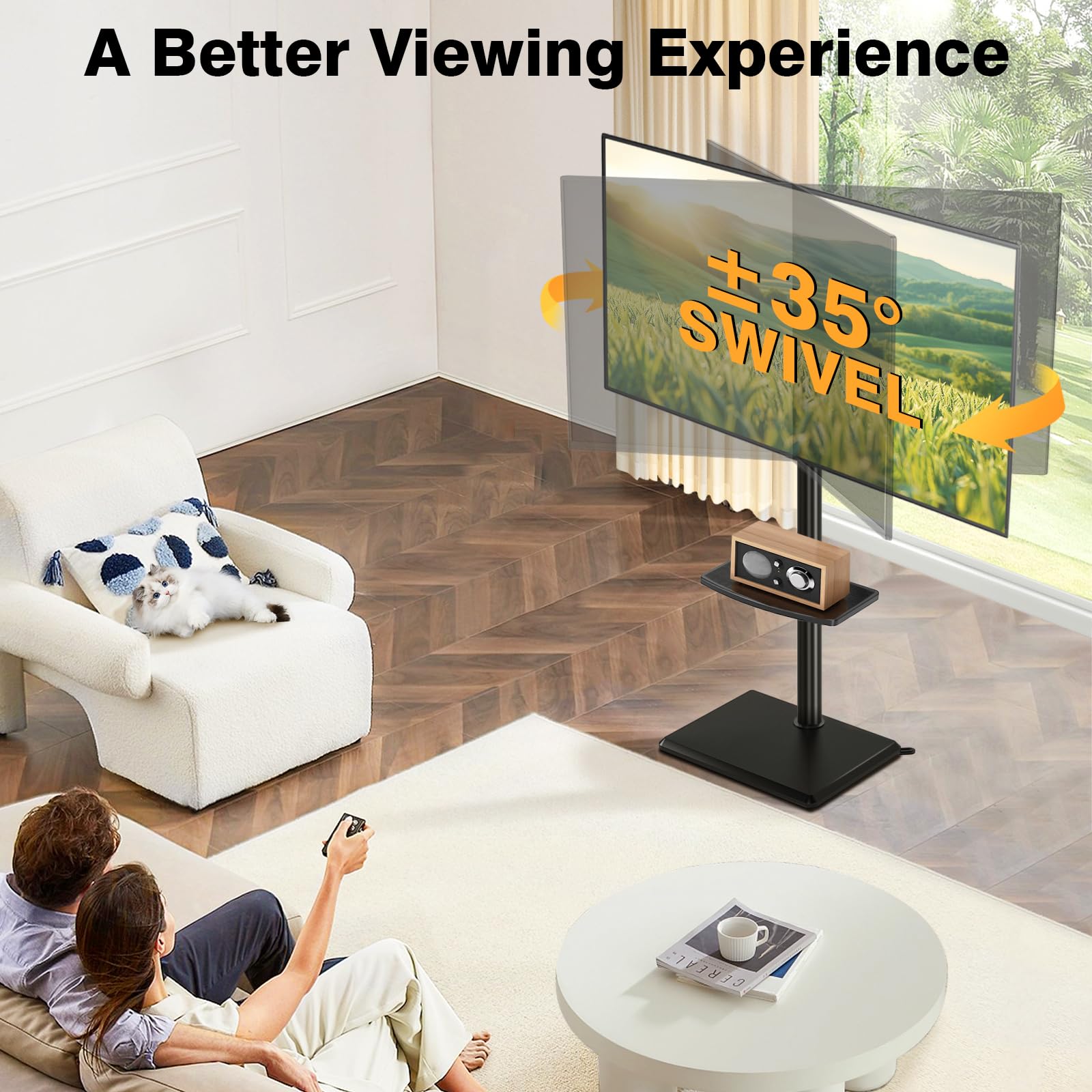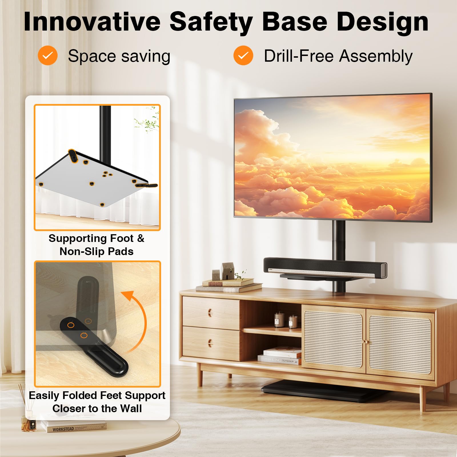 【Innovative Safety Base Design】Compared with other brands of stands, our TV stands are more stable and robust. The key to its stability and robustness lies in the TV base foot supports, located at a 45-degree Angle behind the base of the tv swivel stand, which effectively prevents leaning and withstands unexpected shocks from external forces. This innovative design not only protects your TV, but also keeps your family safe in case of unforeseen accidents.
