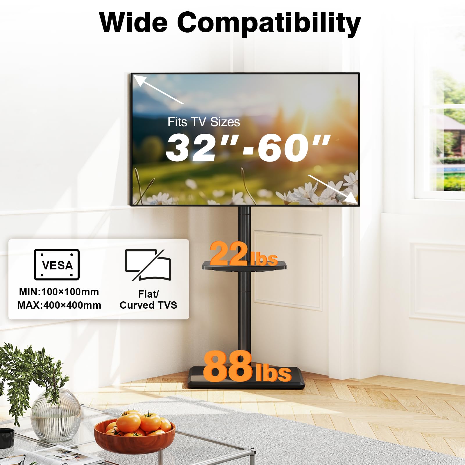 【Wide Compatibility Stand】The universal tall TV stand is sturdy to support 32″, 39″,40″,42″, 43″, 48″, 49″, 50″, 55″, 60″ lcd led oled qled flat/curved screen TVs with a MAX weight of 88 lbs, compatible with VESA patterns between 100(w)mm x 100(h)mm up to 400(w)mm x 400(h)mm. Our local customer service team is prepared to solve your problems with prompt reply by phone or email.