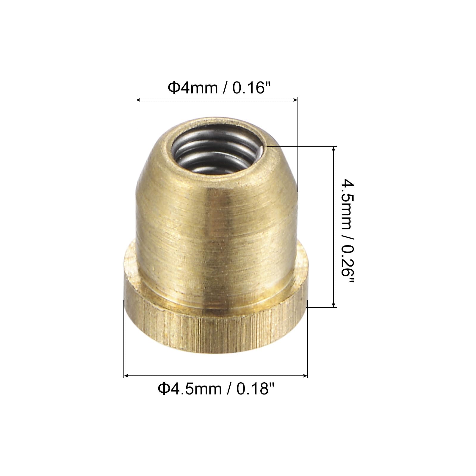 Material: Brass, Diameter: 4mm / 0.16 inch, Max. Diameter: 4.5mm / 0.18 inch, Total Height: 4.5mm / 0.26 inch.