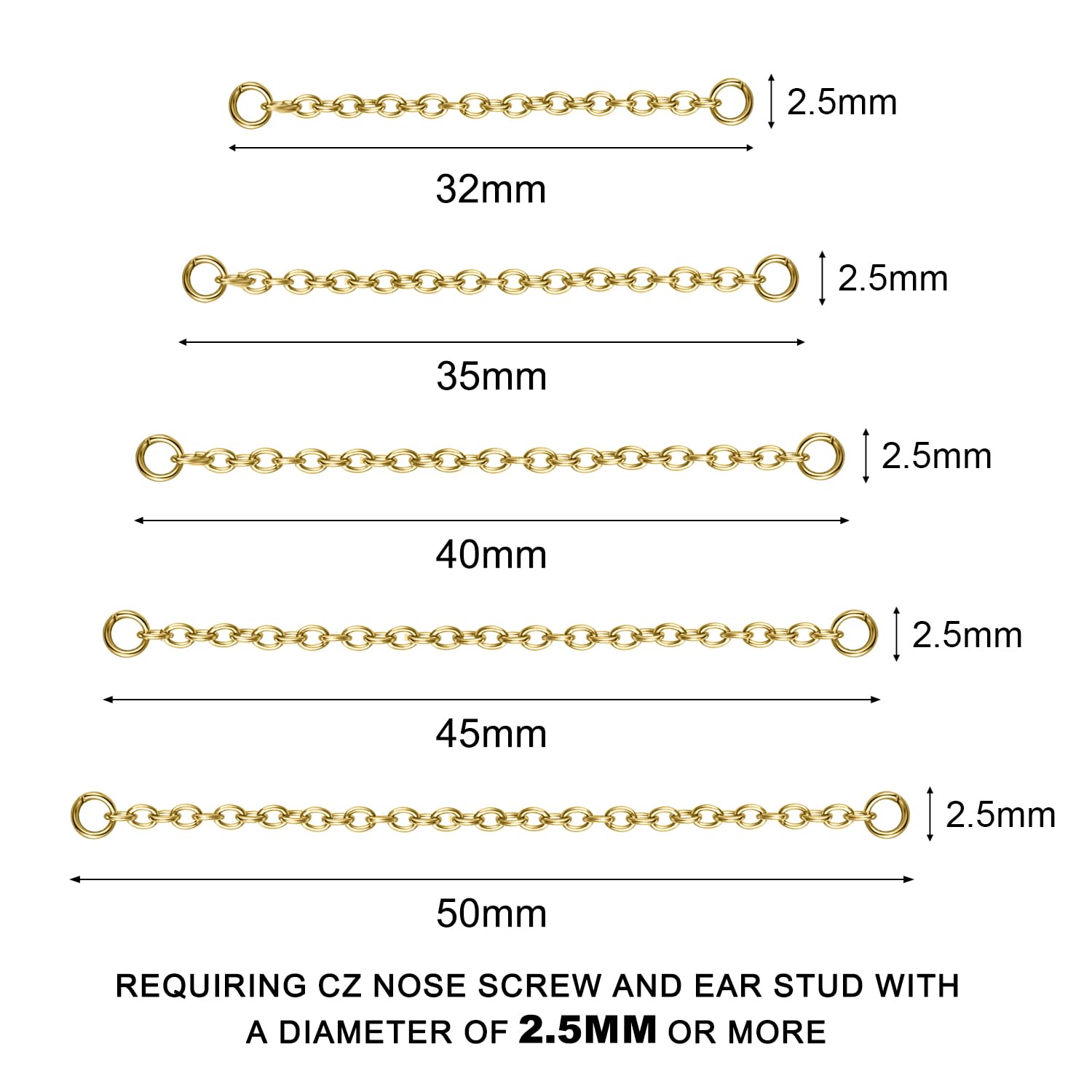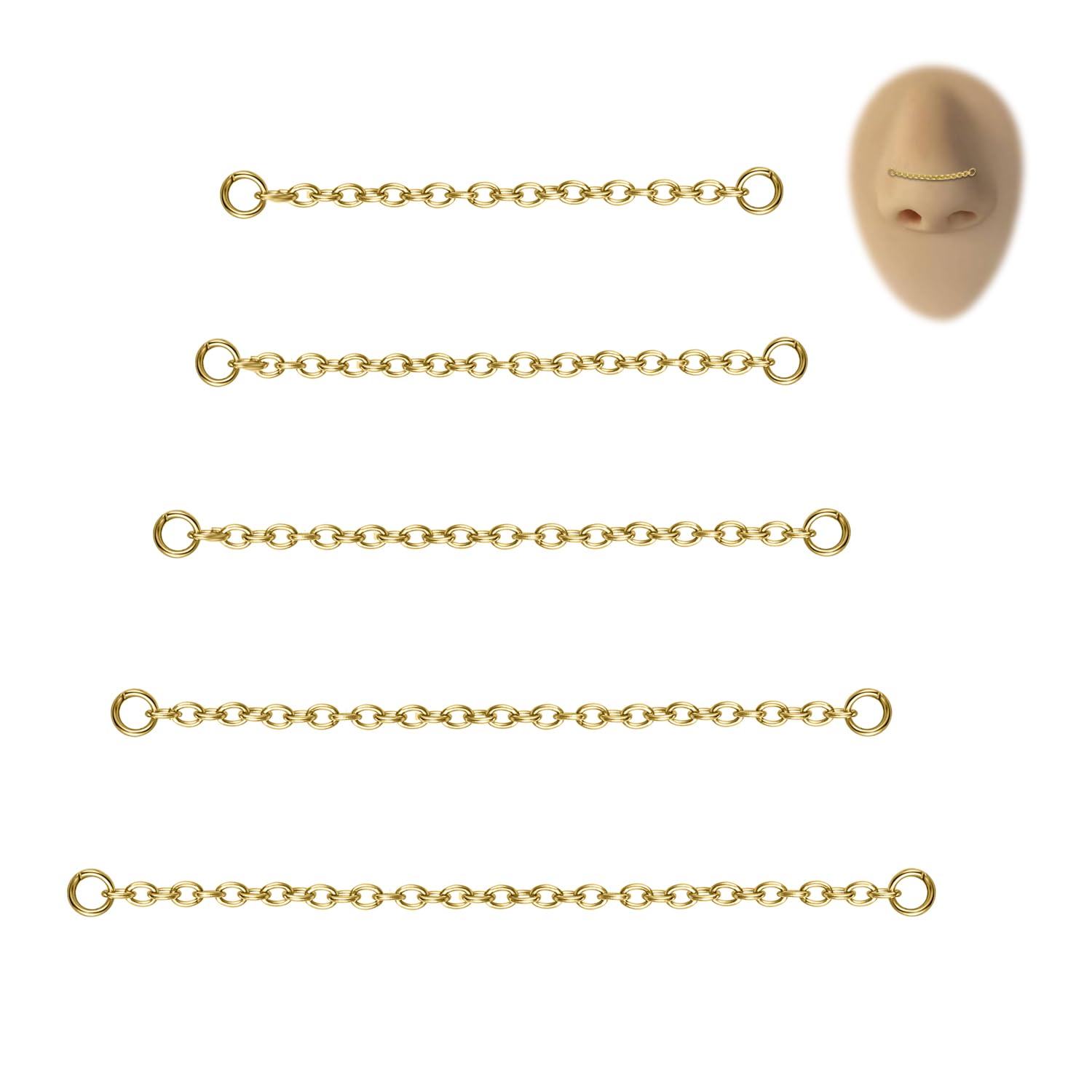 β Packaging & Size: Five different sizes of nose ring chains, 32mm, 35mm, 40mm, 45mm, 50mm, meet your wearing needs for different parts. The position of the nose chain buckle requires CZ nose nails and ear nails with a diameter of 2.5mm or more. (This set does not include nose studs, nose rings, or earrings)