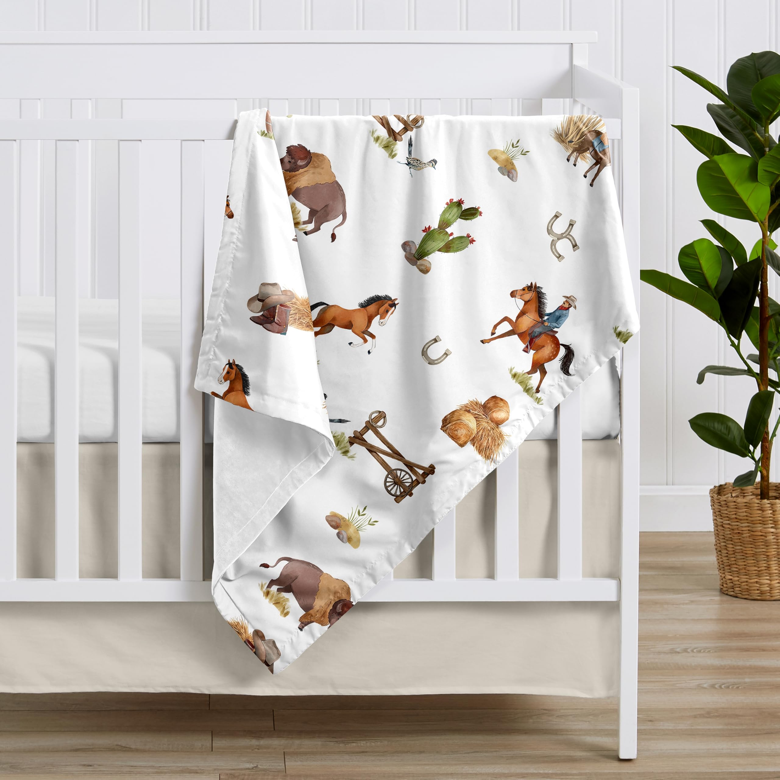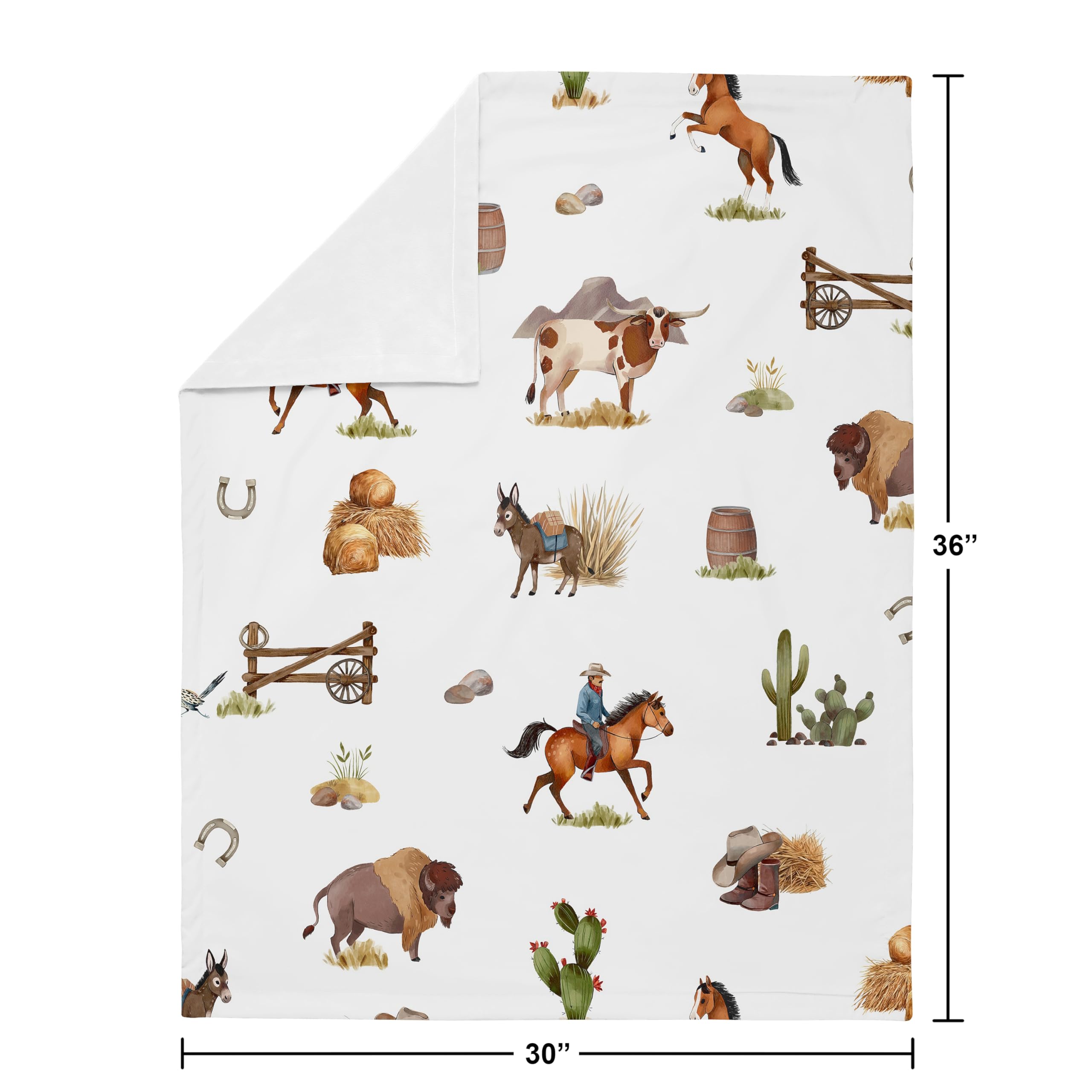 Blanket is designed using a taupe brown blue red white and tan western cowboy wild west southern charm country south horse steer farm animal desert cactus mountains sun print brushed microfiber and reverses to soft white minky