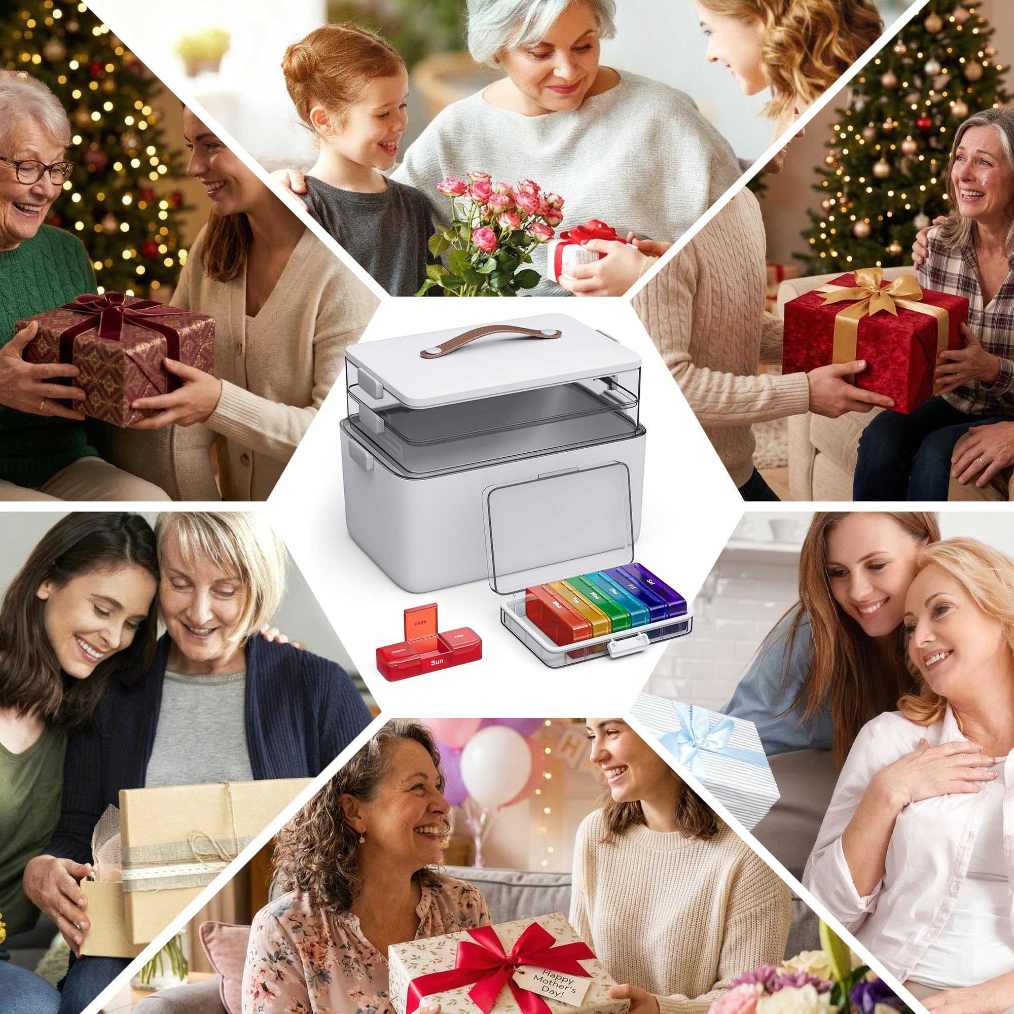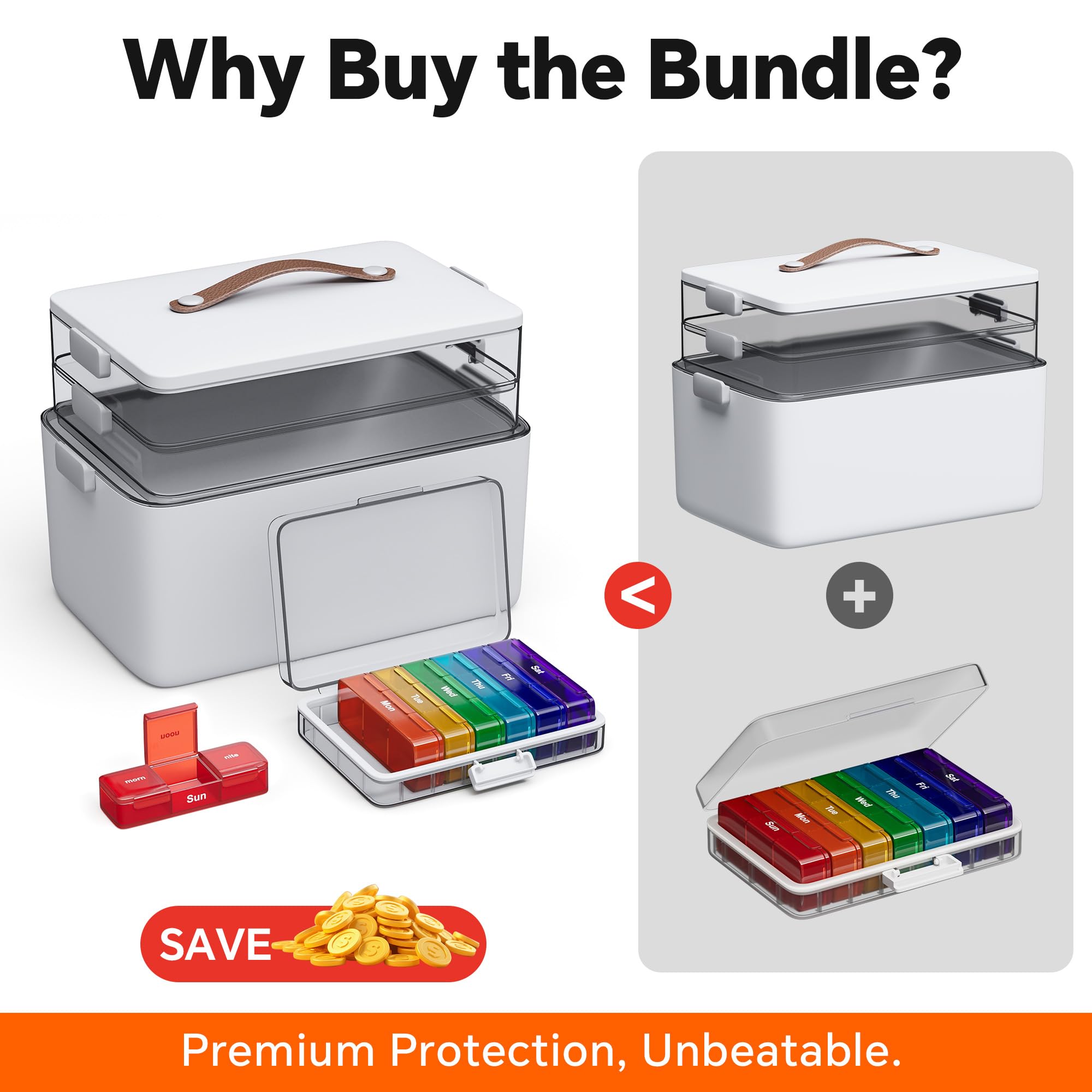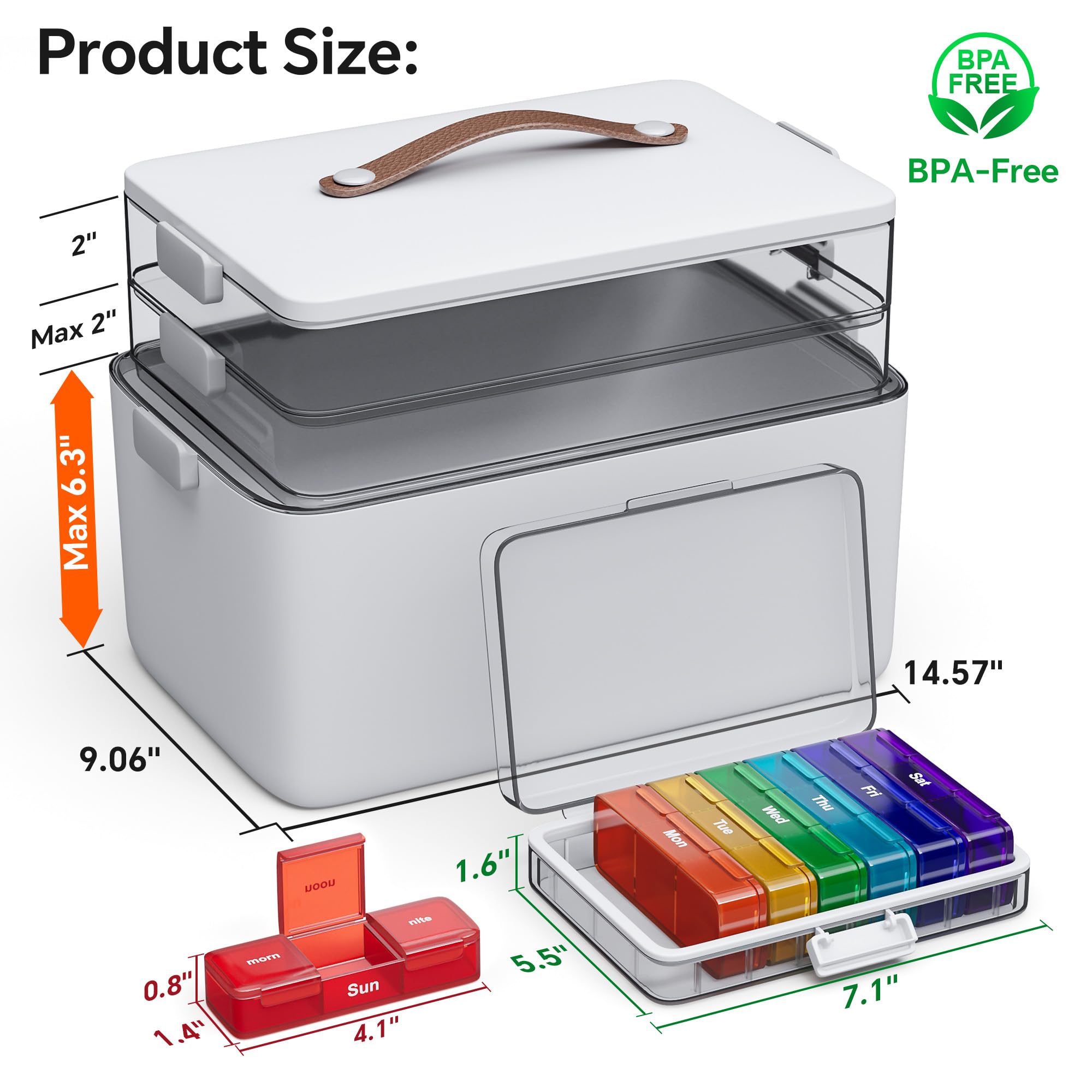 [Medicine Organizer Set]Crafted from premium BPA-free, odorless ABS and PP plastics, this medicine storage set ensures lasting durability and family safety. It includes a high-capacity 3-layer chest and a 7-day organizer with a triple-protection system—featuring a silicone seal, snug case, and secure lock—to effectively guard against moisture and leakage, keeping medications perfectly dry.