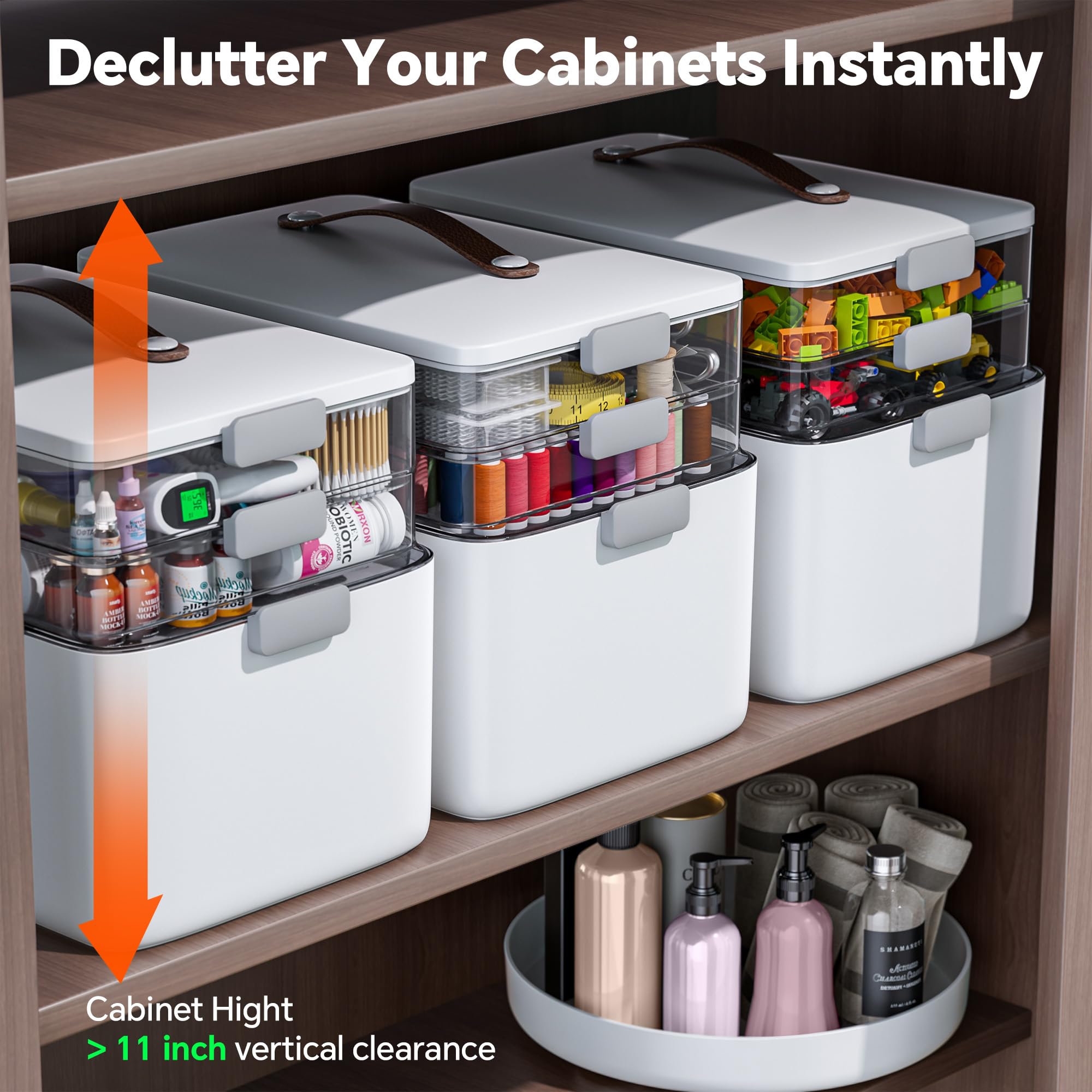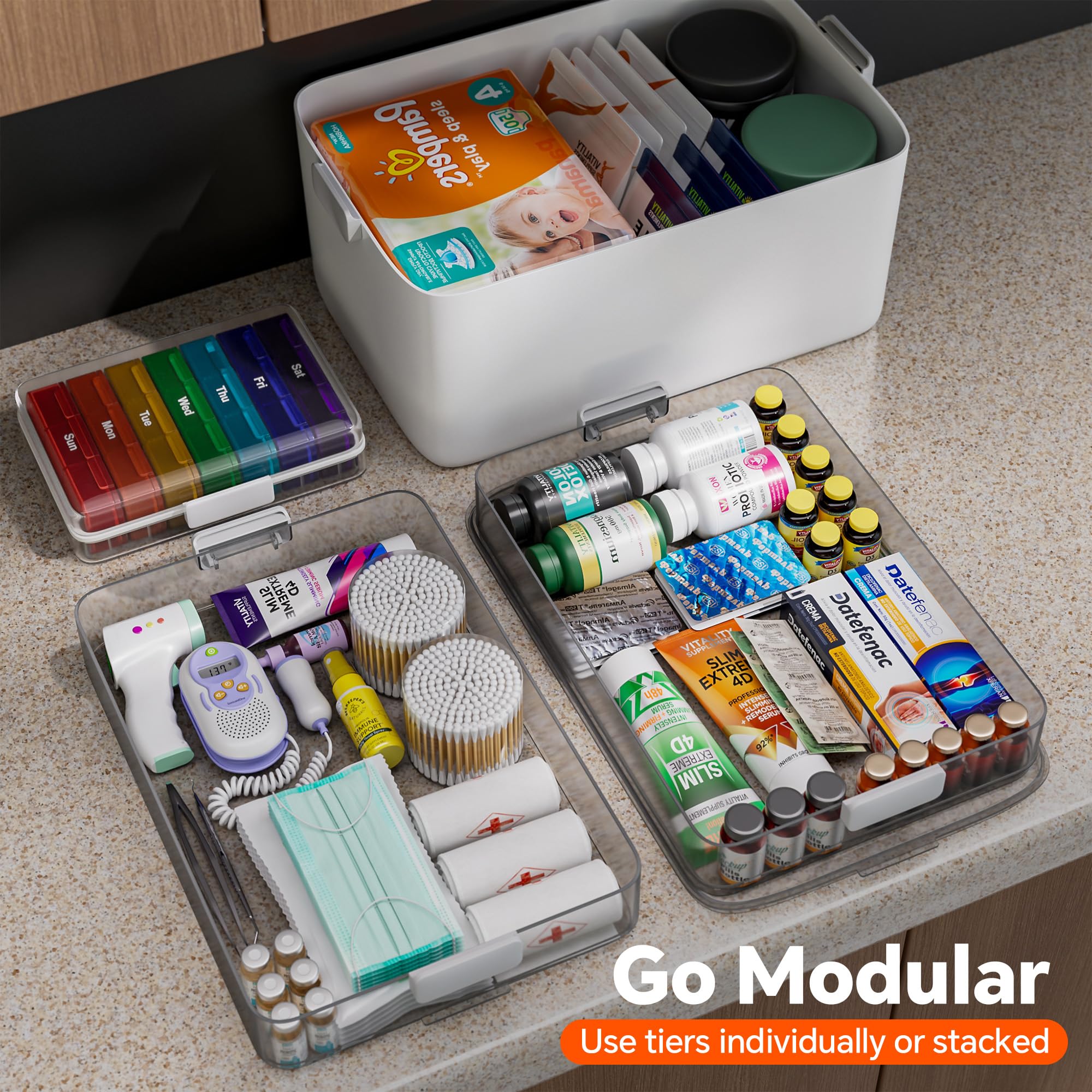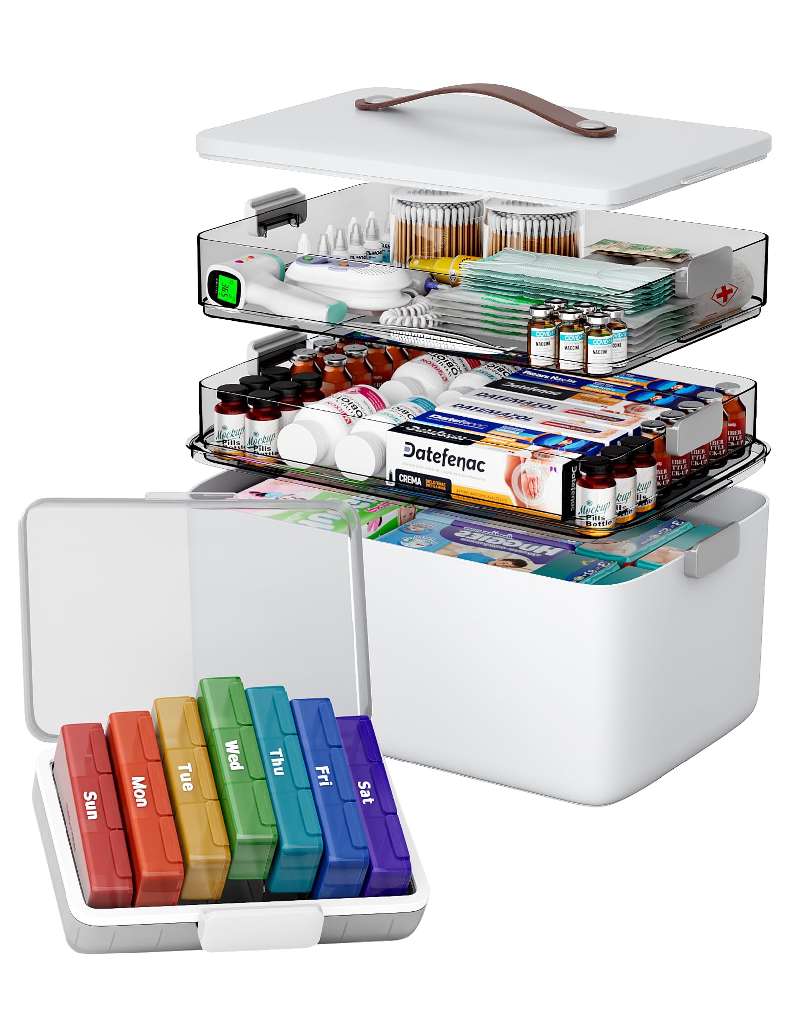 [Versatile 3-Layer Organizer]This versatile 3-layer organizer features transparent, adjustable trays for optimal customization. Perfectly compartmentalize medications—dedicating layers for emergency, daily, and spare use—or utilize it for storing crafts, jewelry, stationery, and more. The clear, removable design ensures contents are always visible and accessible, effectively reducing clutter and keeping your essentials neatly organized in one secure place.