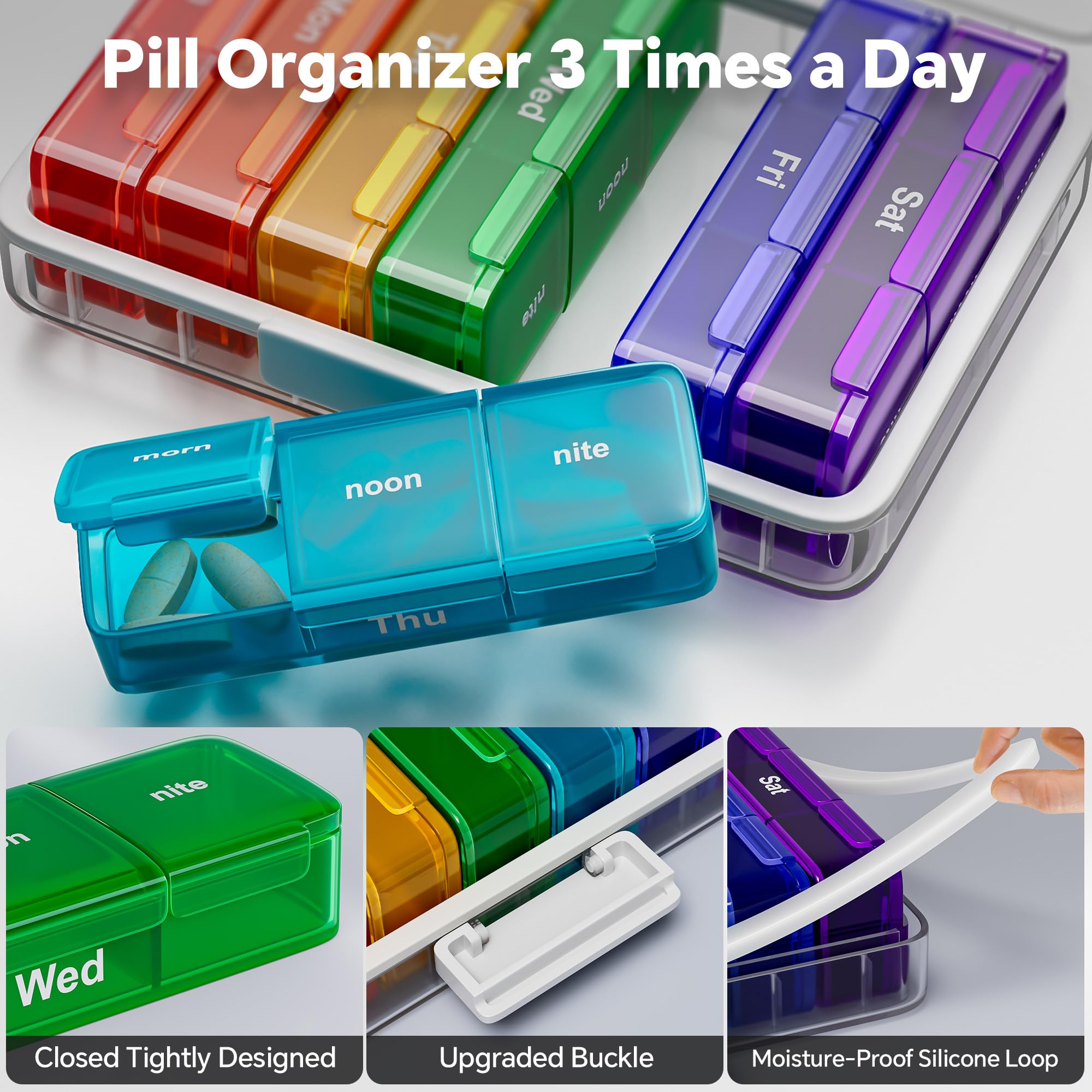 [Easy Carry Medicine Pill Organizer]: The weekly pill organizer has 7 individual daily pill dispensers for the week. A partition design is used between each inner box to ensure that the inner boxes do not move, and each inner box has 3 slots, totaling 21 compartments. The compact size makes it easy to carry in your purse, backpack, or pocket, so you can take your medications with you wherever you go. (Overall size: 7.08" x 5.5" x 1.57"; individual size: 4.17" x 1.89" x 0.8")