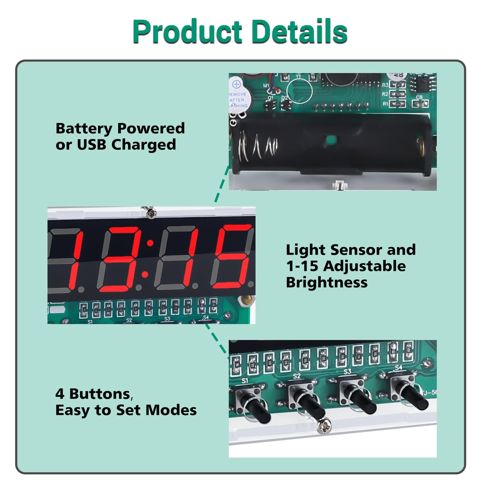 ⏰【Light-controlled Temperature Clock Kit】The practical soldering kit are used to installed to a 4-Digit Rechargeable Digital LED Electronic Clock with Acrylic Shell. Which can display current date, time(24 hour), week, temperature in the real time, also has stopwatch and countdown mode. Highly recommended to practice soldering skills enjoyably for you. Assemble an unique diy kit for anyone you love, accompany them every moment.