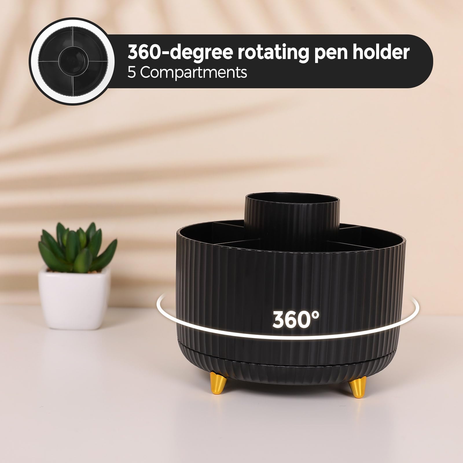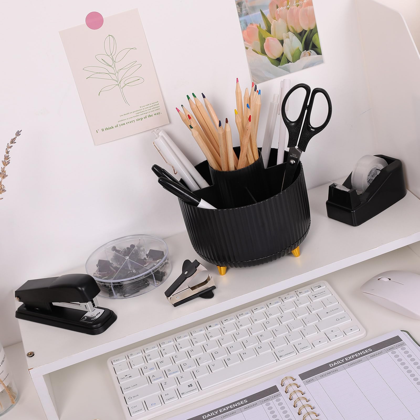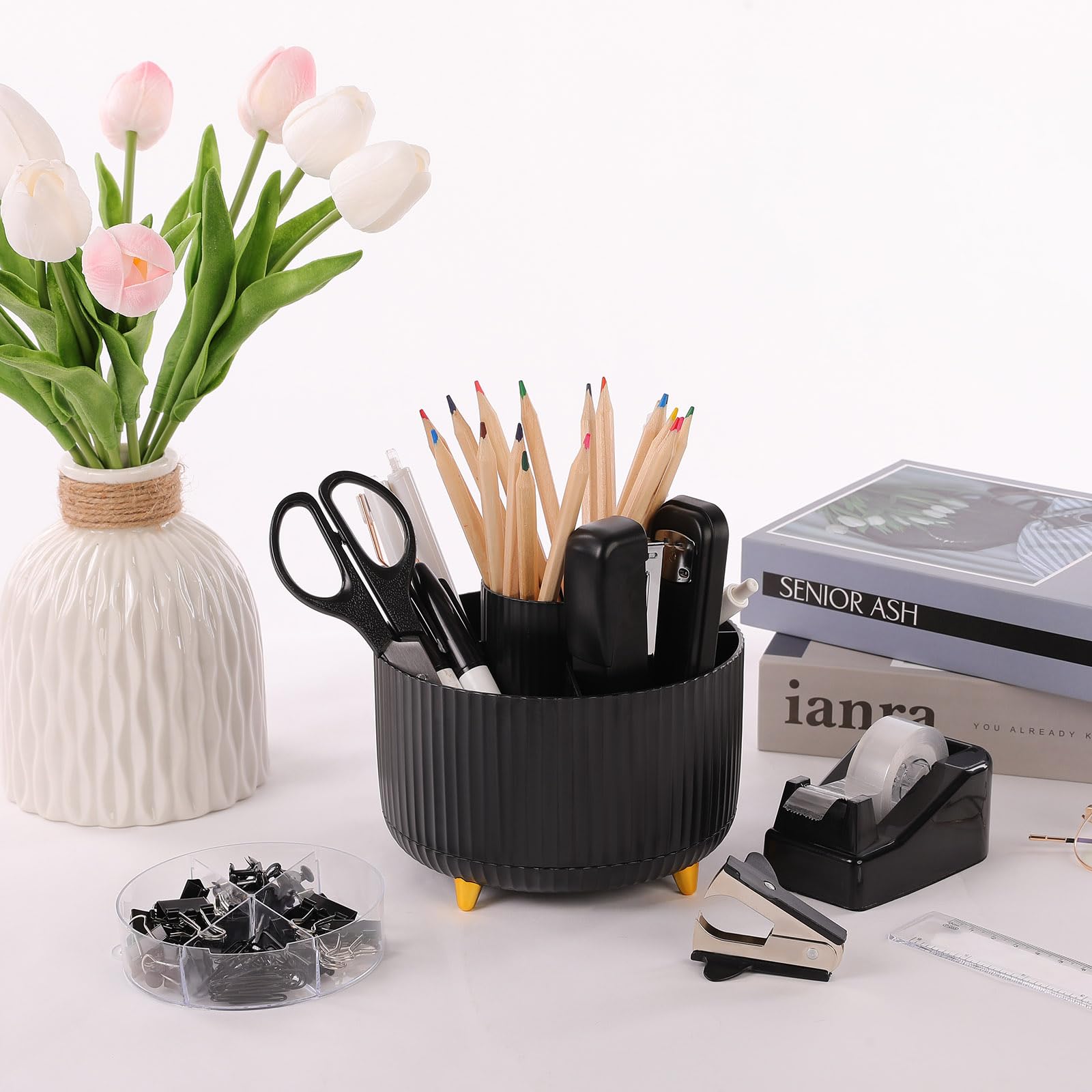 Aesthetic and Practical Design: The office desk accessories sets are designed to be both elegant and functional. They enhance the aesthetics of the workspace with their stylish designs and colors, Unique designs 360-degree rotating pen holders keeping the desk tidy and organize
