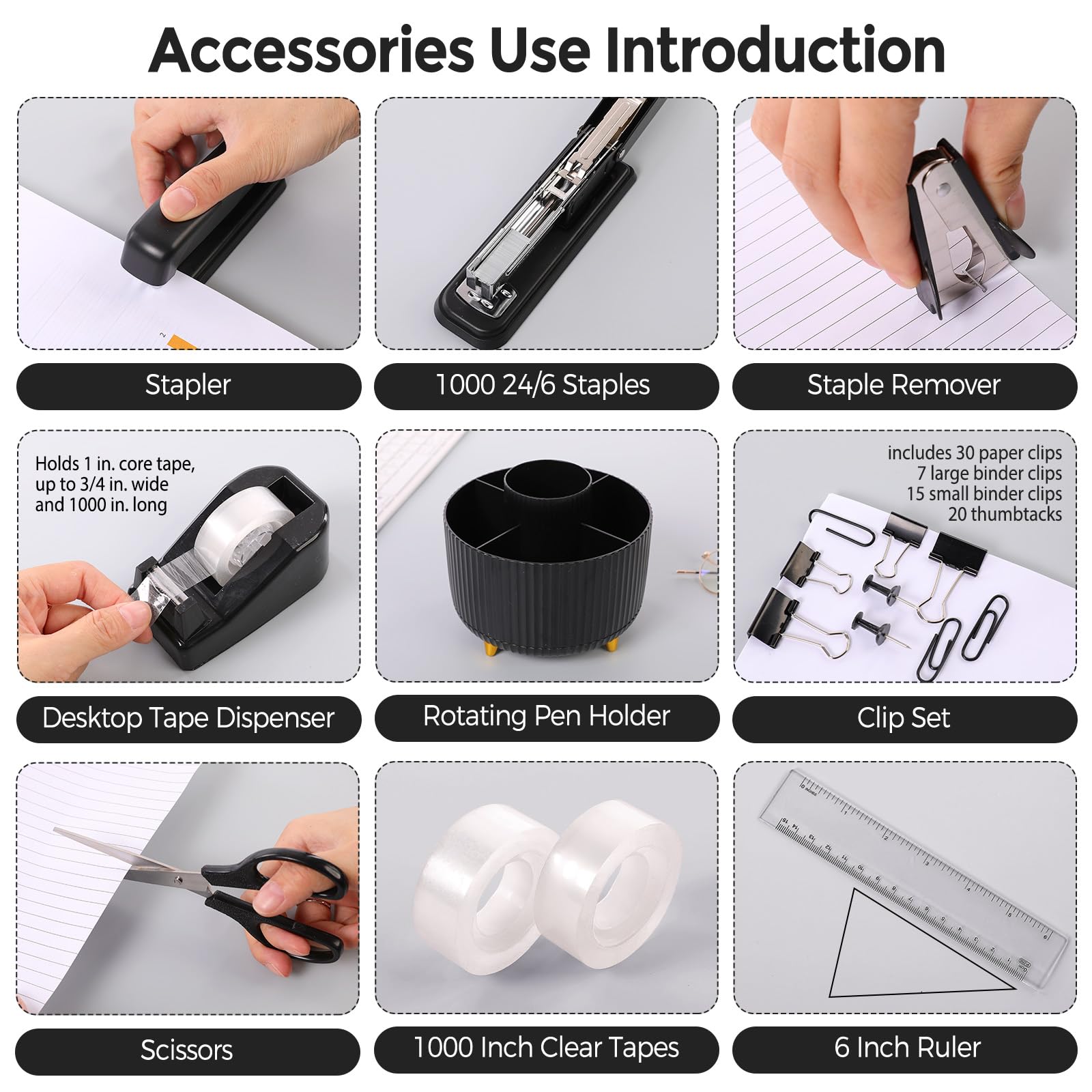 Desk Organizers and Accessories Set: Office Supplies set includes a variety of essential office items,1 x 360-degree rotating pen holders, 1 x staplers, 1 x staple removers, 1000 x staples, 1 x scissors,1 x rulers,1 x tape dispenser, binder clips & paper clips & push pins kit, 2 x tapes.This rich content make your workspace convenient and efficient.