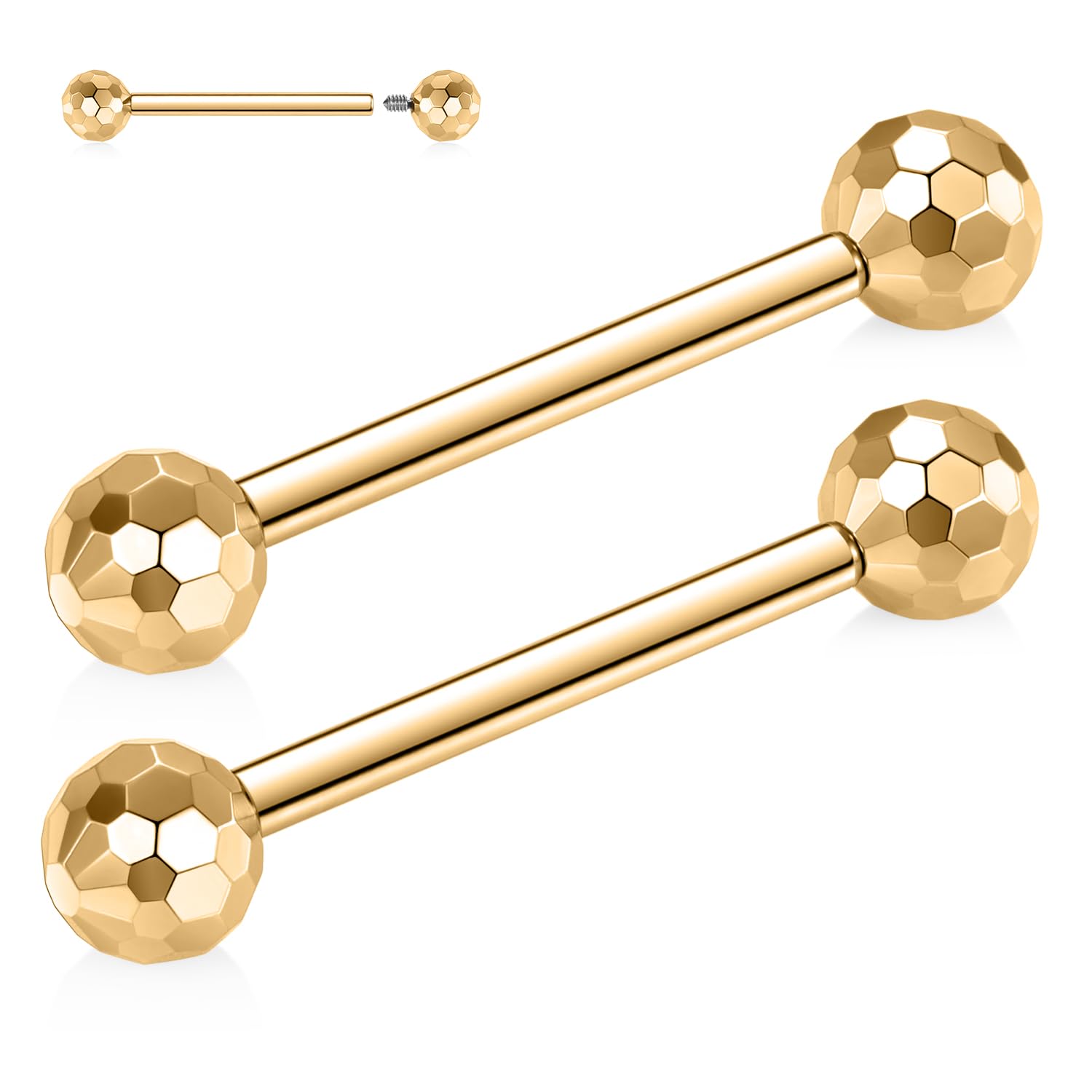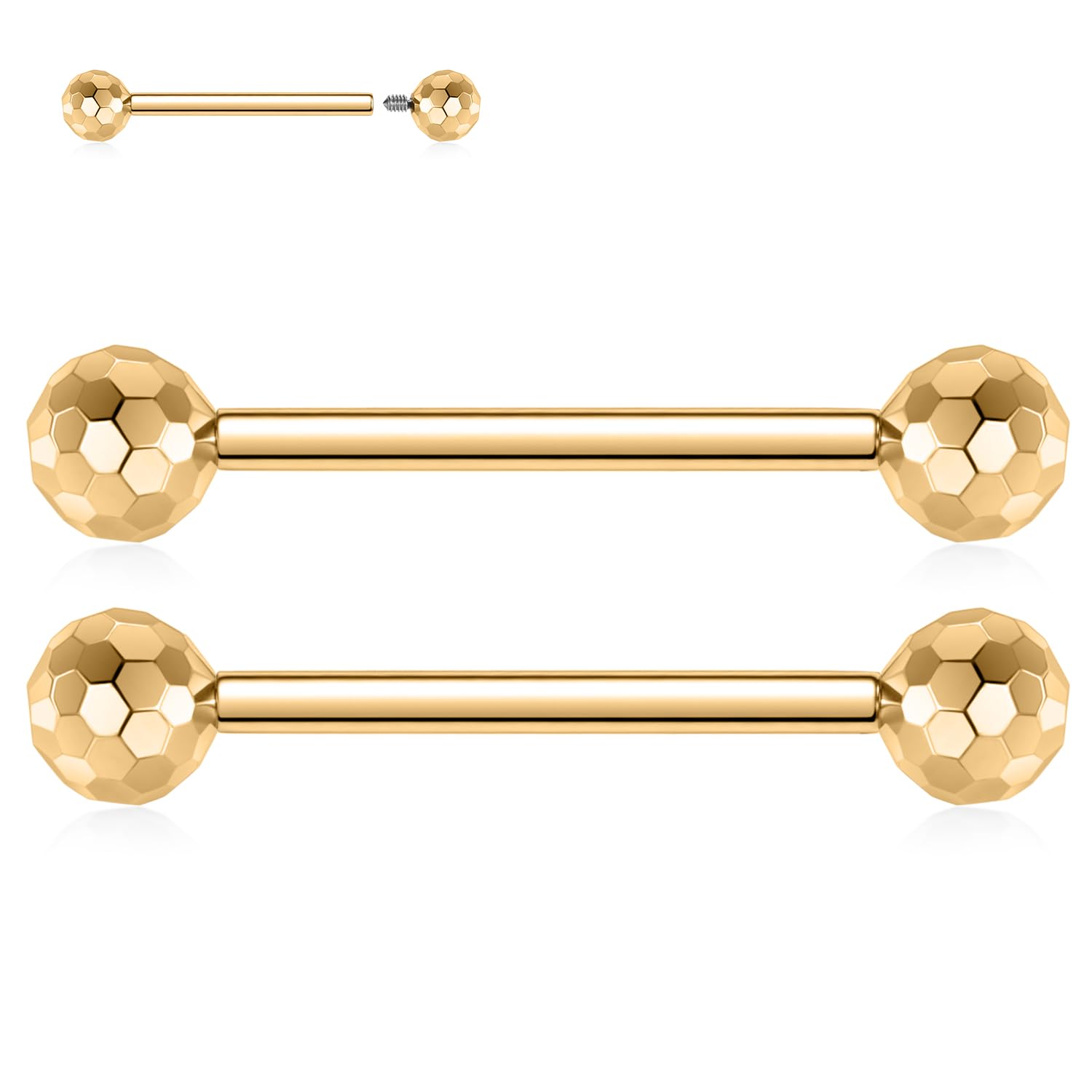 Nipple Ring Size: 14 G (1.6 mm); Bar Length: 12 mm; Ball Size: 5 mm; Color: gold; Cuts surface balls designed