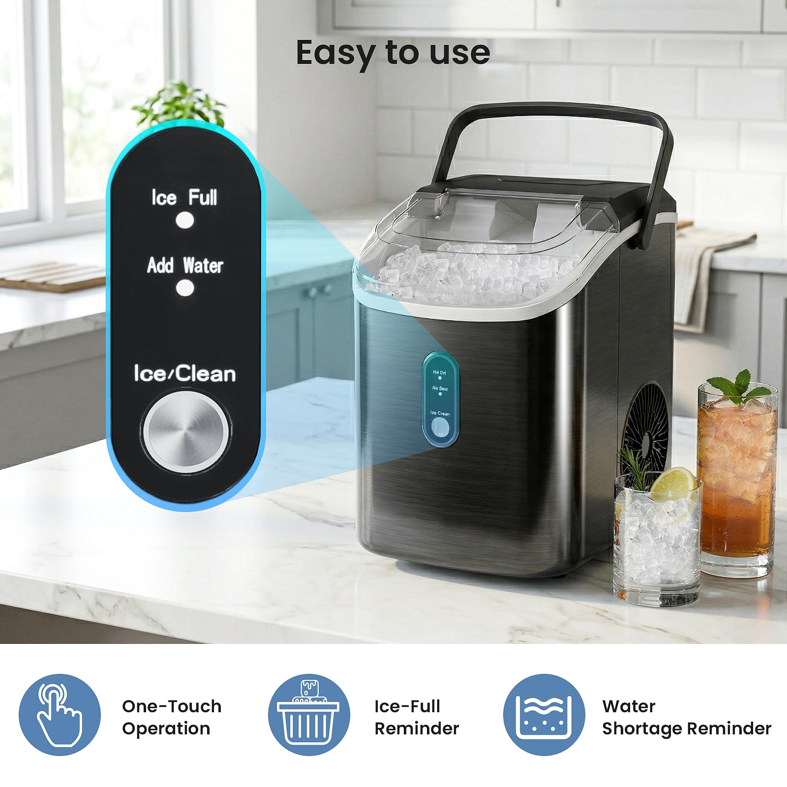 【Stainless Steel Construction & Quiet and Convenient Design】This ice maker uses upgraded stainless steel, making it more robust and durable. Its operating noise is extremely low compared to other products, creating a relatively quiet environment. The transparent top cover allows you to clearly observe the ice-making process; a dedicated ice scoop holder makes it easy to access tools. One-button operation is simple and easy to understand; intelligent indicator lights remind you in real time when the water level is low or the ice basket is full, allowing you to use it with peace of mind.