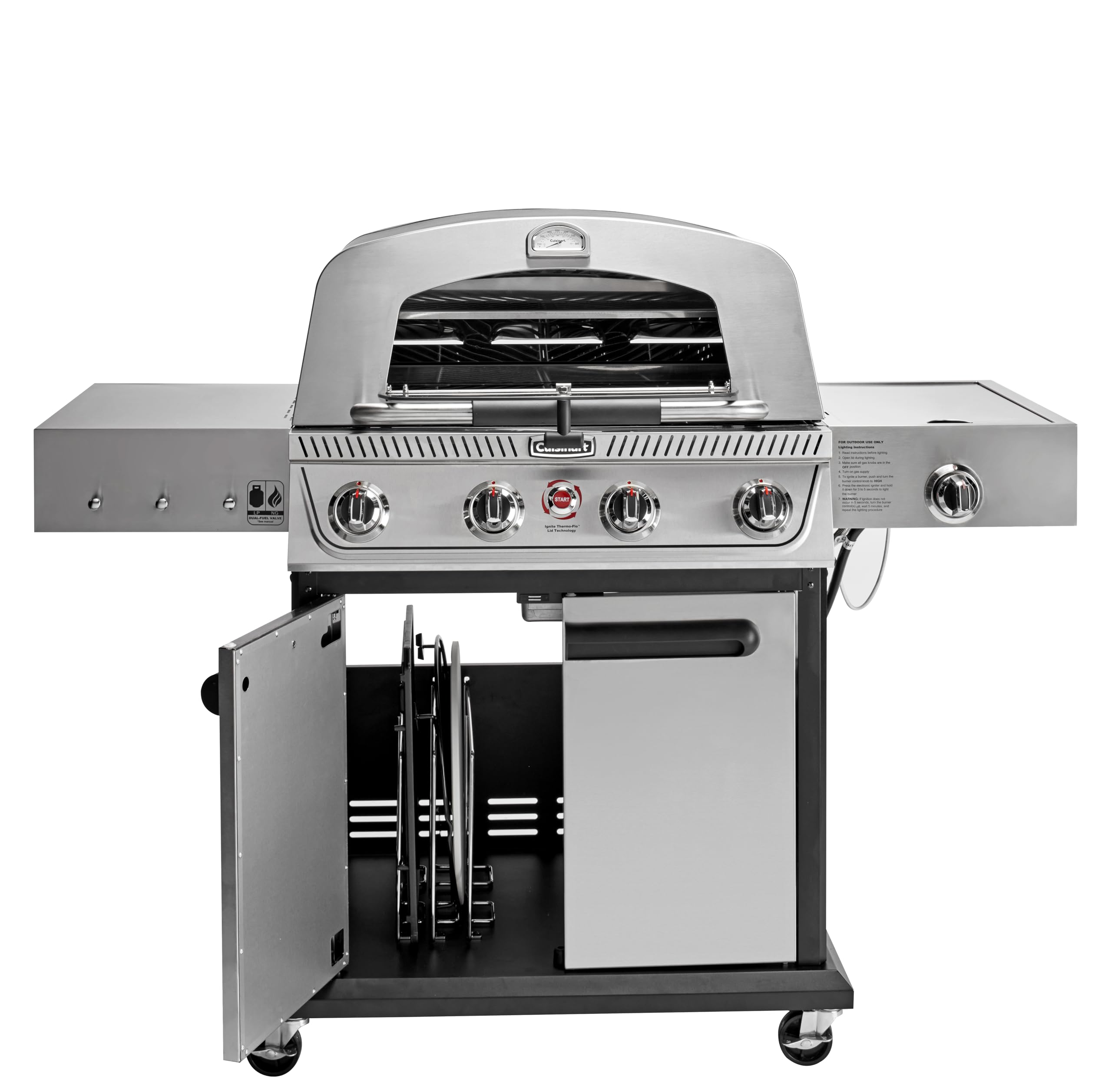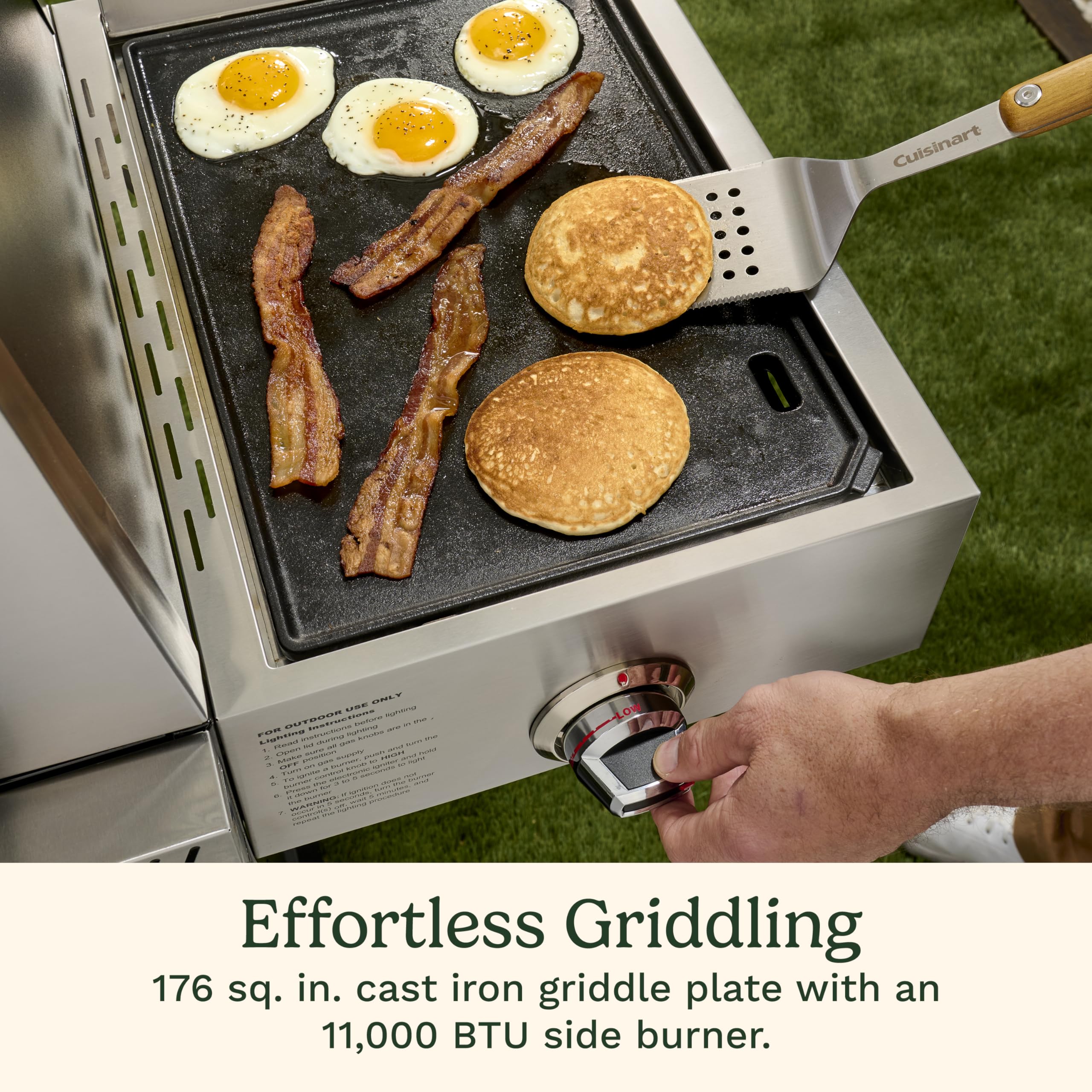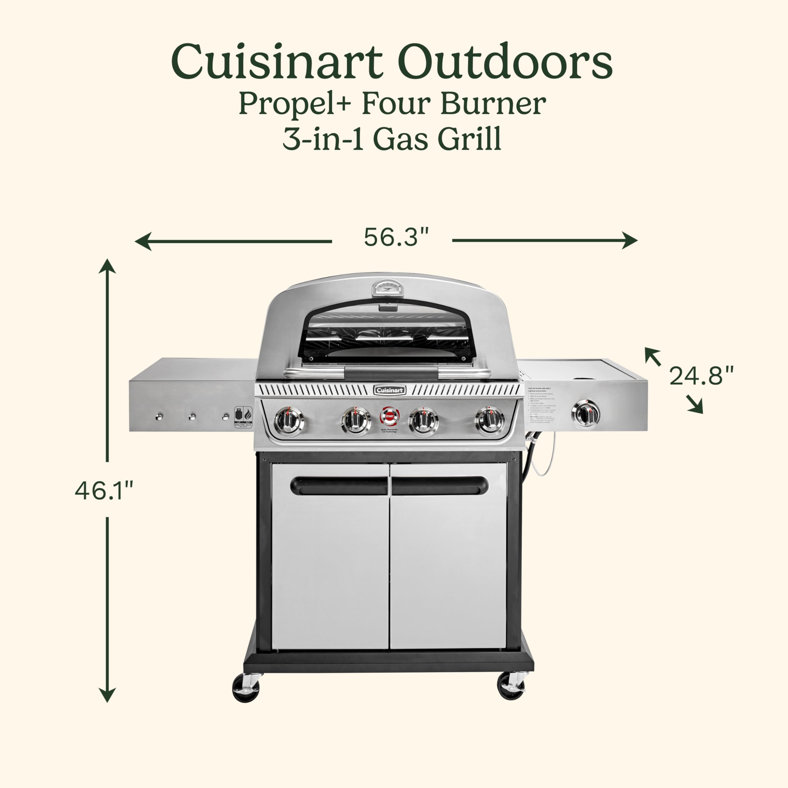 The Cuisinart Propel+ 4 Burner 3-in-1 Gas Grill delivers powerful performance with endless possibilities. Our Thermo-Flo™ Technology ensures even, natural convection heating, while the electronic ignition gets you cooking fast. The grill features 477 sq. in. of main cooking space plus a 138 sq. in. warming rack, with 44,000 BTUs across four burners—rivaling full-size five-burner grills. The side table offers 176 sq. in. of griddle space with an 11,000 BTU XL burner. The cast iron griddle plate retains heat, reaching 600°F for restaurant-quality sears. Dual-functionality lets you use the grill and griddle simultaneously. The pizza oven includes a 15" cordierite stone for even heat and perfect crusts. Pizza rack’s slightly raised design ensures 360° heat circulation. The dual-hinged EZ-Lift lid features a drop-down tempered glass pizza door for minimal heat loss and easy access. Integrated storage keeps accessories organized. The grill is also dual-fuel capable with a natural gas conversion kit (sold separately).