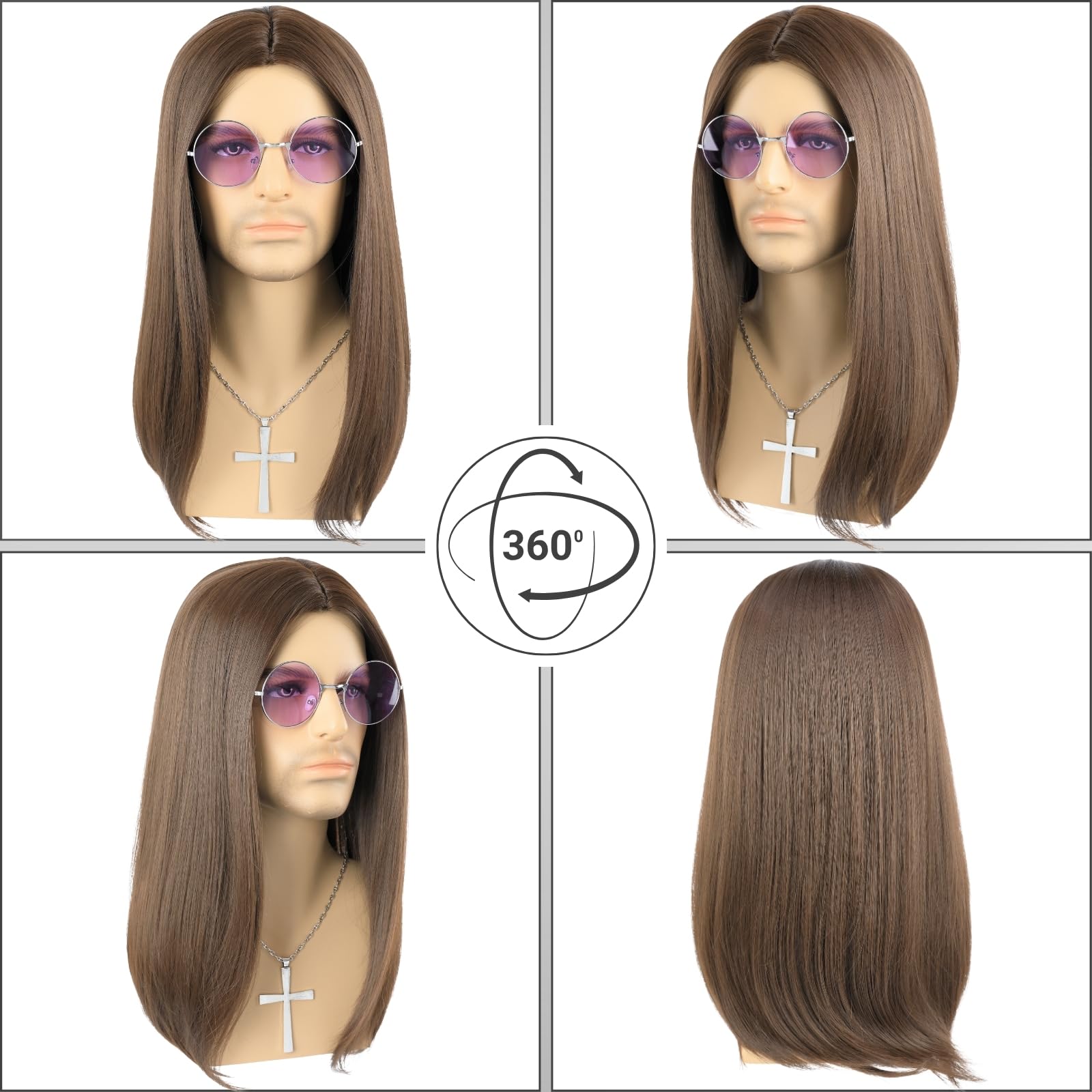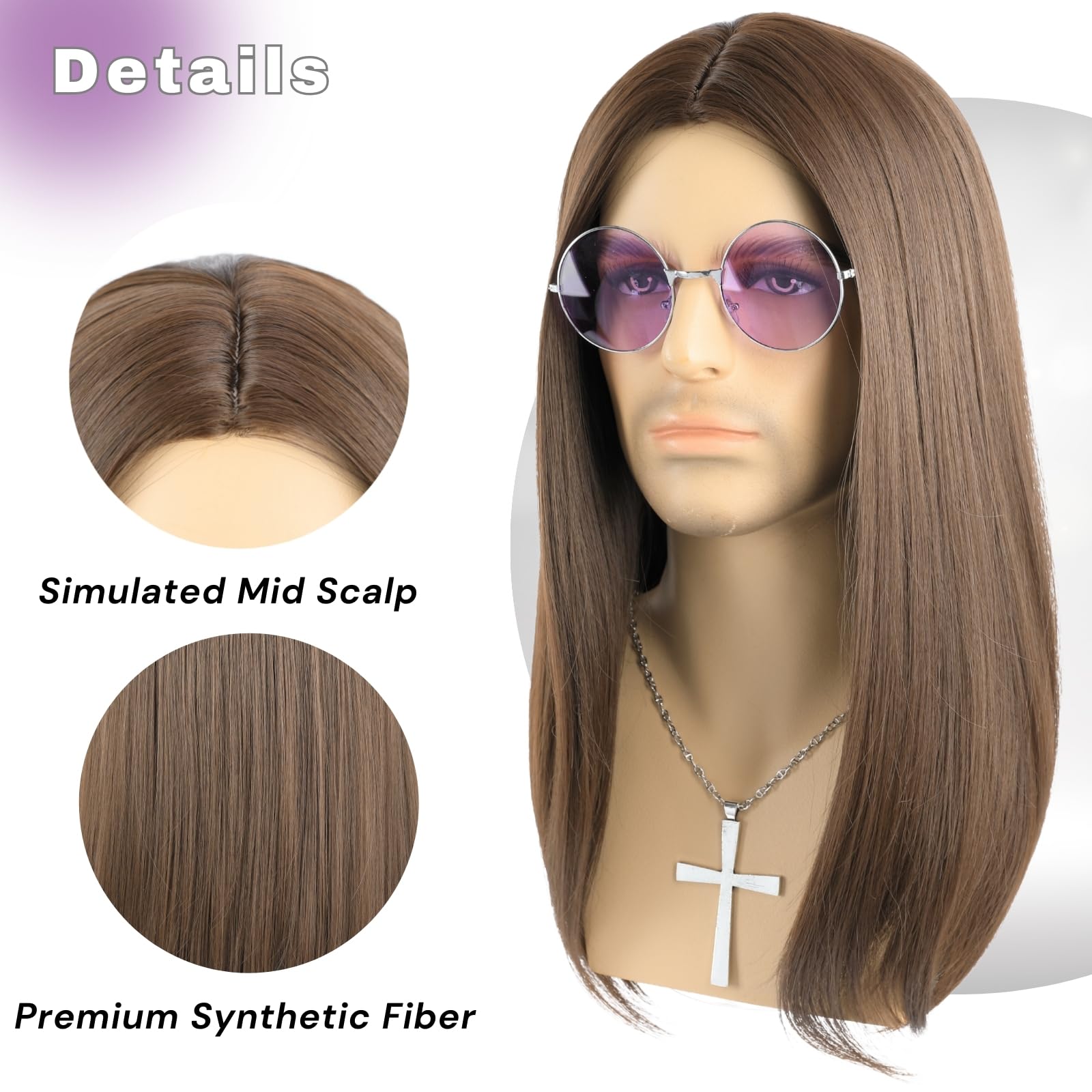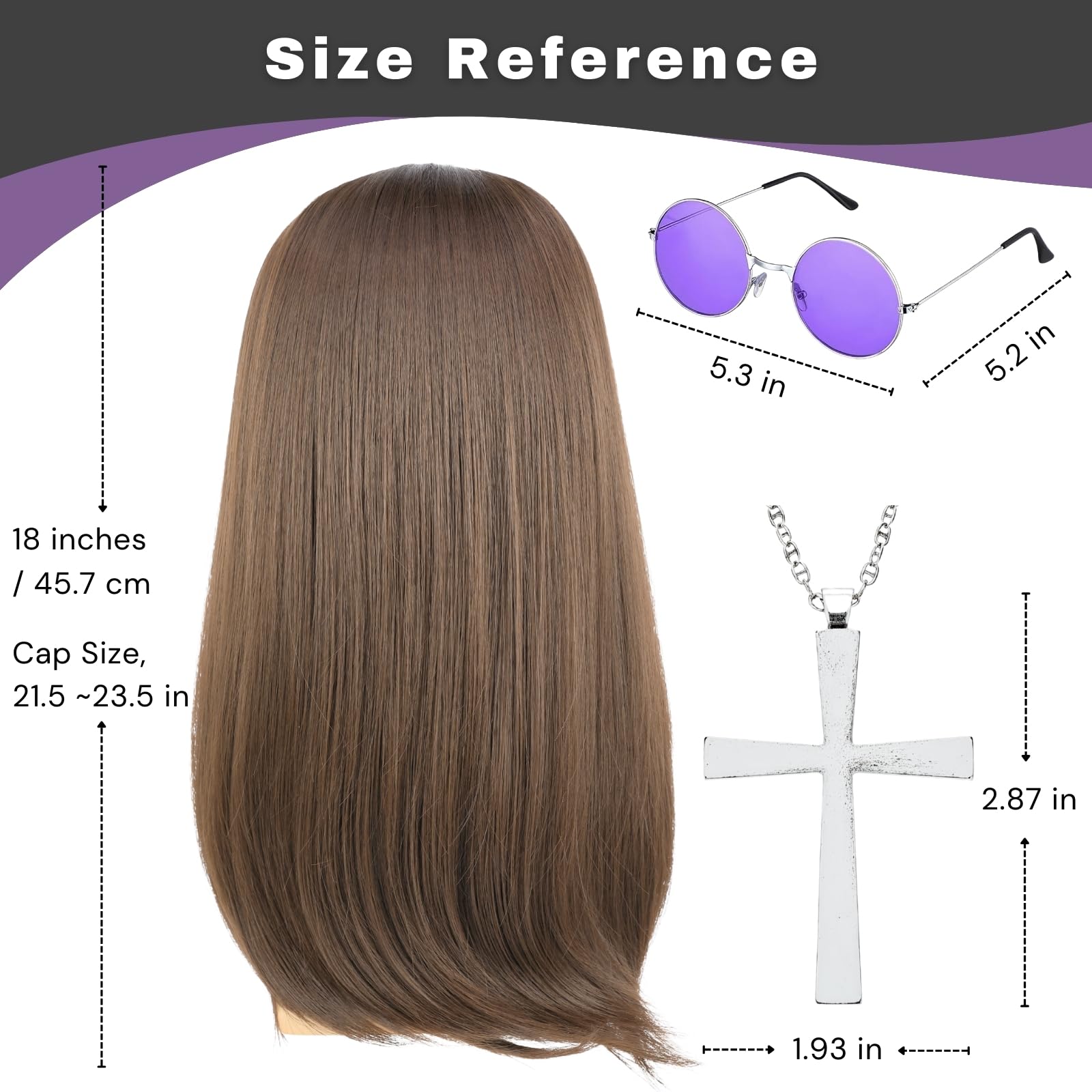 Basic Information Hair Color: Black and Brown Color Hair Length: 21 inches Hair Material: 100% high-quality heat resistant synthetic fiber Cap Size: medium net size, average 22.8”, can be adjusted to 22"-23" Package included: 1 wig + 1 glasses + 1 Cross pendant Necklace + 1 wig cap Feature: 80s rockers singer cosplay