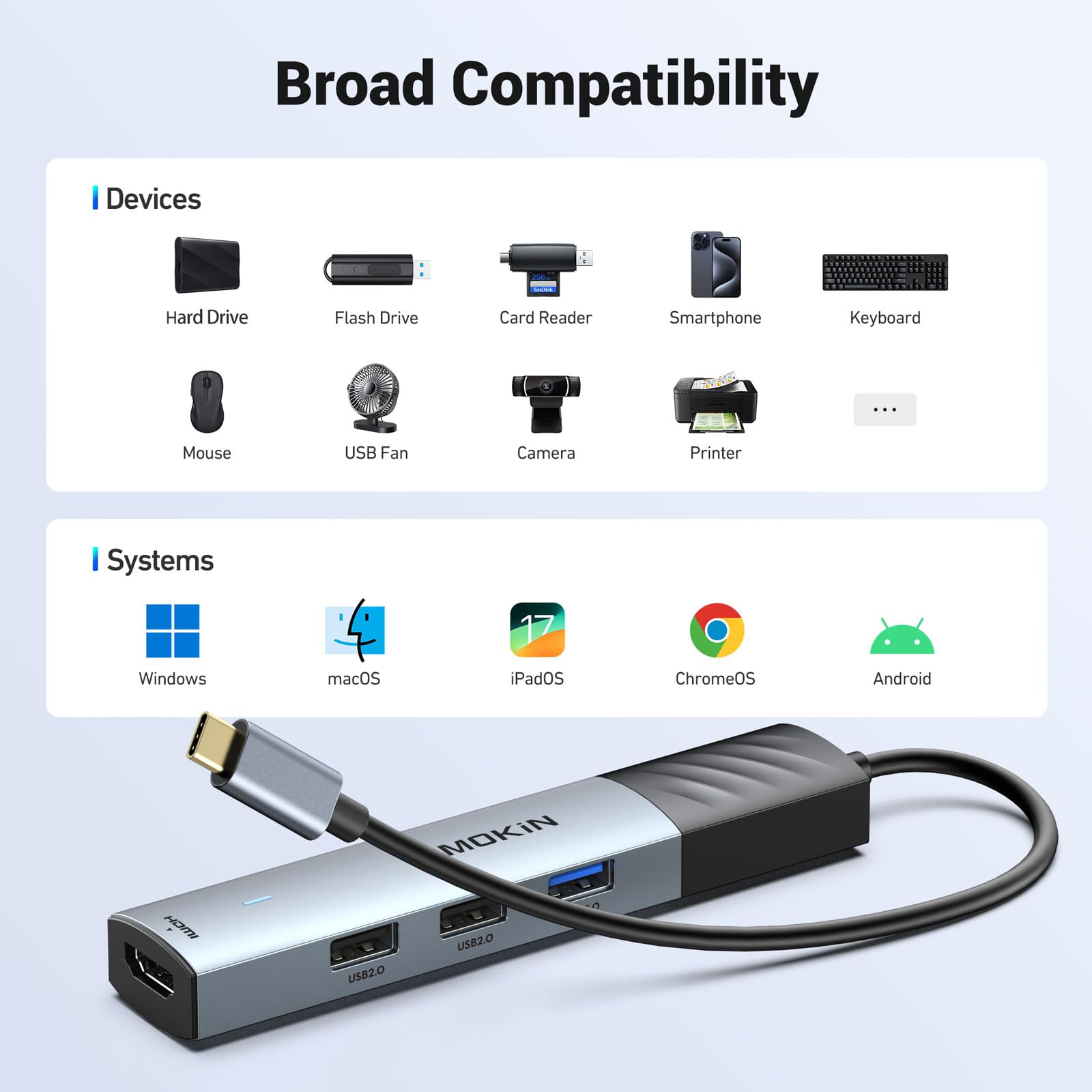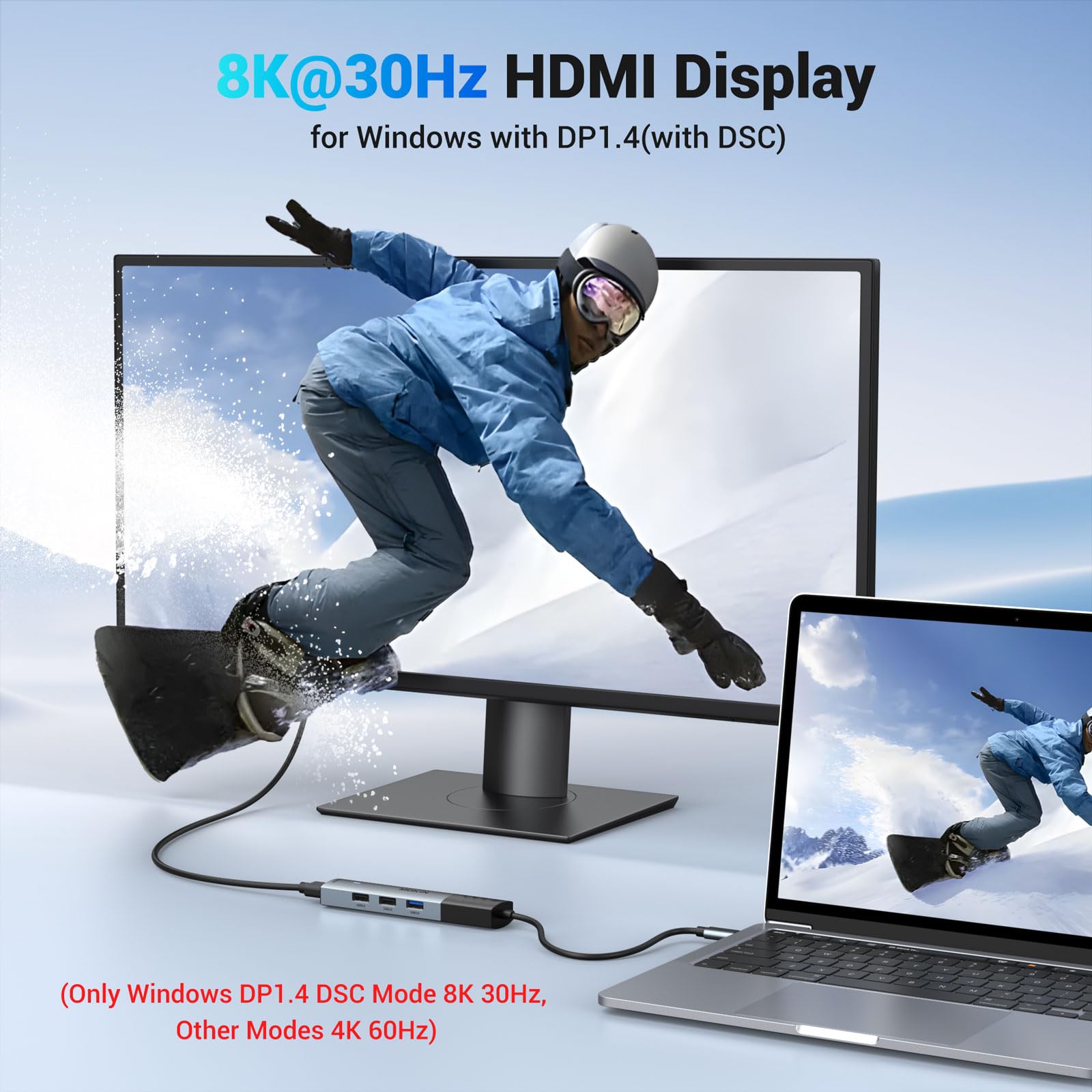 5-in-1 USB C Hub: USB C to HDMI Adapter equipped with 1*8K@30Hz HDMI port, 3*USB A ports, 1*100W PD, Works well with most USB-C devices, like MacBook Pro, MacBook Air, MacBook M1, M2, iMac, iPad Pro, iPhone 15 Pro/Pro Max, Dell XPS Surface, HP and other USB-C port devices(Only Windows DP1.4 DSC Mode Can 8K 30Hz, Other Modes are 4K 60Hz)
