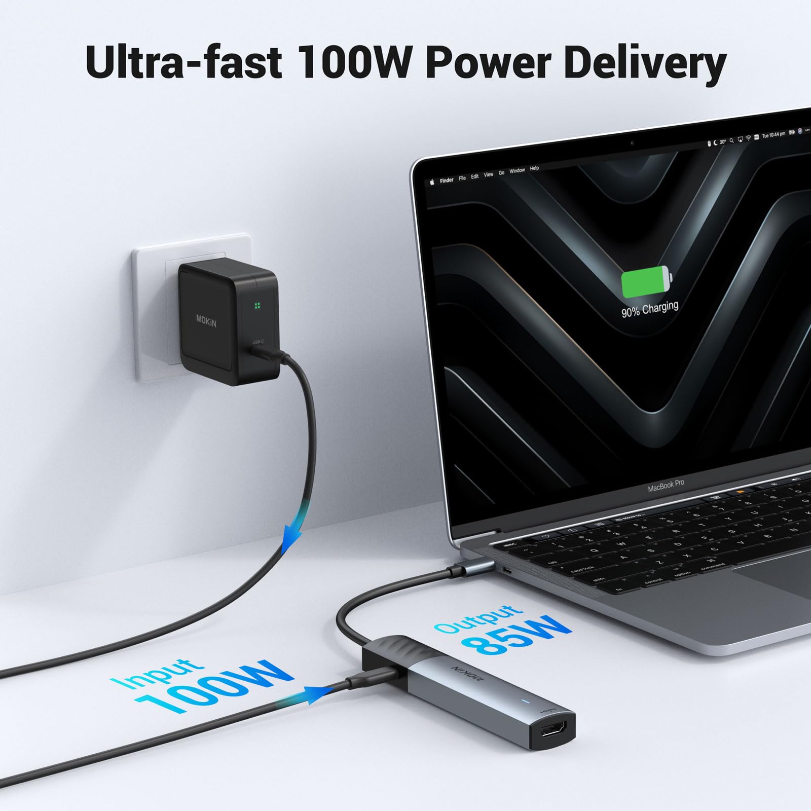 USB C Data & 100W PD: Mac HDMI Adapter comes with PD port supports 100W power in; Power out (charging) is limited to 87W for safety, continuously charging your laptop while using, 13W is reserved for other interface operations. When demonstrating screencasting or transferring files, please do not plug or unplug the PD charger to avoid loss of images or data.