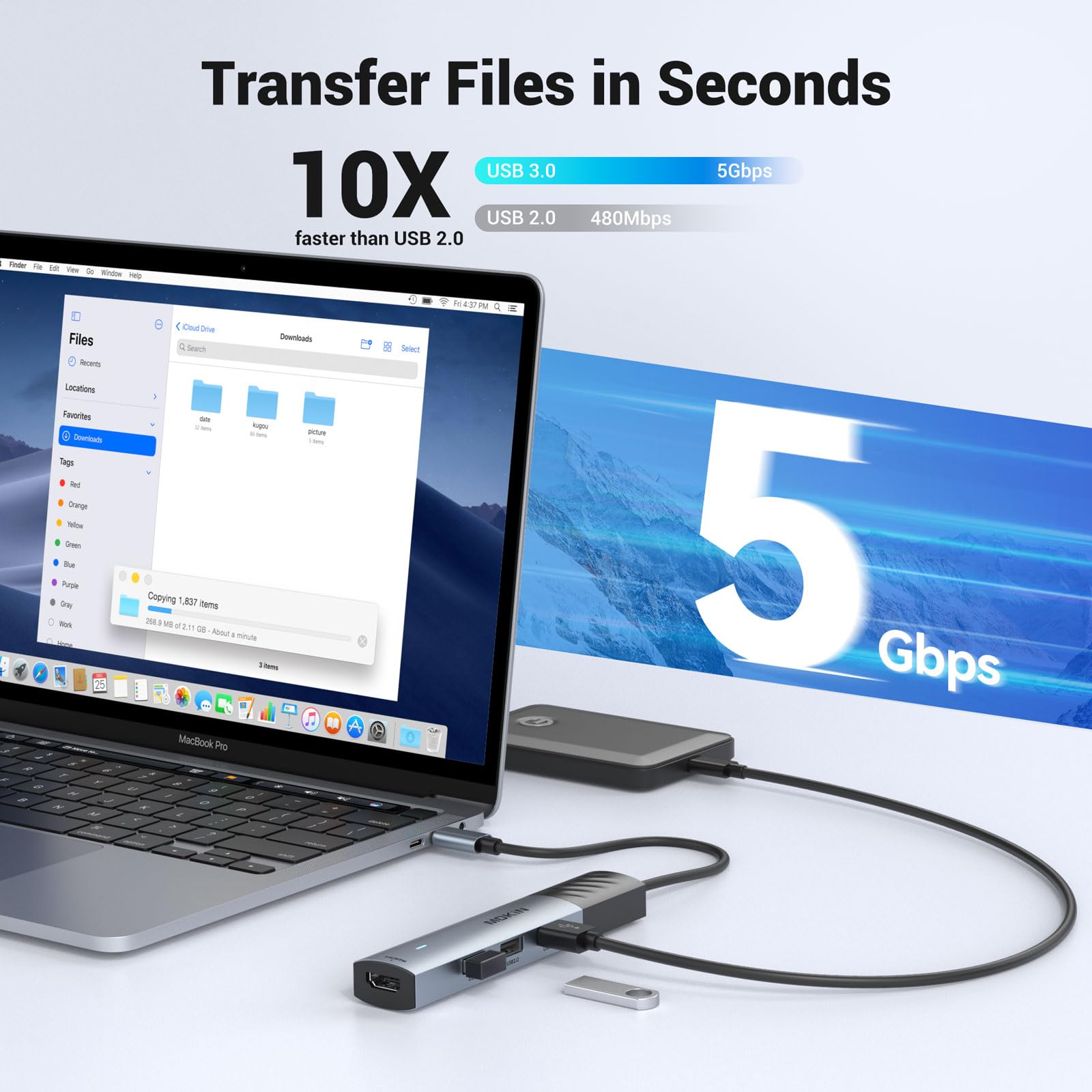 Transfer Files in Seconds: USB C Hub Multiport Adapters transfer files and from your laptop at speeds up to 5 Gbps with USB A 3.0 port,down compatible with USB A 2.0 and below. Extra 2 USB A 2.0 ports are perfectly for your keyboards and mouse
