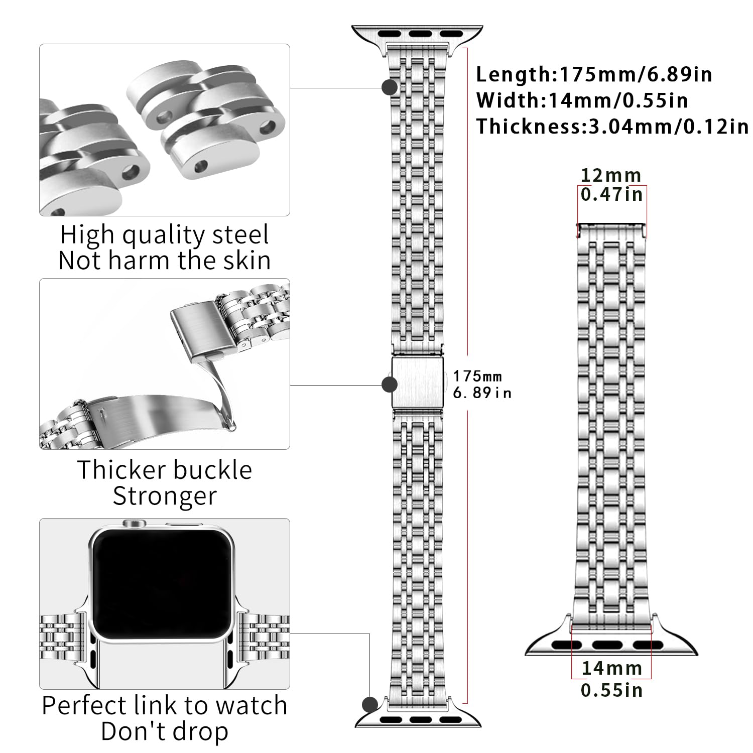 [About the band size] This bands size is: 6.89*0.55*0.12inch, weight is 1.76 once, Lightweight design will not burden your wrist, If you are looking for a slim and nice watch strap to match your watch, this strap is a great choice for you.