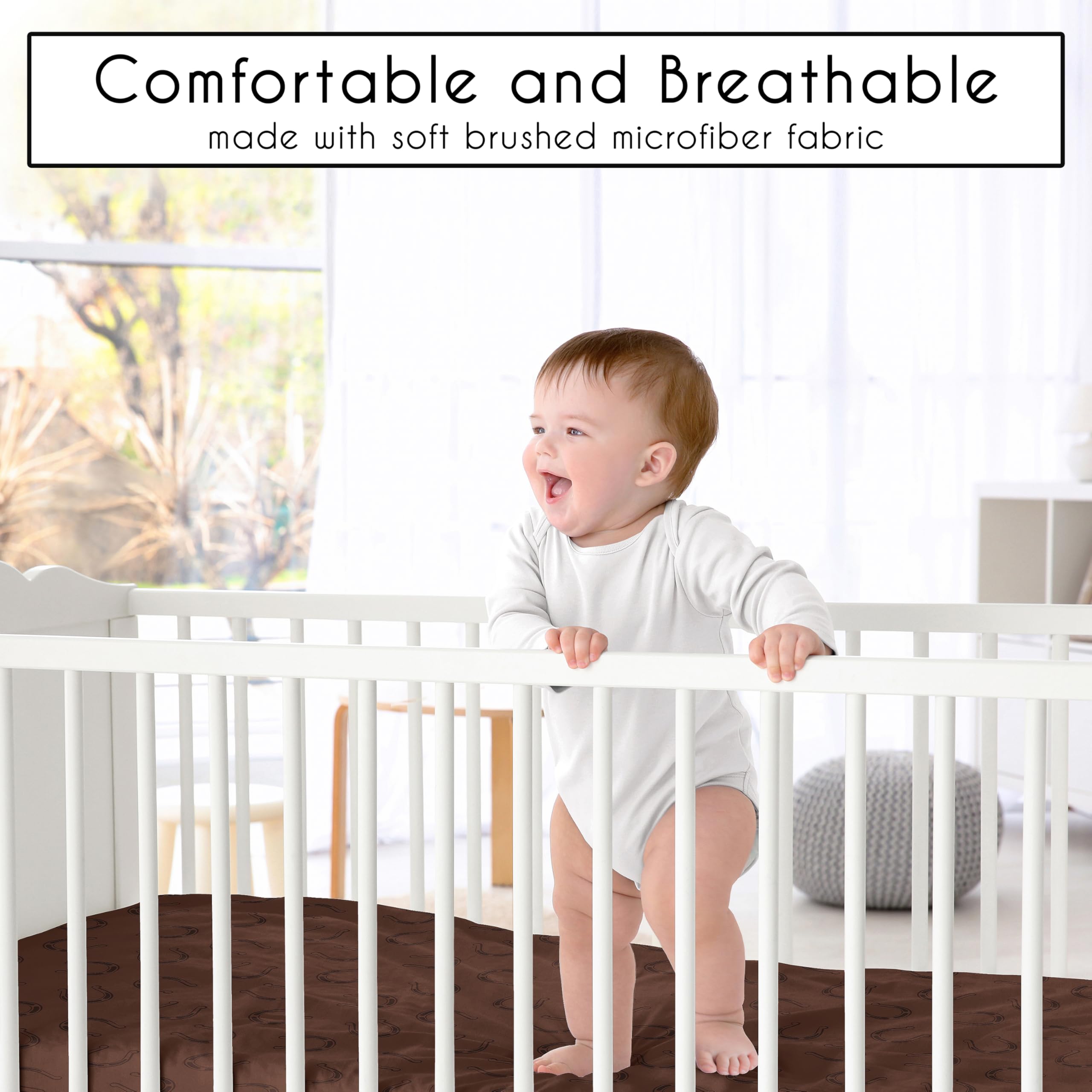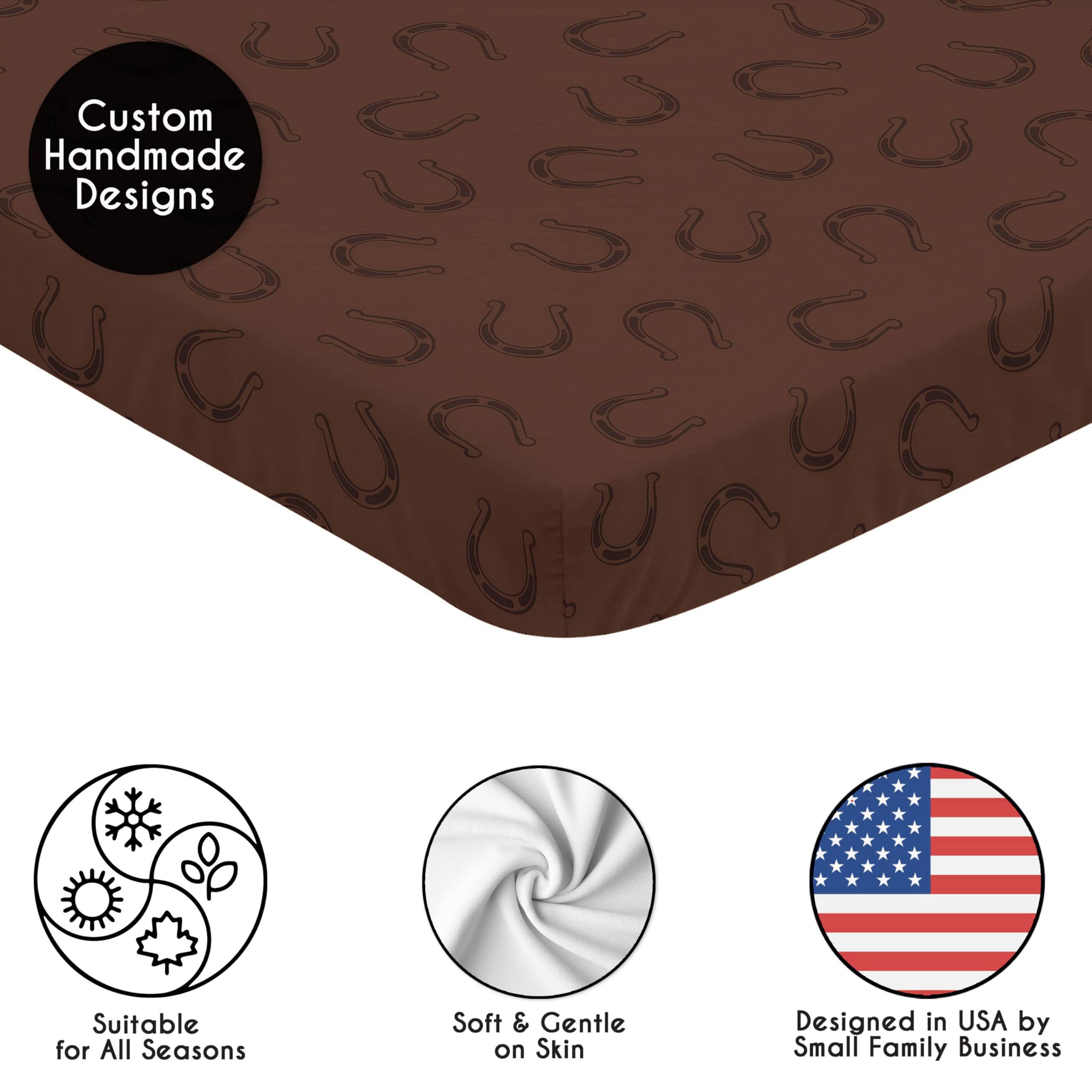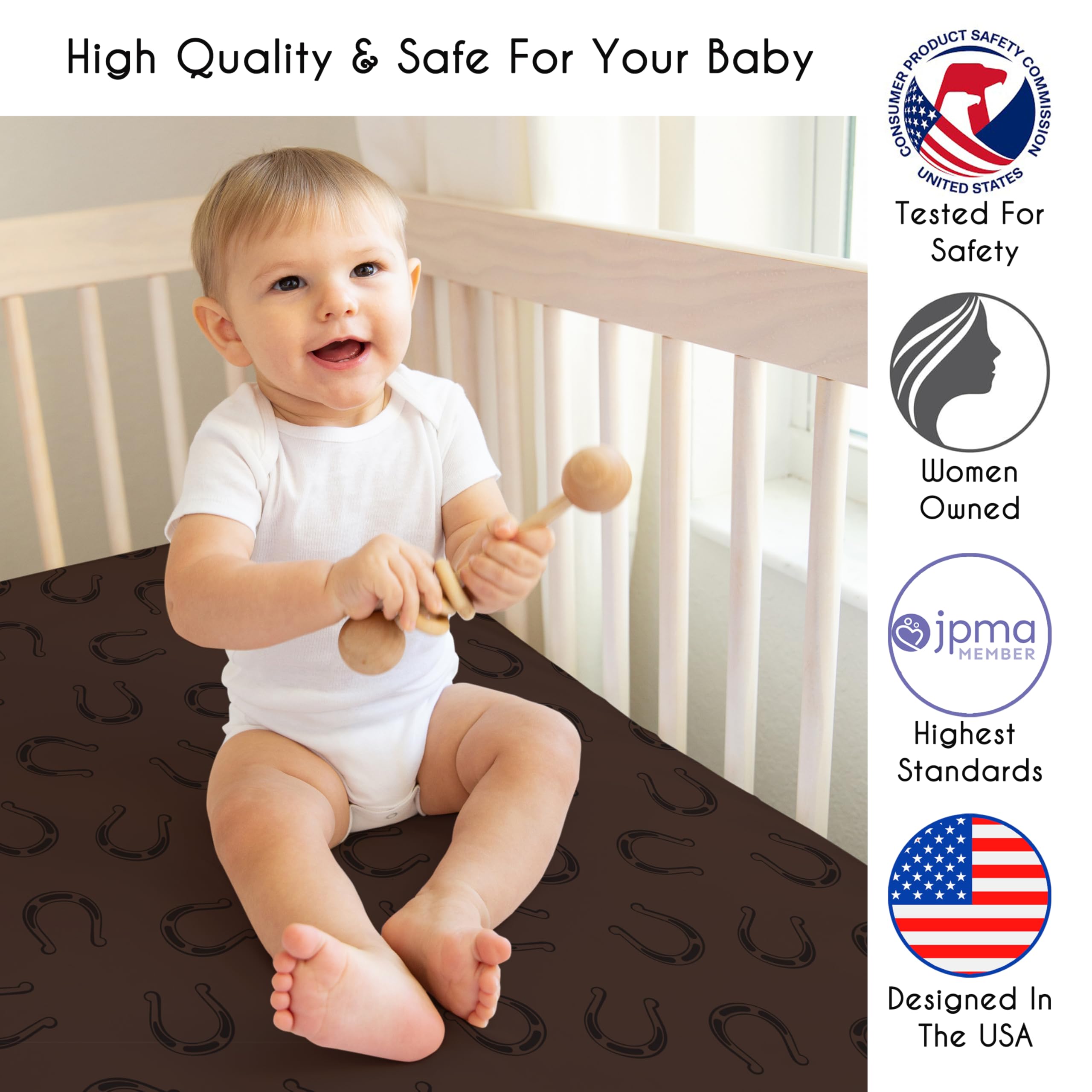 SNUG FIT: Includes (1) Mini Crib Mattress Sheet 24in. x 38in. x 5in. Our newborn mini crib sheets fit snugly, with premium elastic sewn around the entire bottom edge for a secure fit on most smaller size cribs, play yards, & portable cribs to reduce shifting & bunching. This brushed microfiber pack and play sheet features an exclusive design of tonal chocolate brown horseshoe print for the western southern charm Wild West Collection & is gentle on delicate skin. WILL NOT FIT STANDARD SIZE CRIBS.