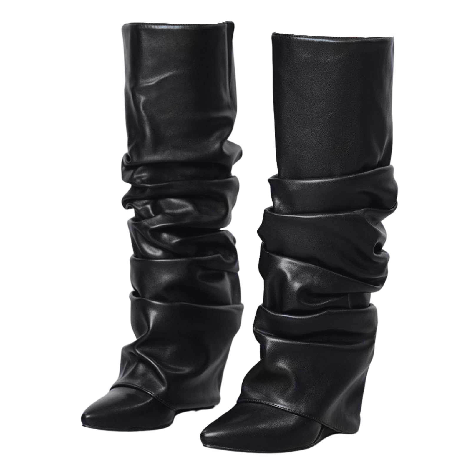👢Team these point toe fold over wedge heeled knee high boots with any weekend look for an instant update.