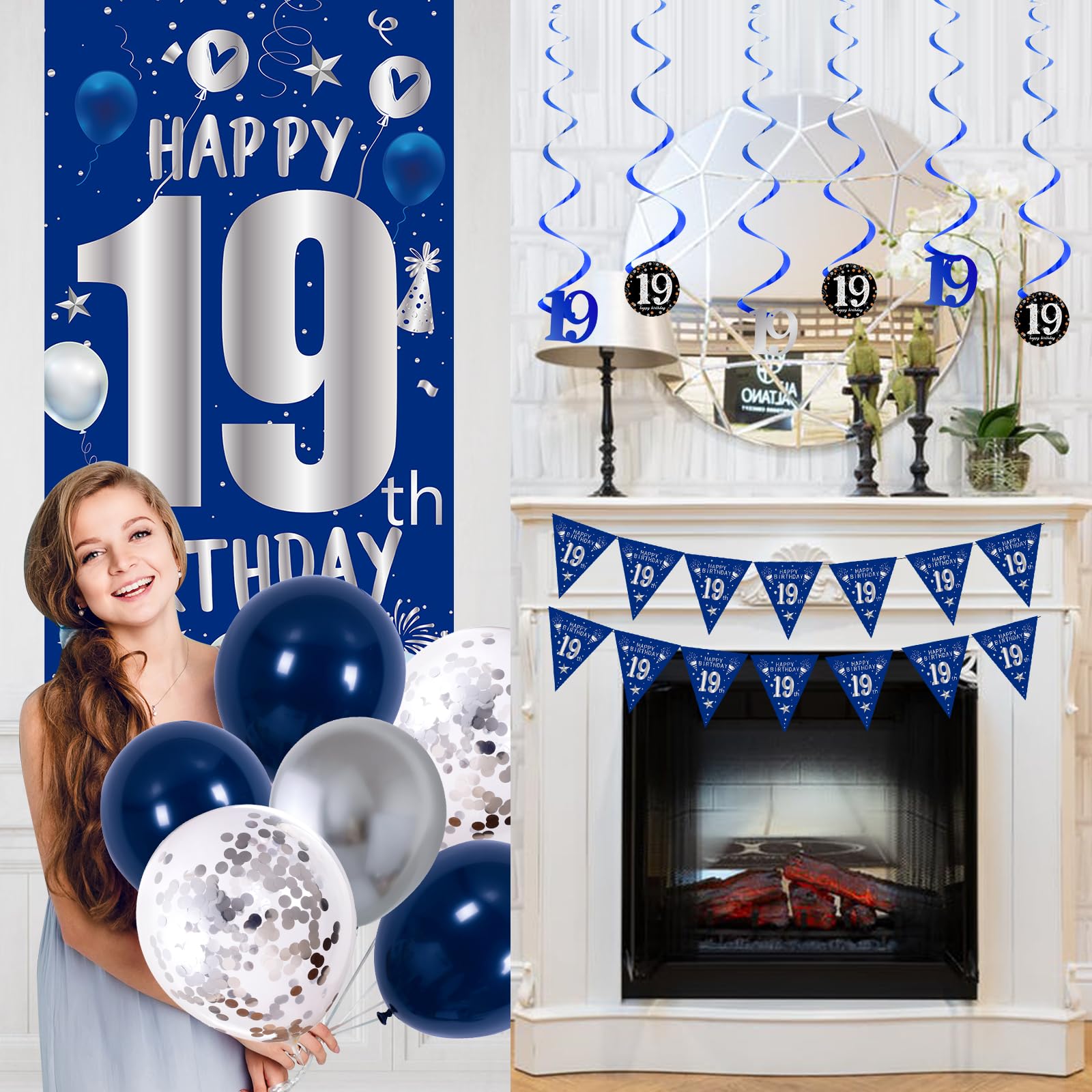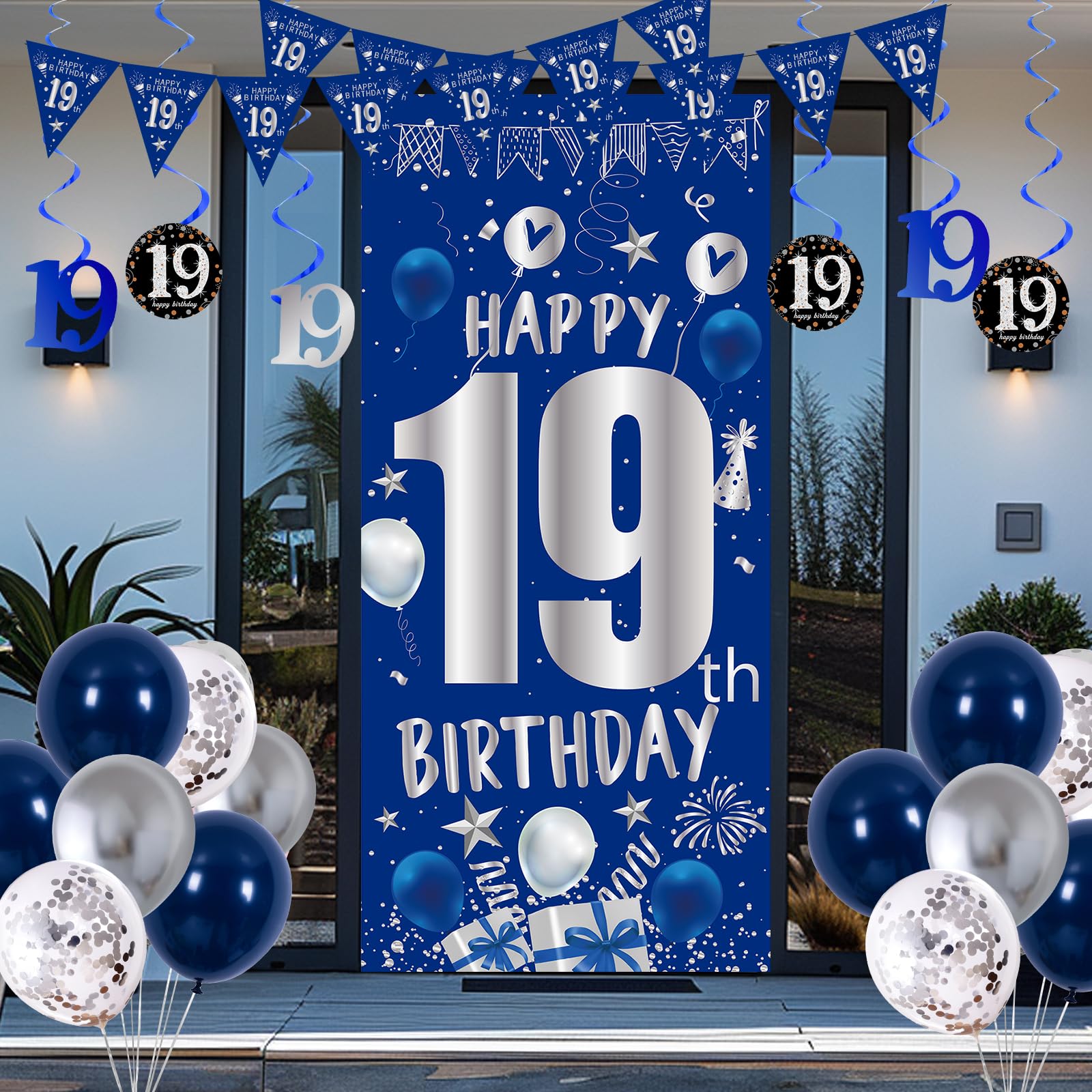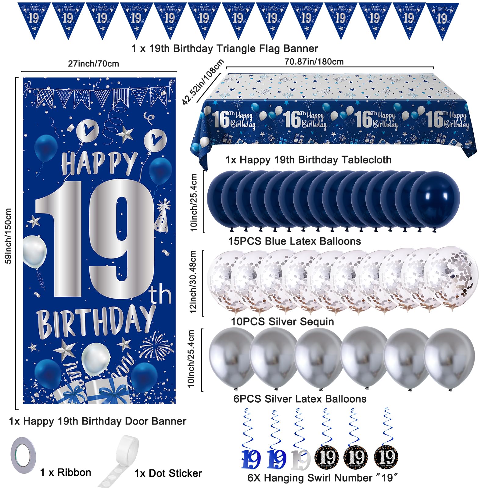 đăHappy 19th Birthday Decorations Kit for BoysăThis blue and silver happy 19th birthday decorations party supplies is designed for 19 year old men boys and girls birthdays; Package List: 15pcs navy blue latex balloons, 6pcs silver balloons, 10pcs silver confetti balloons, 6pcs blue number 19 hanging swirls, 1pcs blue silver HAPPY 19th BIRTHDAY door banner, 1pcs 19th birthday tablecloth, 1 set 19th triangle flag banner,1 dot sticker, 1 ribbon