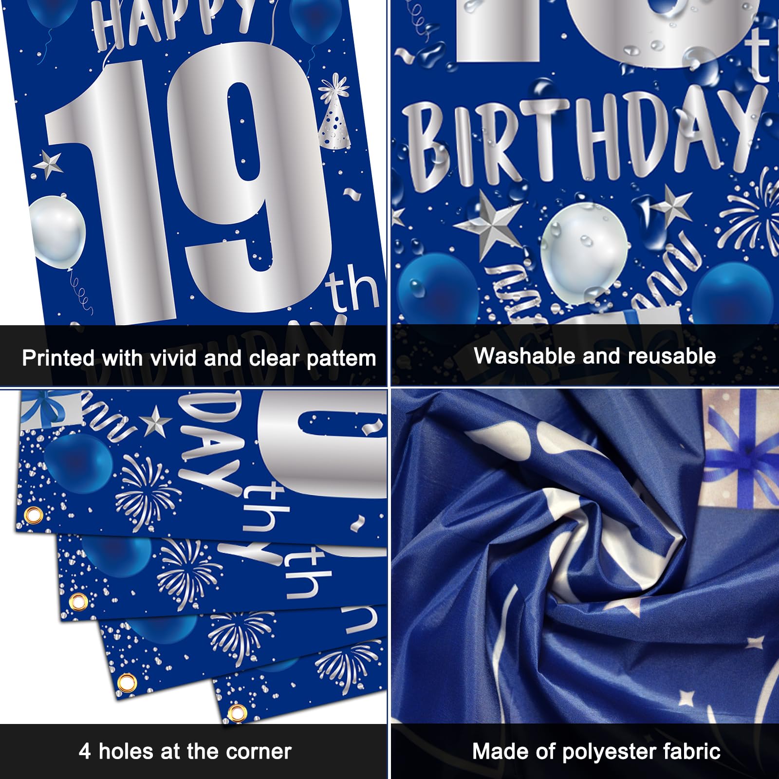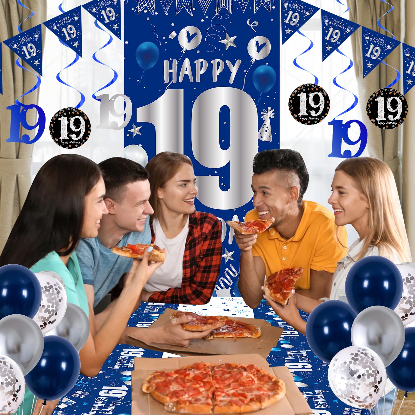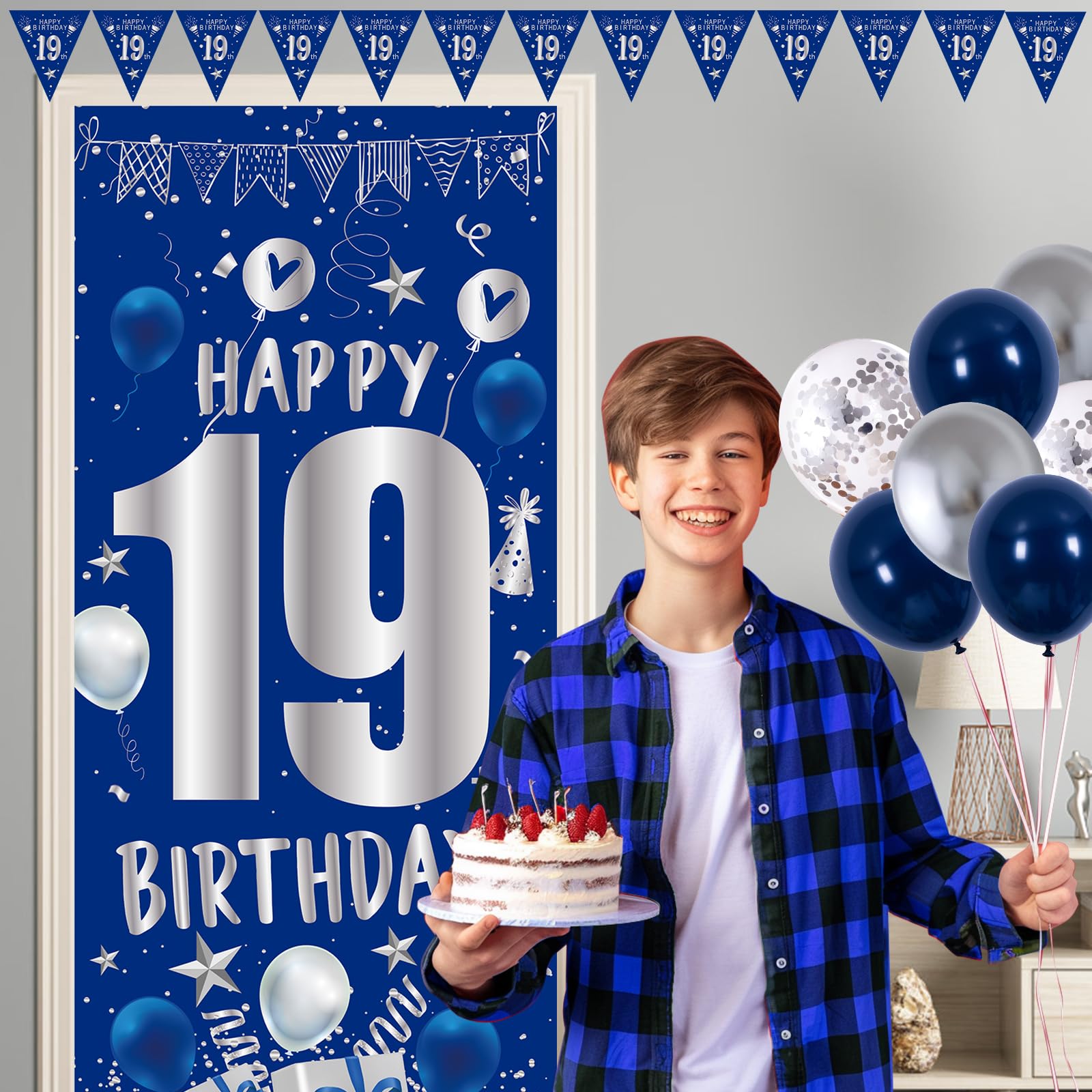 đăHappy 19th Birthday Decorations Kit for BoysăThis blue and silver happy 19th birthday decorations party supplies is designed for 19 year old men boys and girls birthdays; Package List: 15pcs navy blue latex balloons, 6pcs silver balloons, 10pcs silver confetti balloons, 6pcs blue number 19 hanging swirls, 1pcs blue silver HAPPY 19th BIRTHDAY door banner, 1pcs 19th birthday tablecloth, 1 set 19th triangle flag banner,1 dot sticker, 1 ribbon