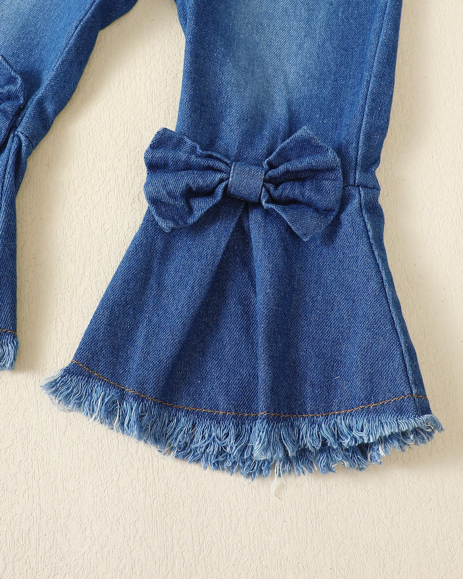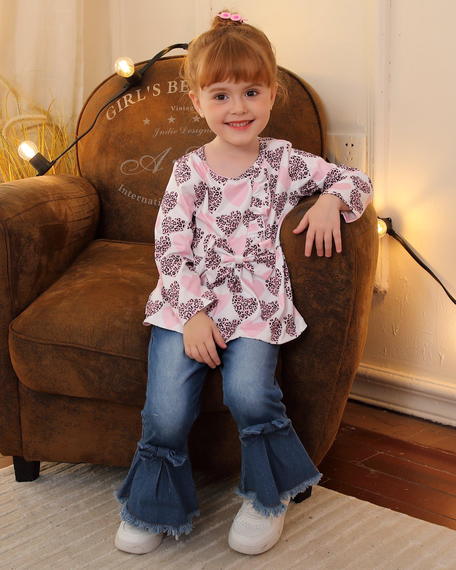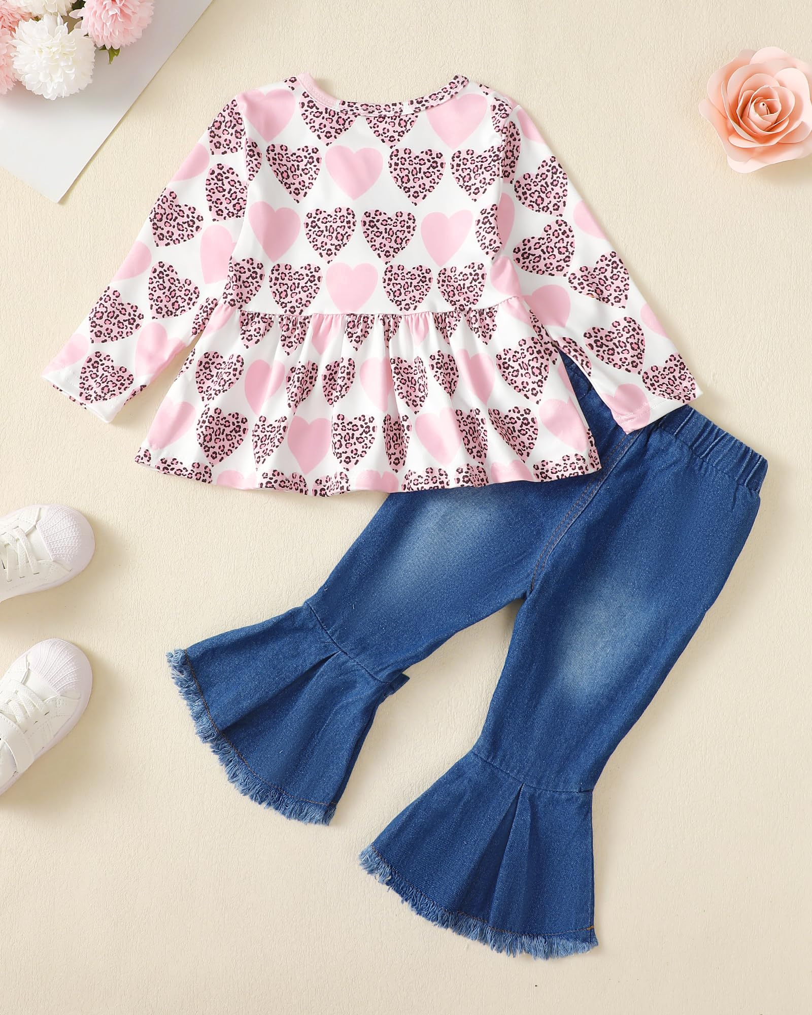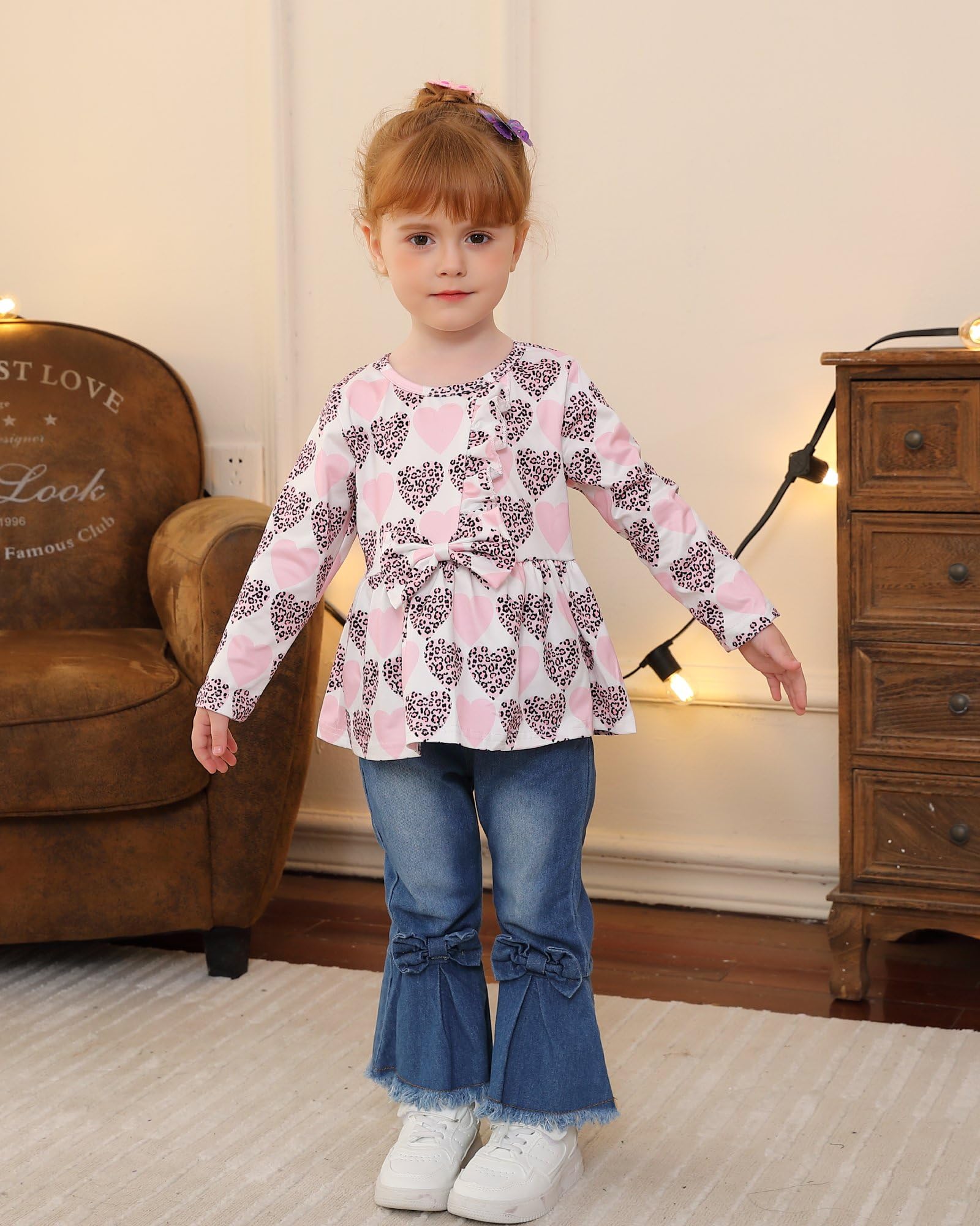 Adorable Girl Outfit: This stylish toddler clothing set features a cute long-sleeve top with bowknot and a pair of trendy ruffle-trimmed denim bell bottom jeans. Adorable heart/floral printed little girl clothes, sure to get a lot of compliments.