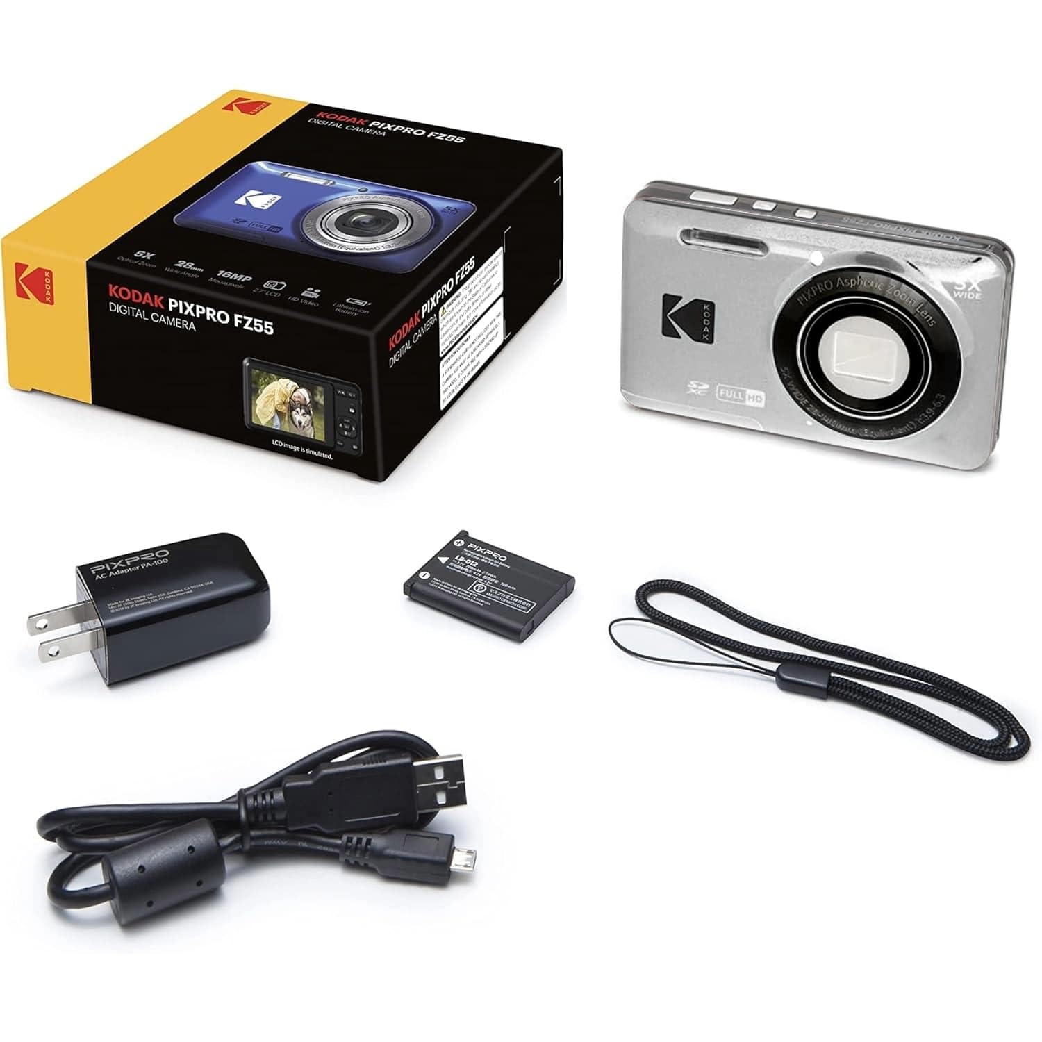 Meet the FZ55, Friendly Zoom from the new KODAK PIXPRO collection of digital cameras. This compact point and shoot is a step up model with rechargeable lithium-ion battery. One-touch HD video, 28mm wide-angle lens and a host of features and shooting modes let you express your inner creativity.