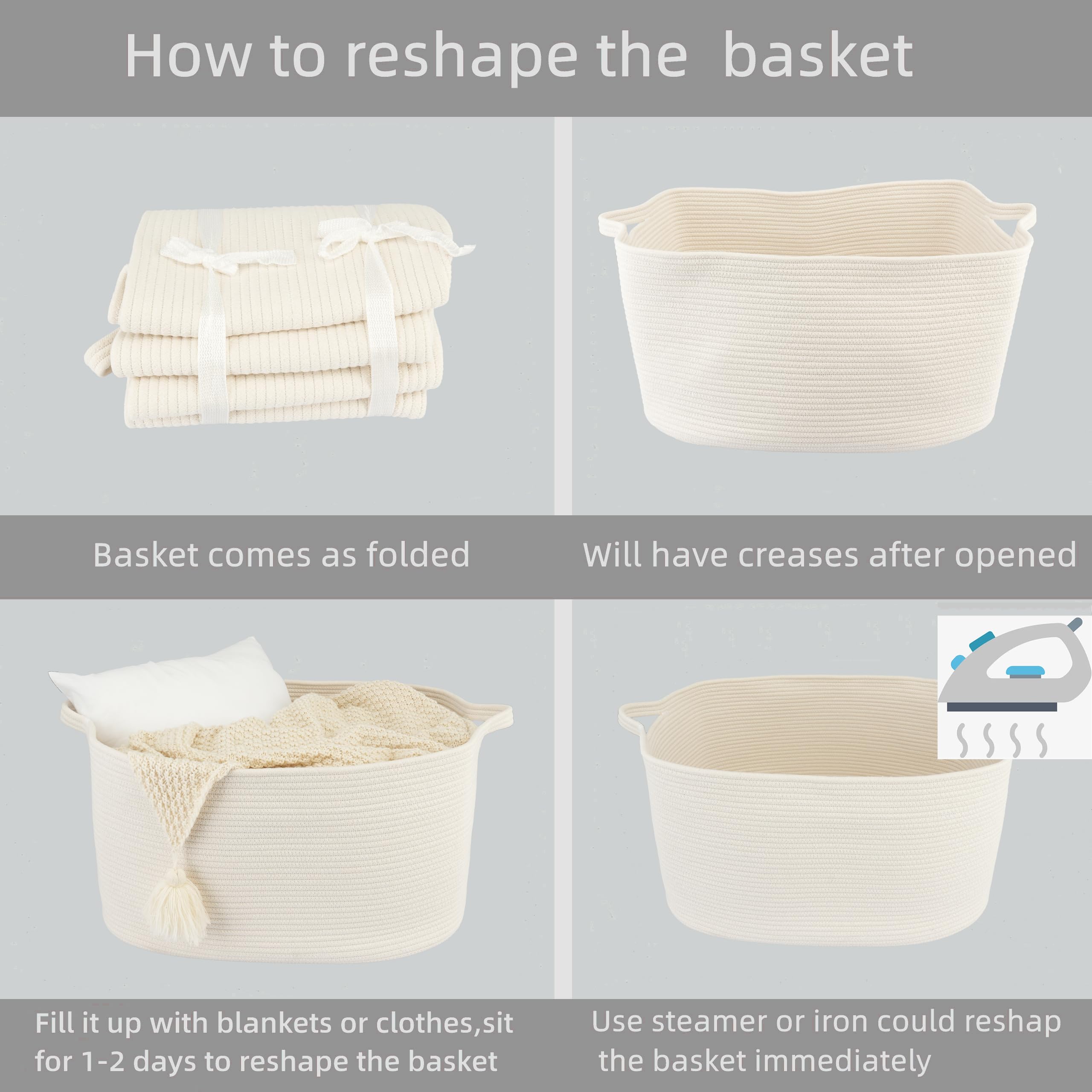 ,Note: Blankets basket comes folded and may have creases. Fully fill the rope basket with towels or clothes and wait for 1-2 days will help reshape the blanket basket. Alternatively, use steam or ironing for a quick reshape the laundry basket. The rope basket is machine washable; simply put it in a wash bag for delicate items and air dry.